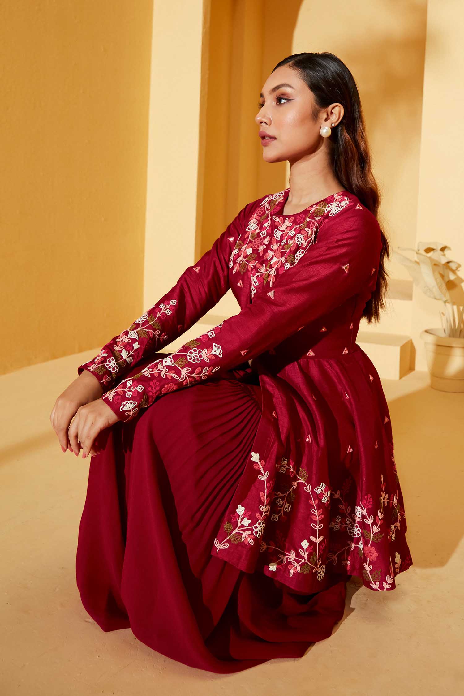 Wine Crop Top and Flared Pants Fusion Set with Sequin Embroidery