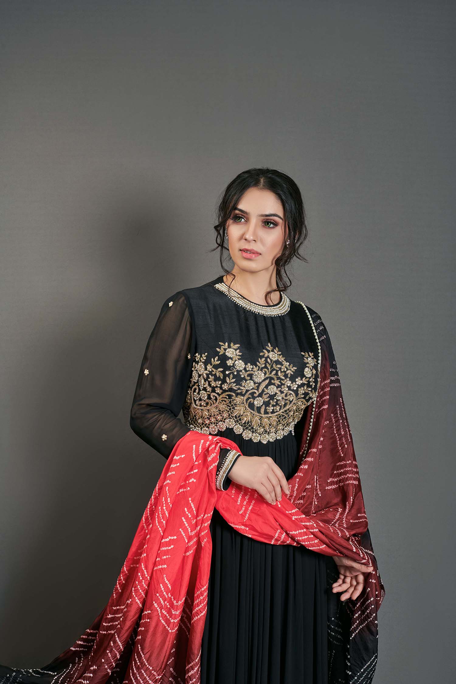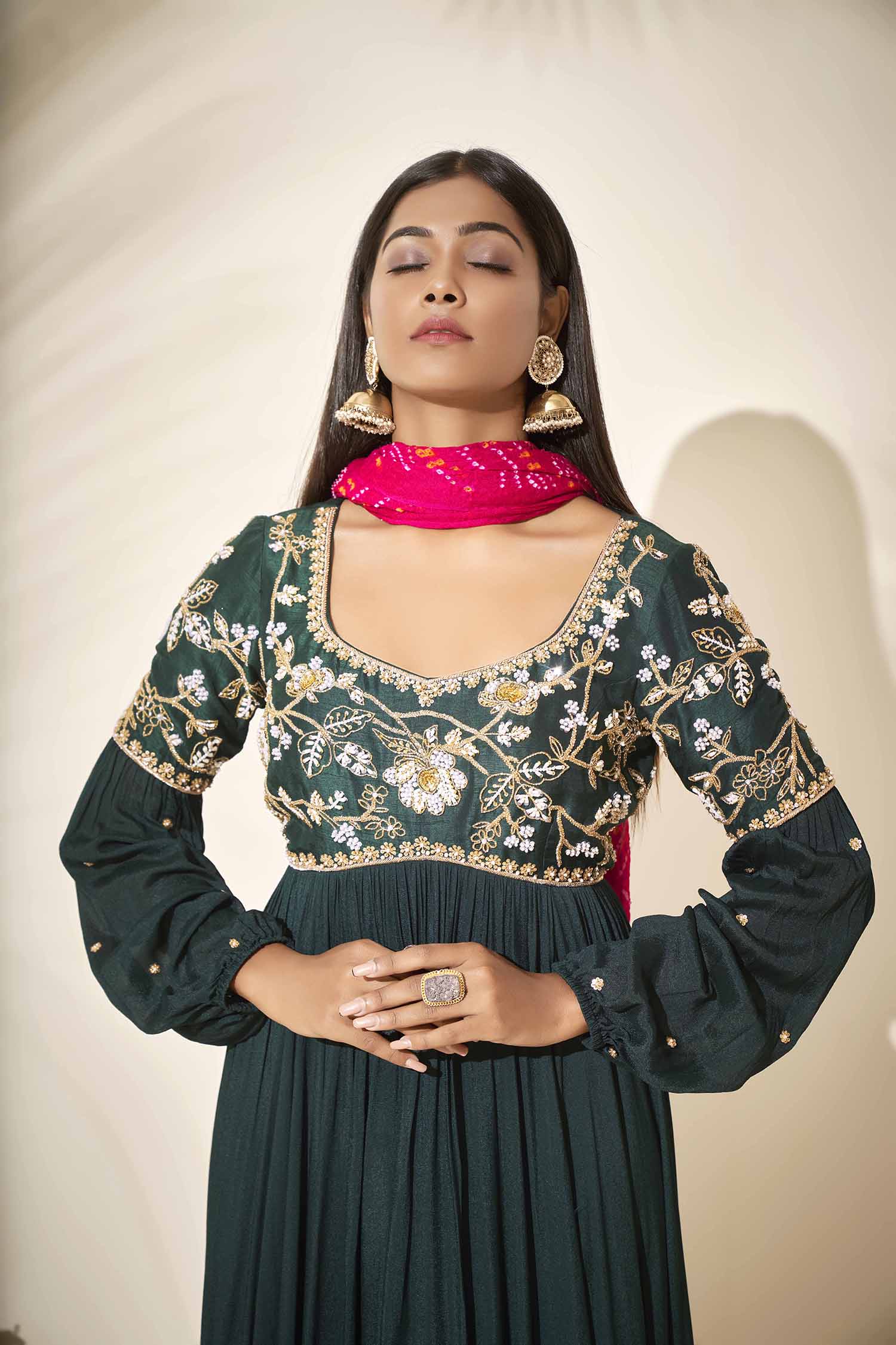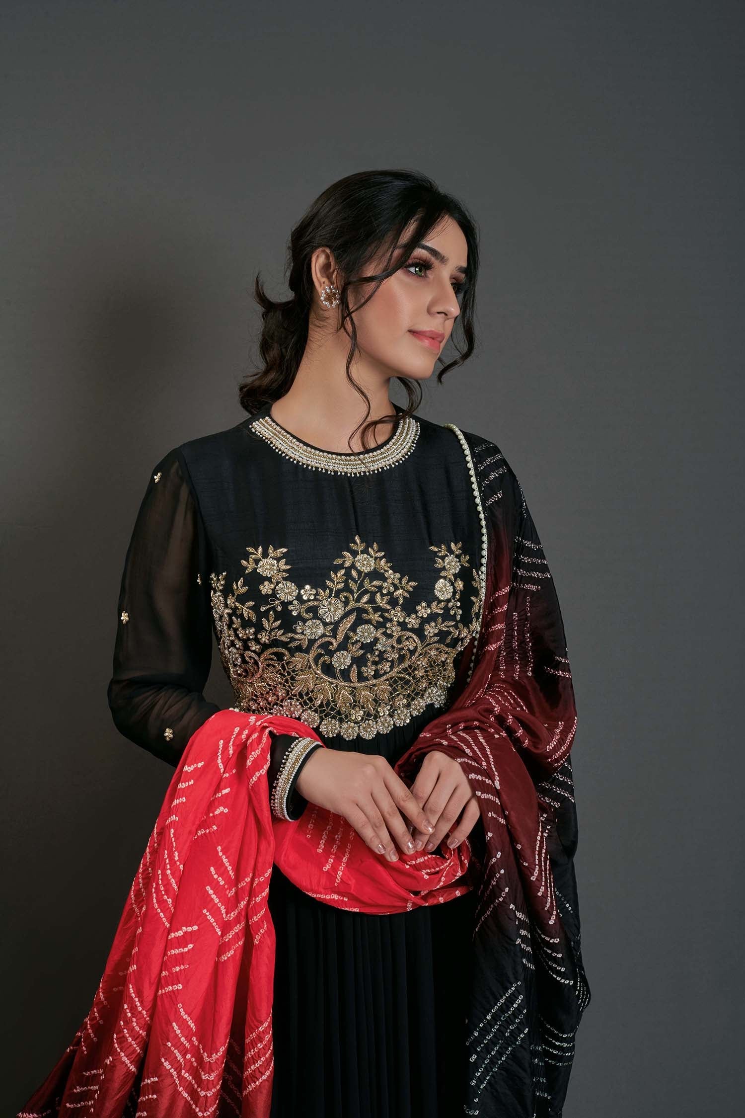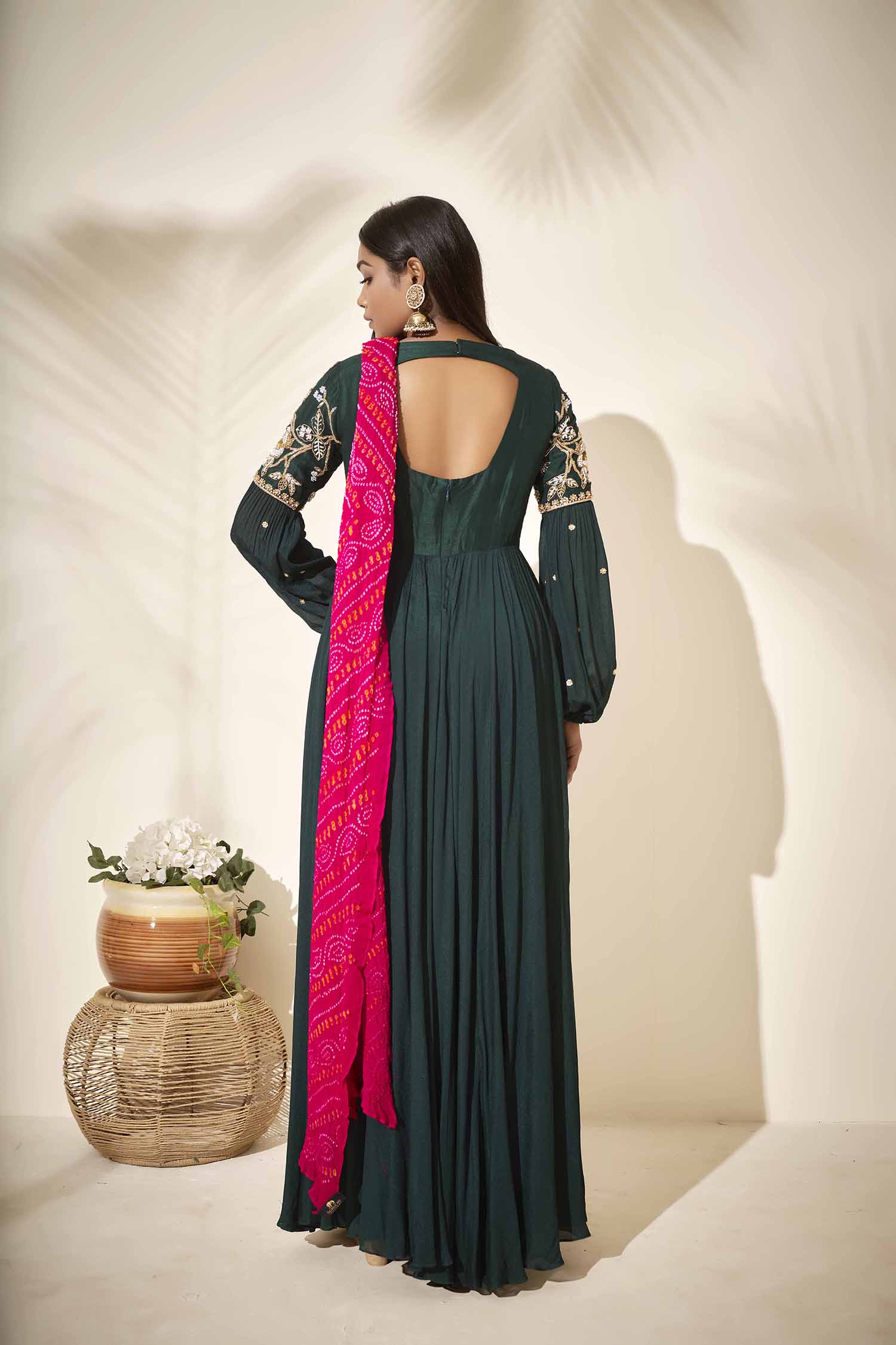Hand Embroidered Anarkali with Elephant Arch Sleeves and Bandhani Dupatta