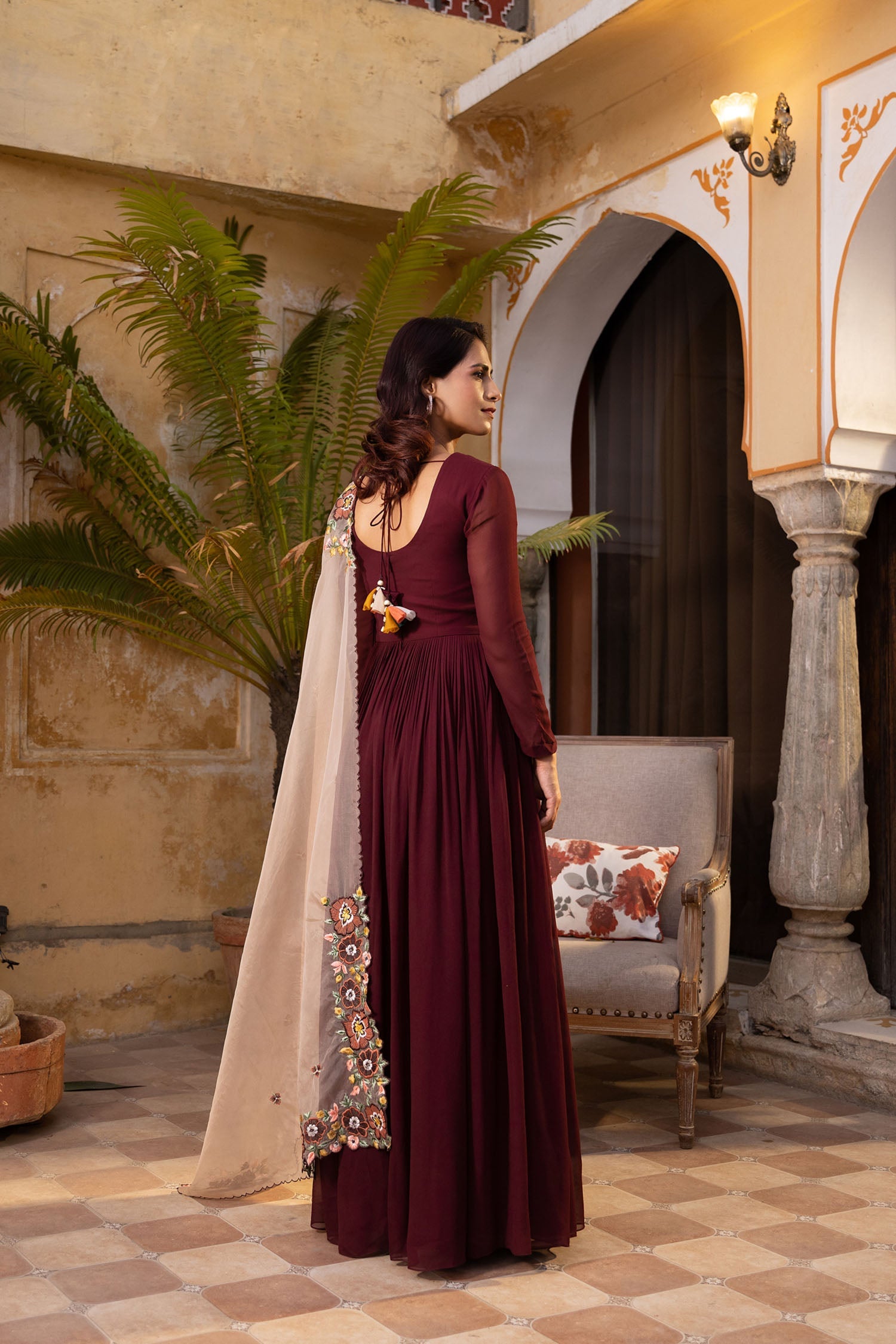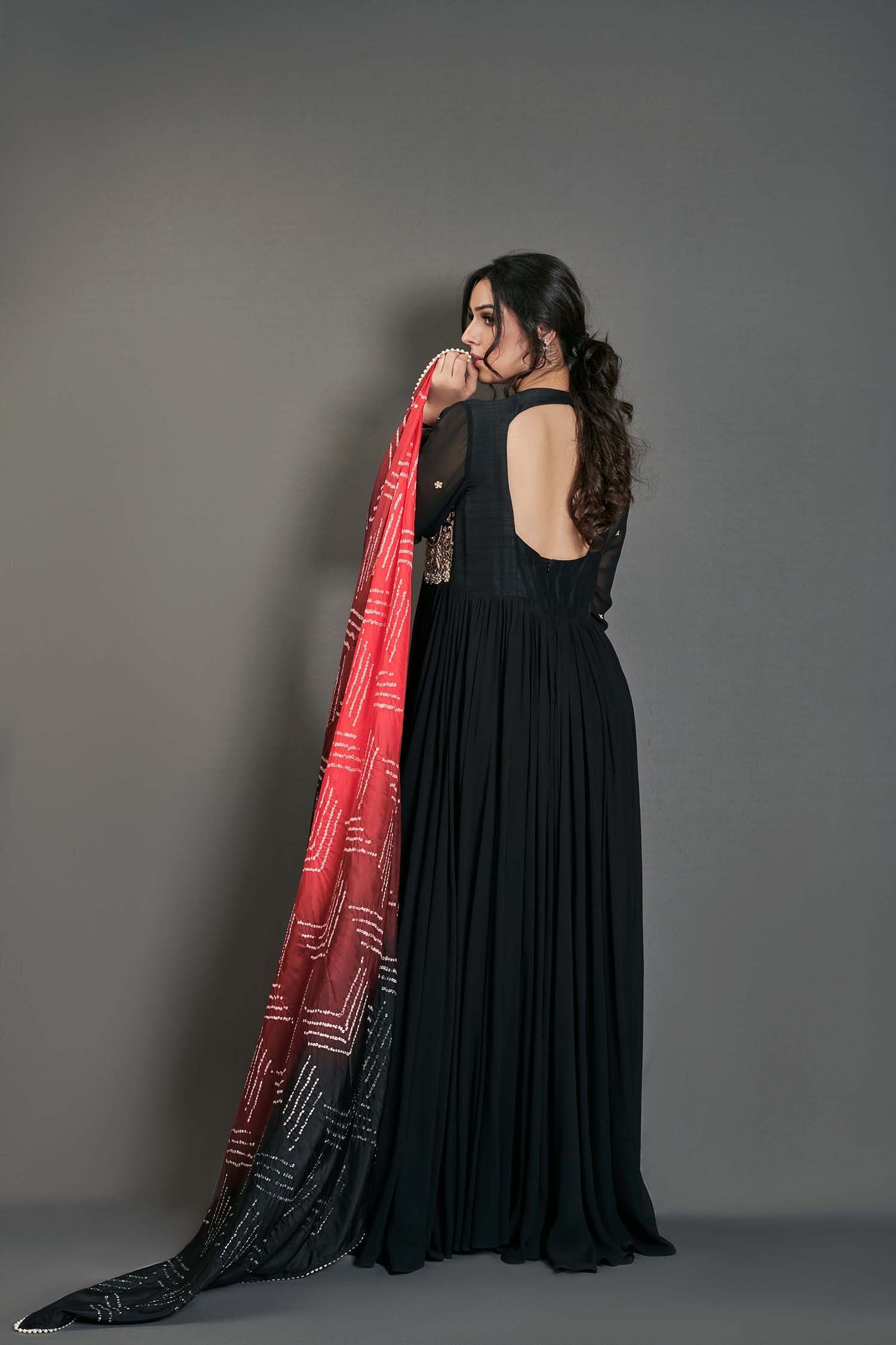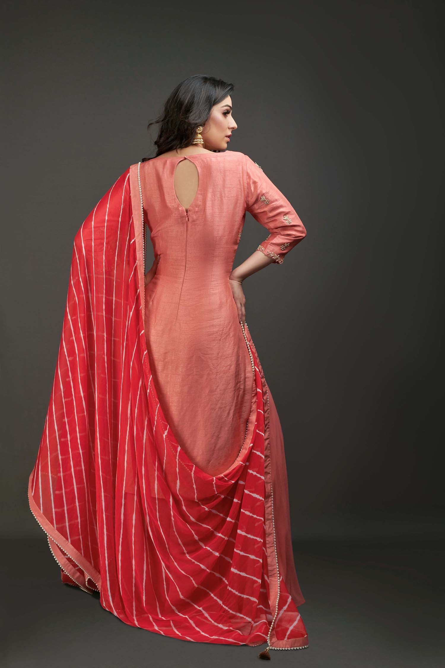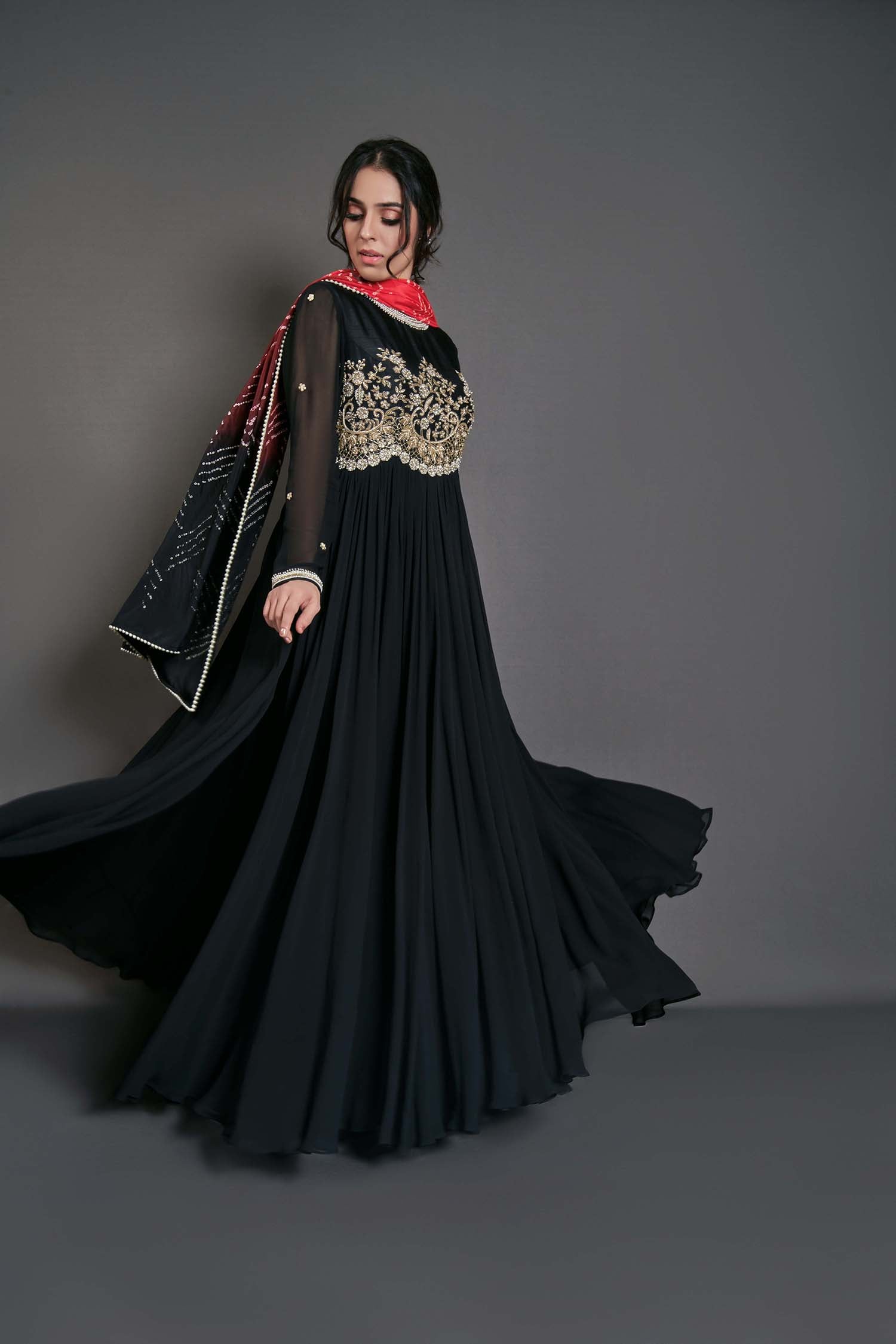 Hand Embroidered Anarkali with Elephant Arch Sleeves and Bandhani Dupatta