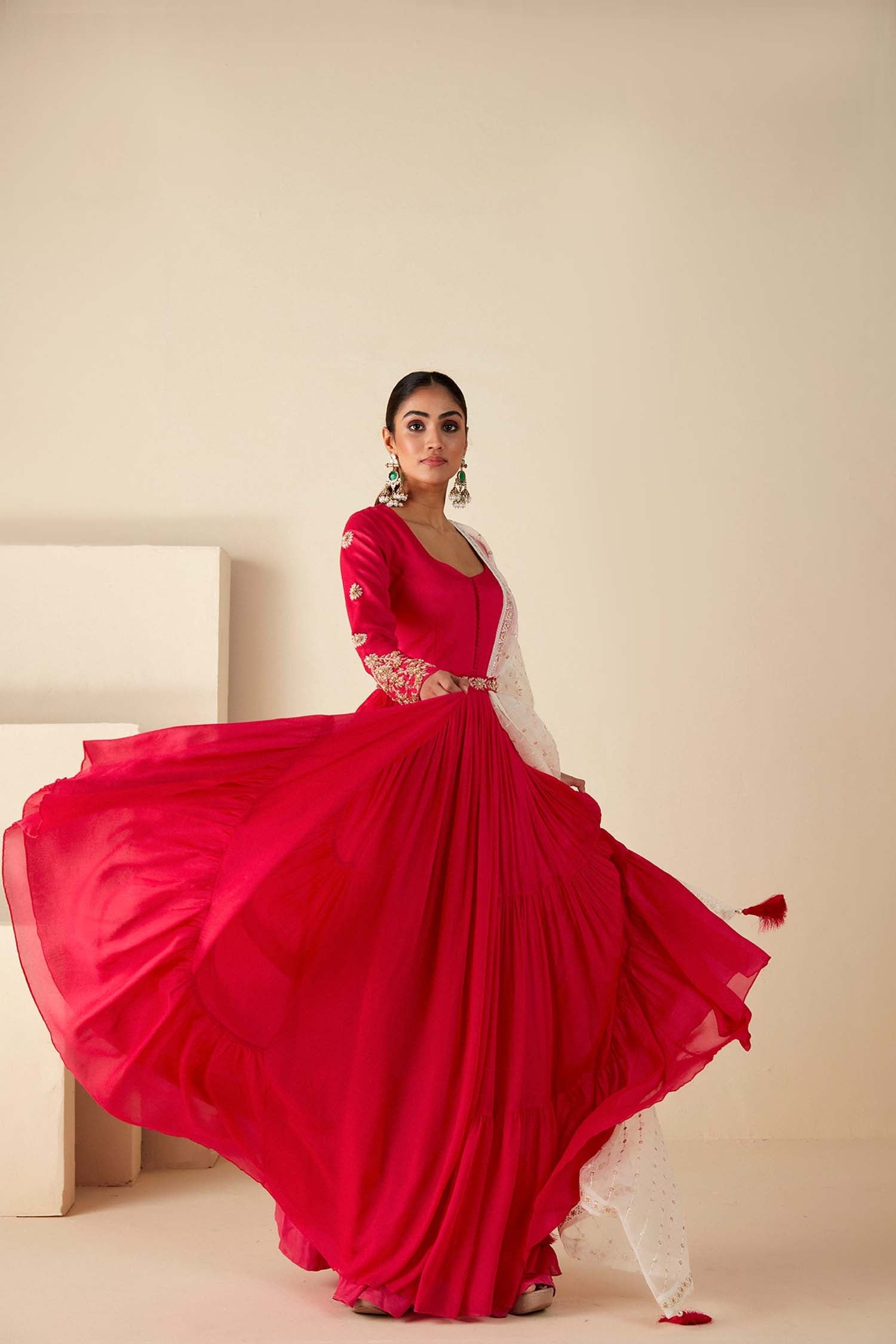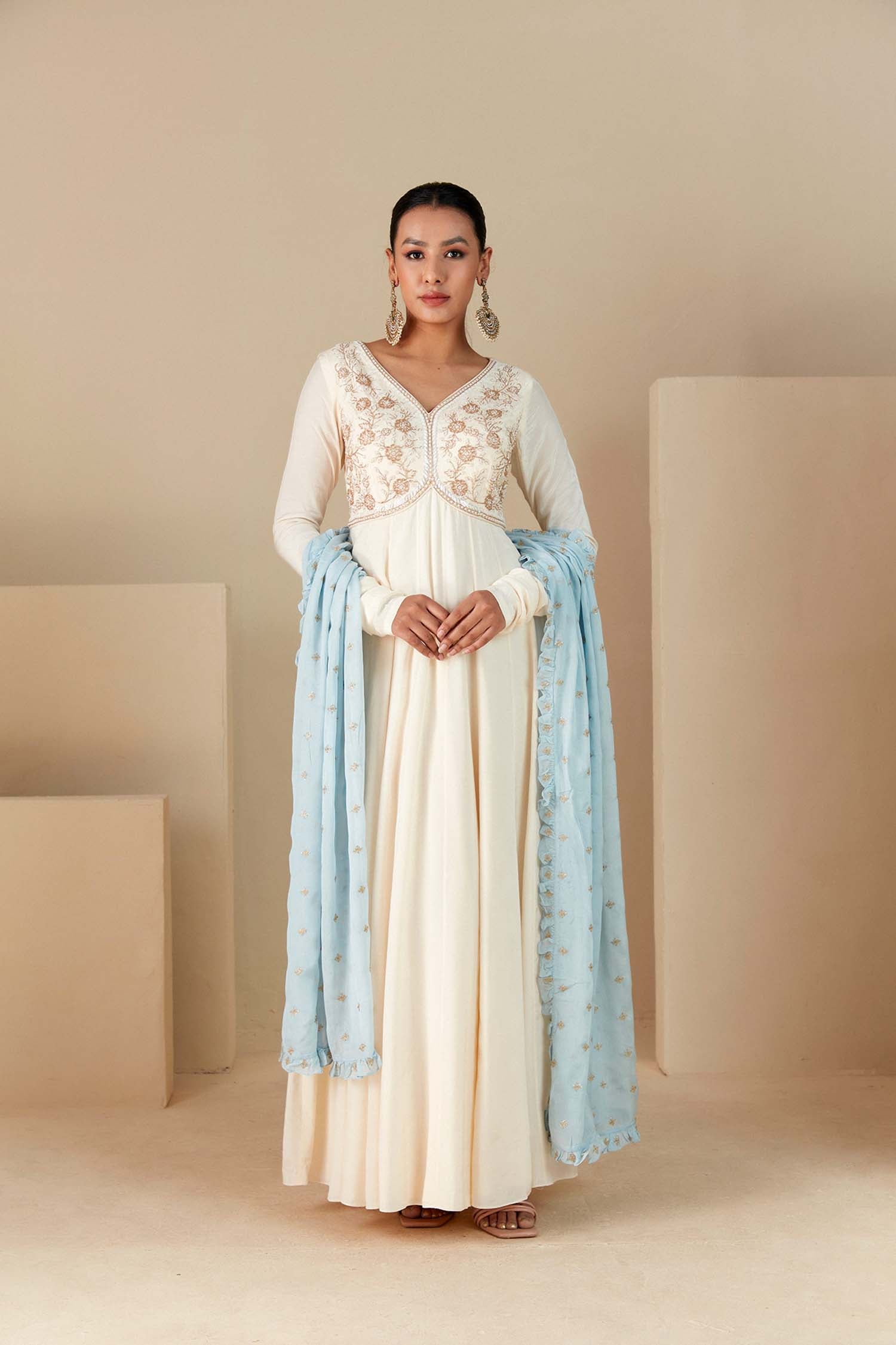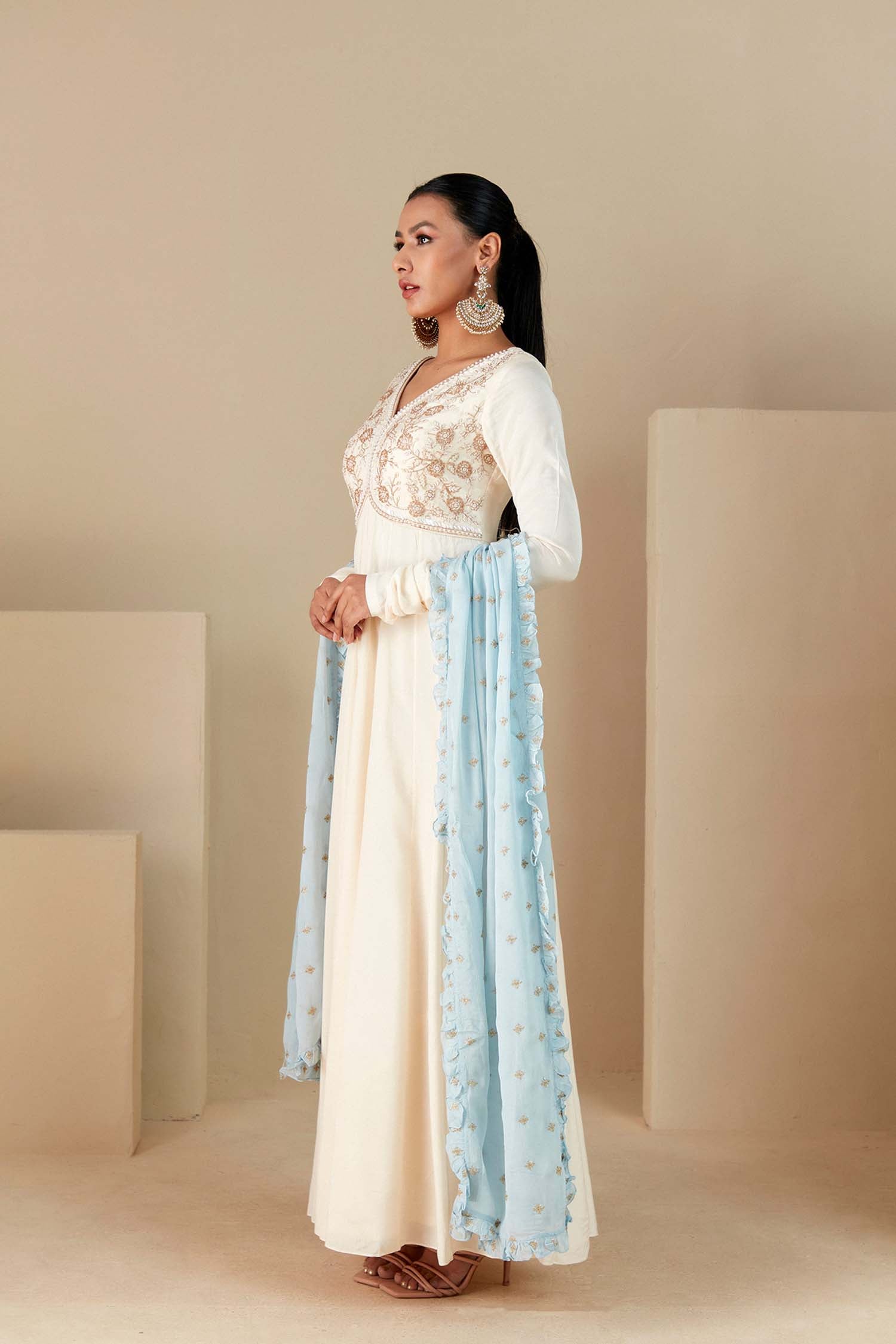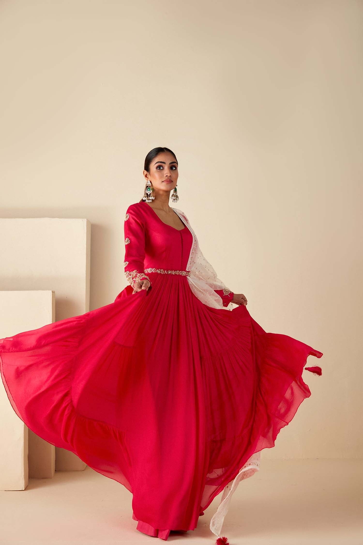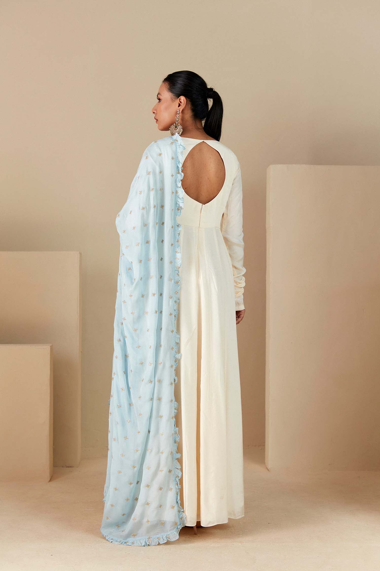 Hand Embroidered Anarkali with Elephant Arch Sleeves and Bandhani Dupatta