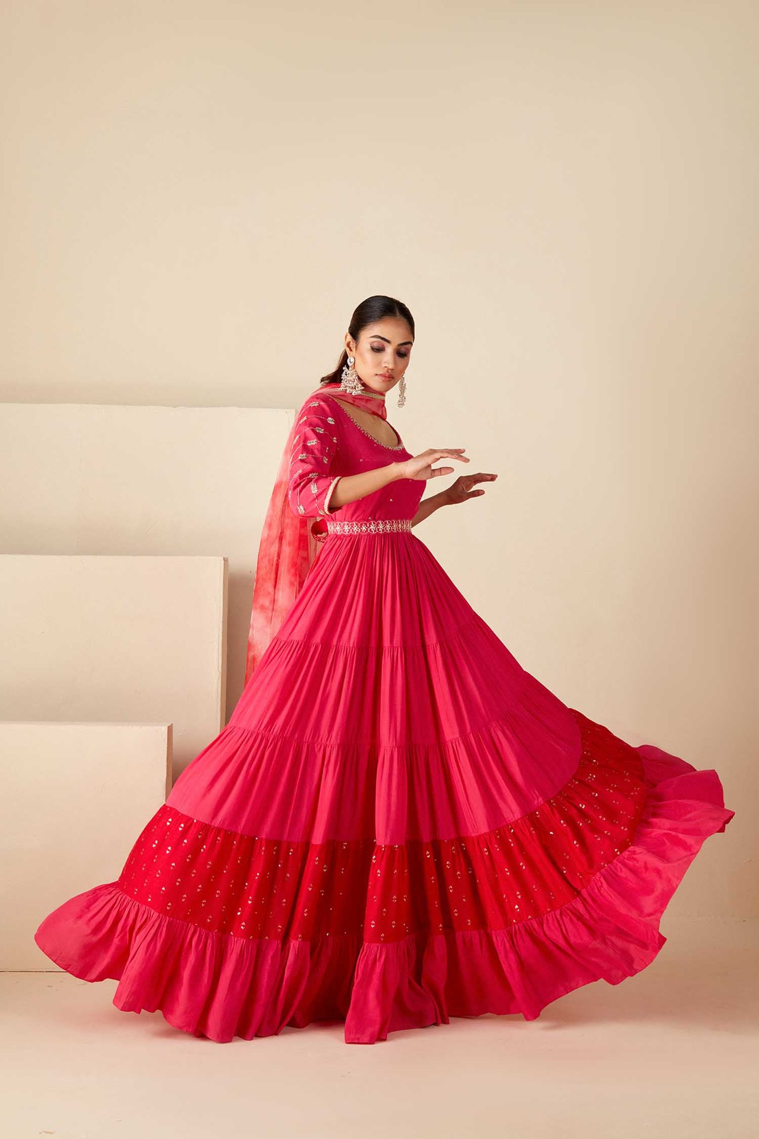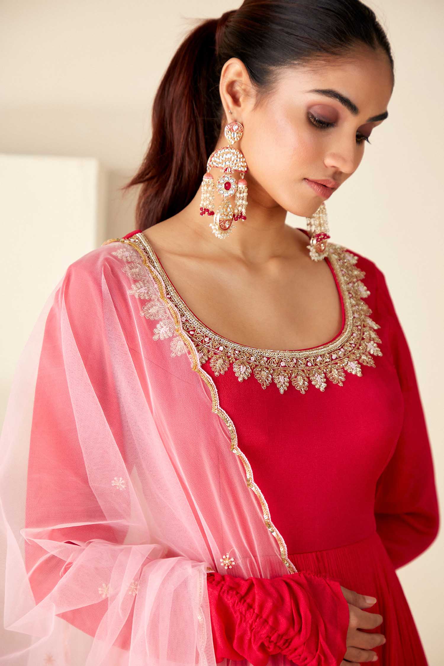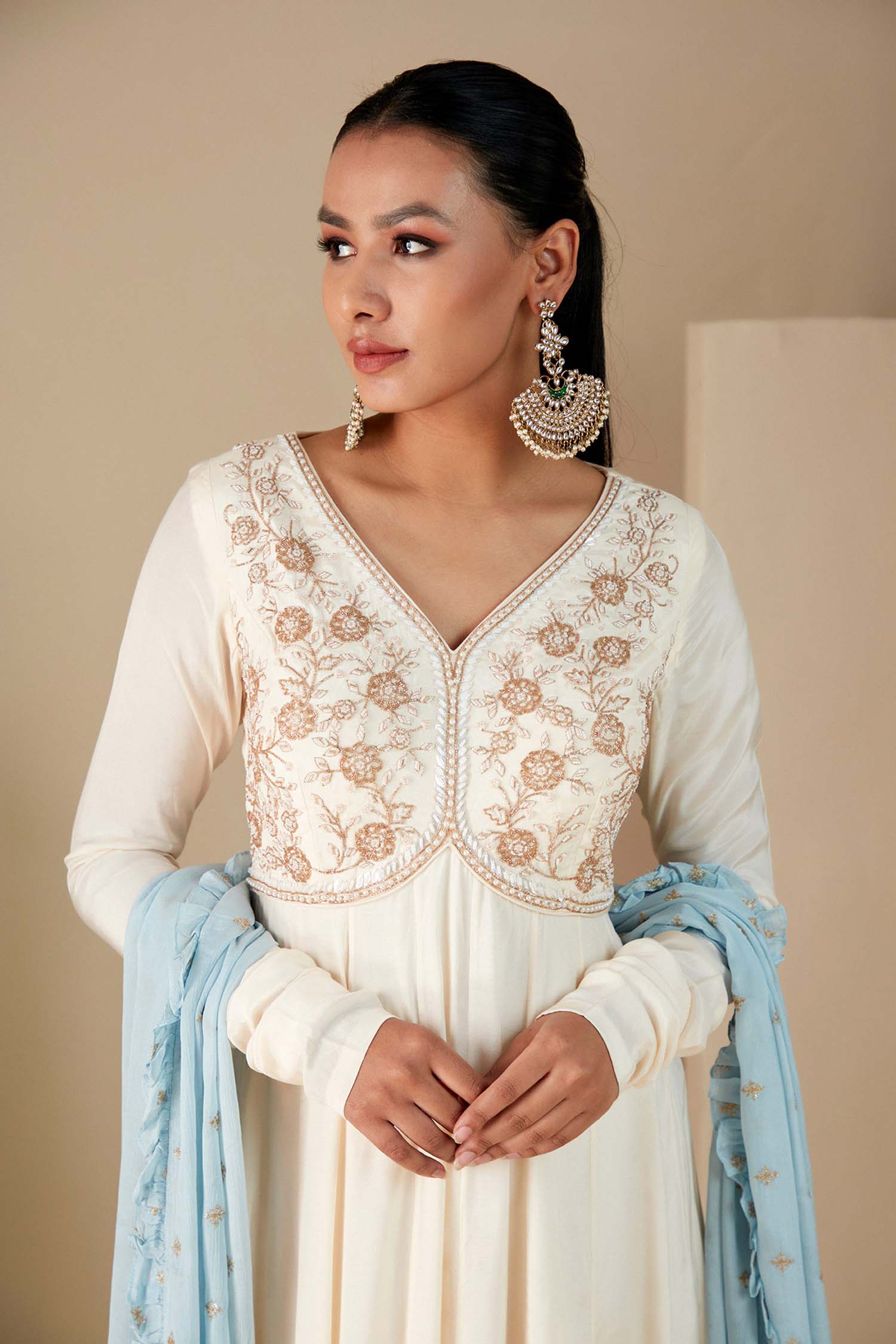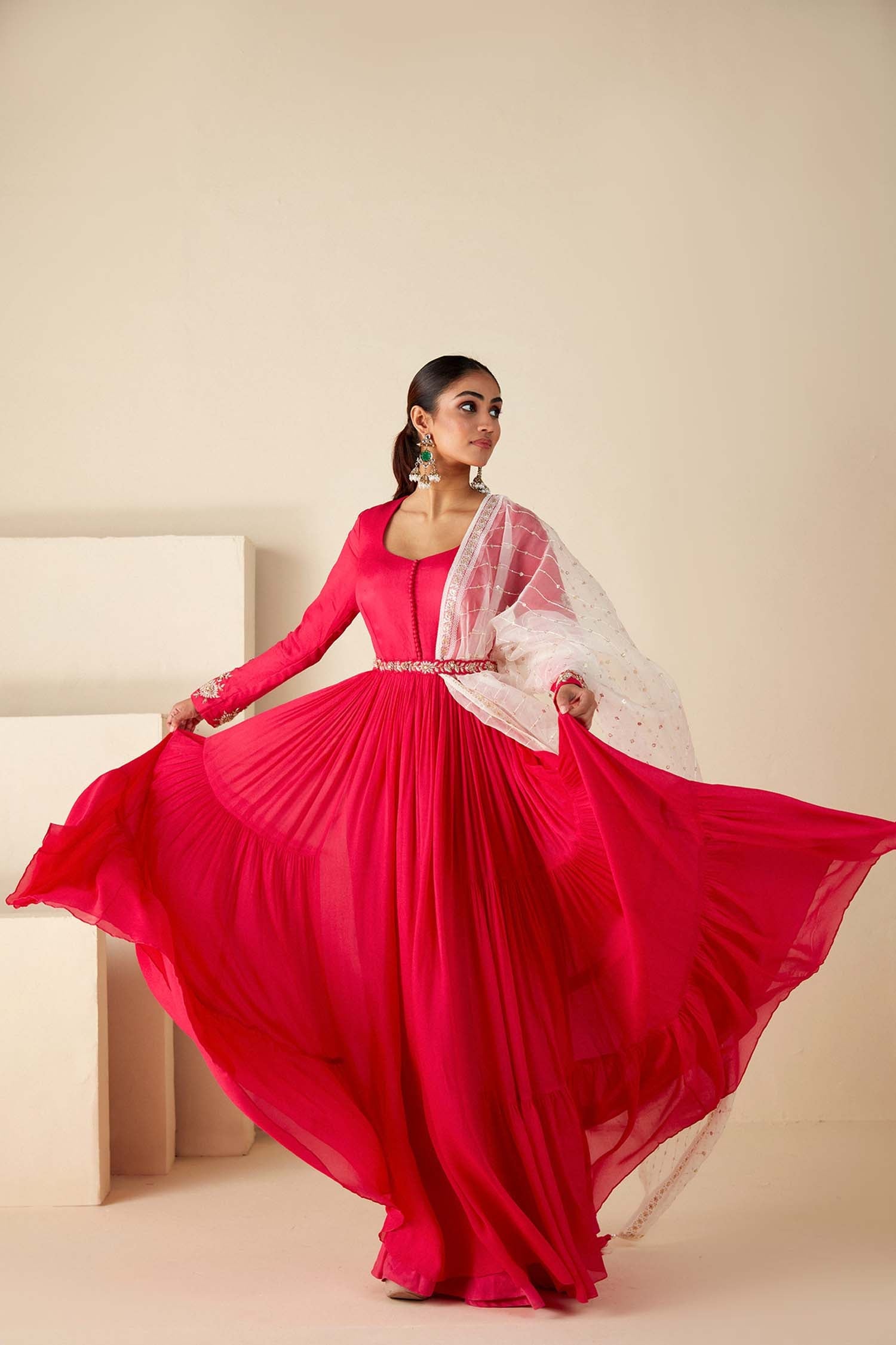 Hand Embroidered Anarkali with Elephant Arch Sleeves and Bandhani Dupatta