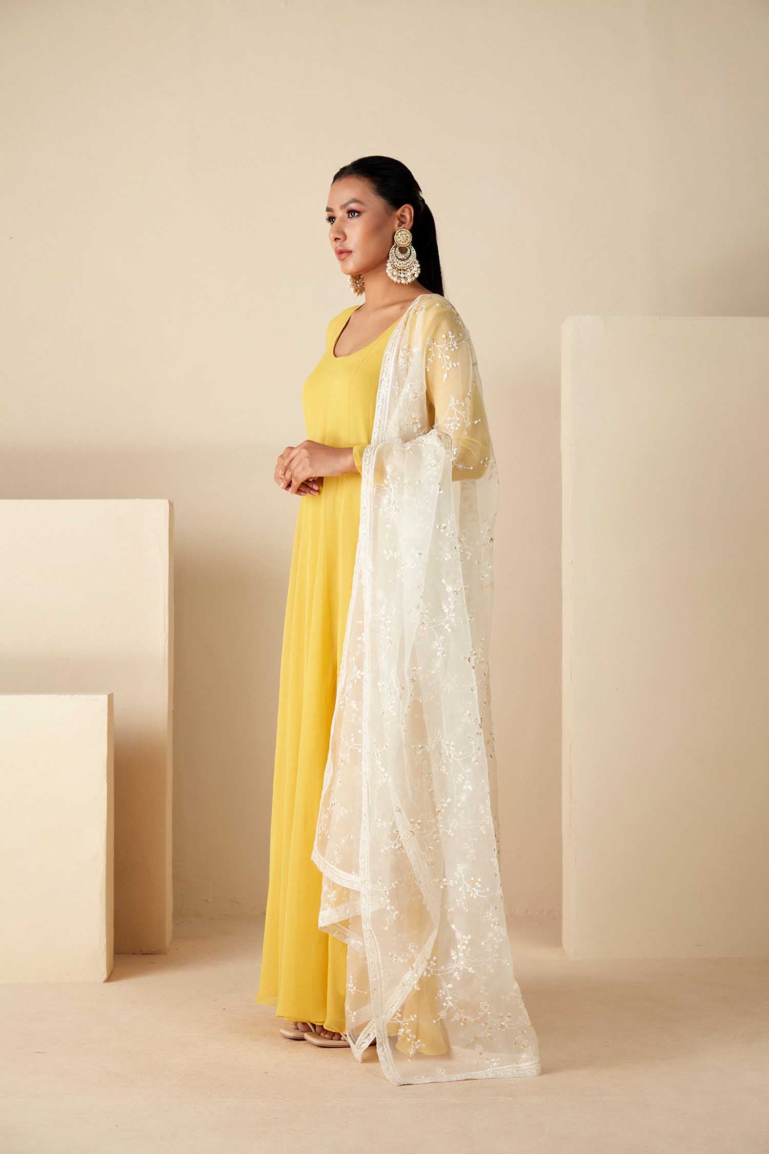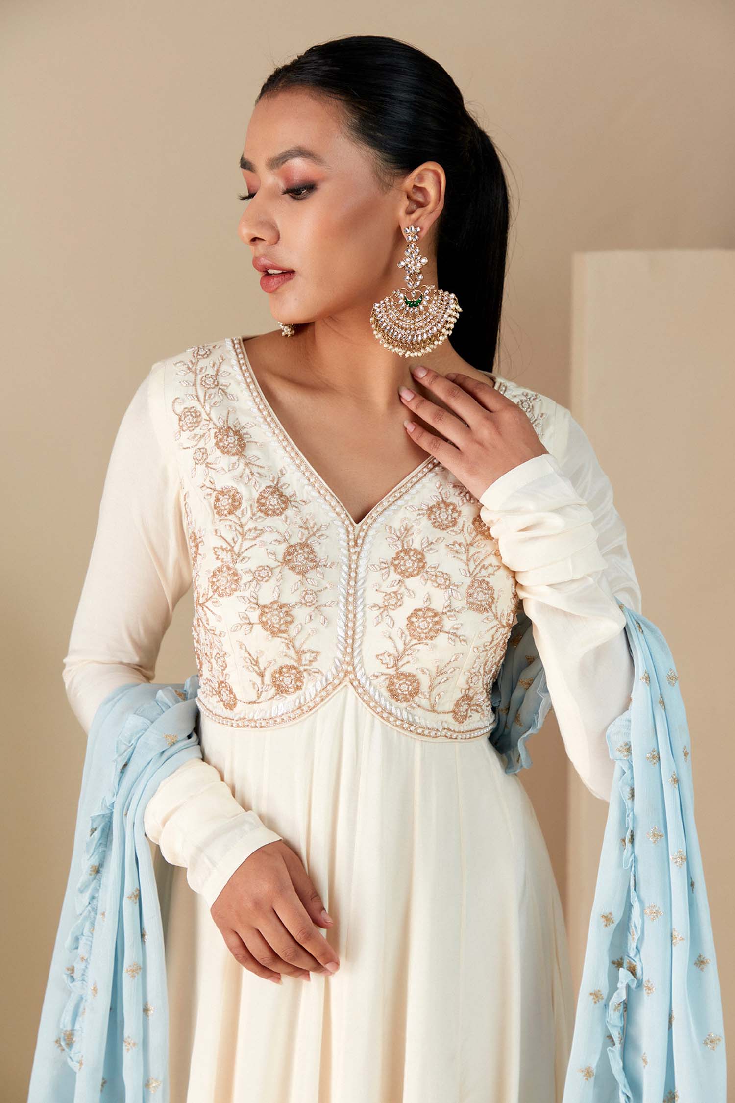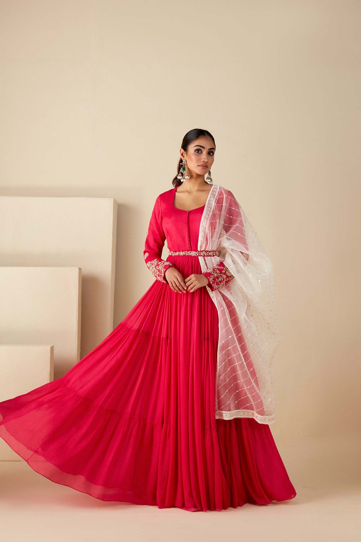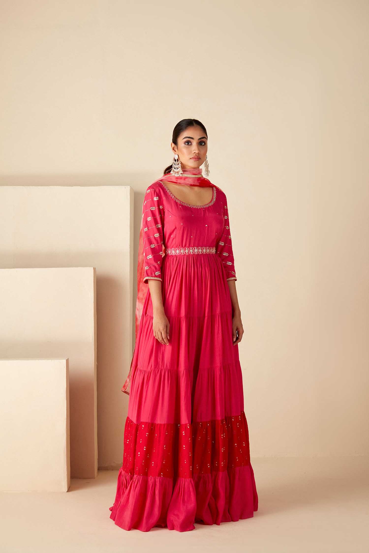 Hand Embroidered Anarkali with Elephant Arch Sleeves and Bandhani Dupatta