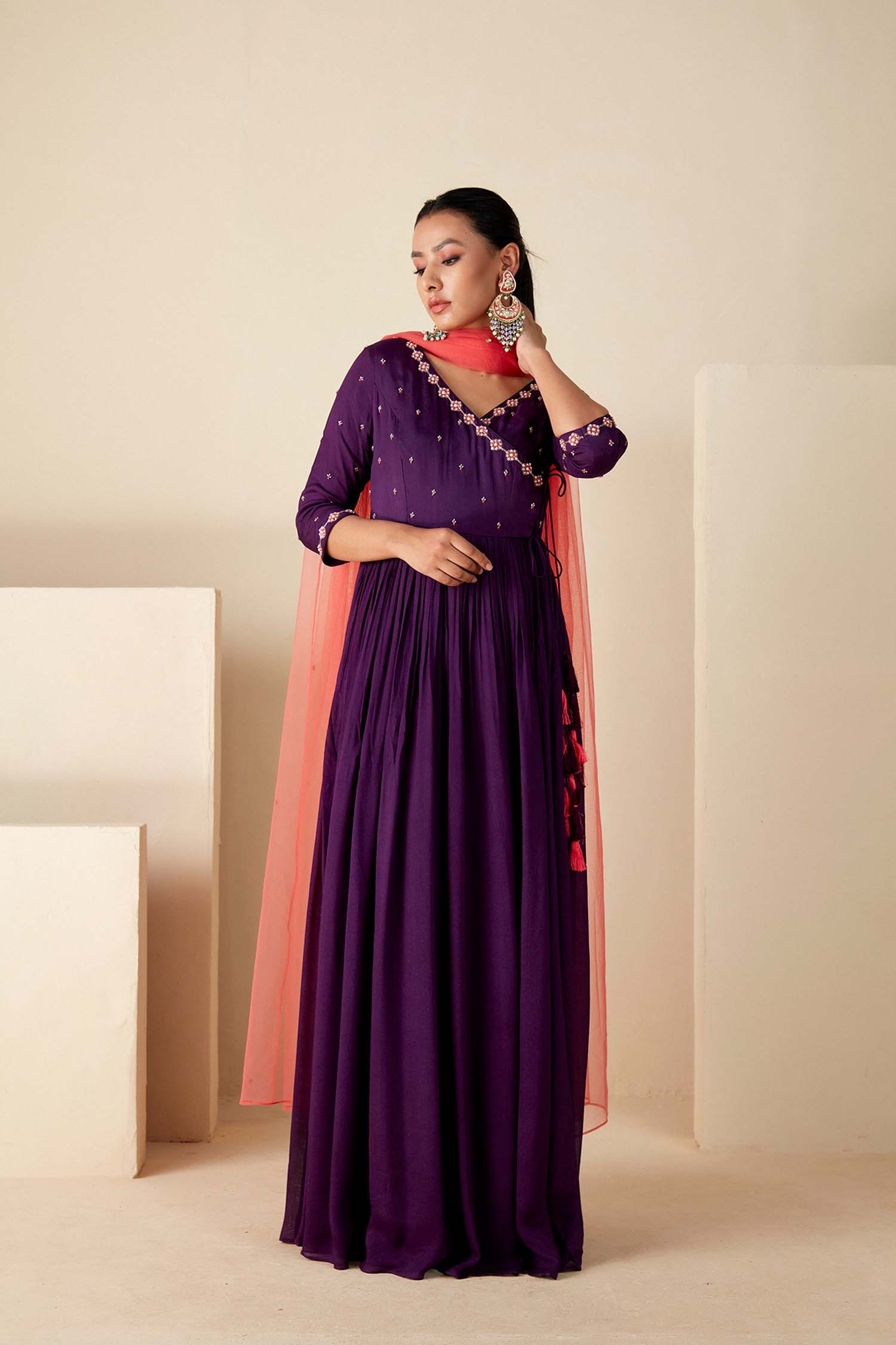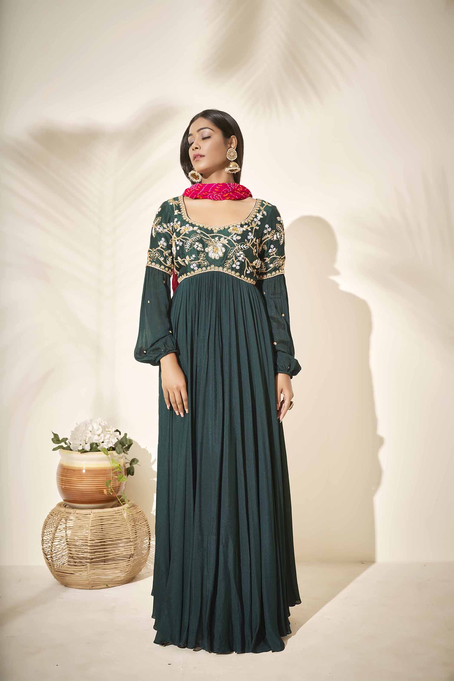 Teal Angrakha Anarkali with Embroidered Cuff and Bandhani Dupatta