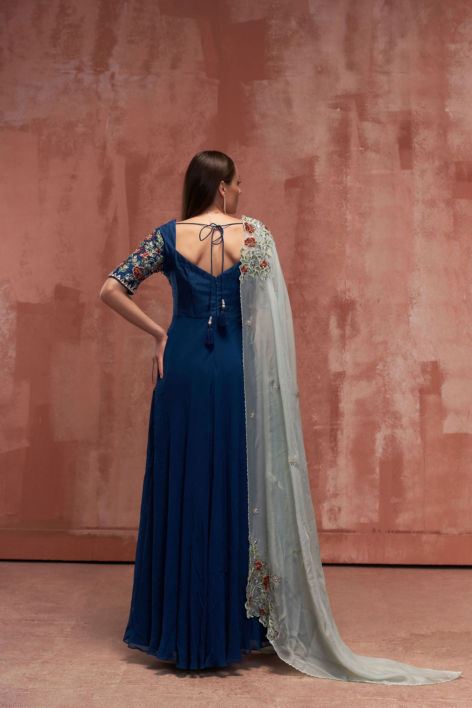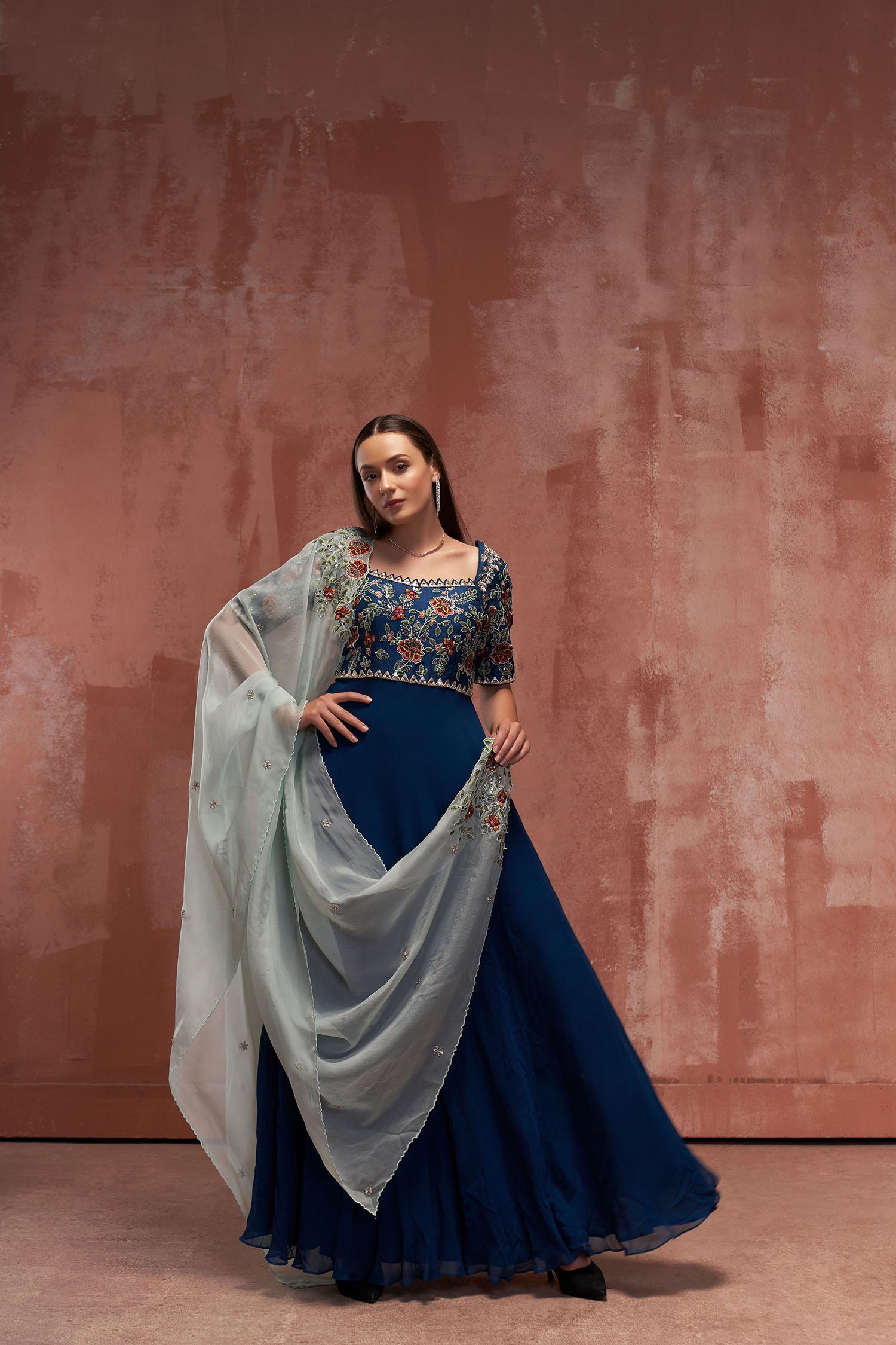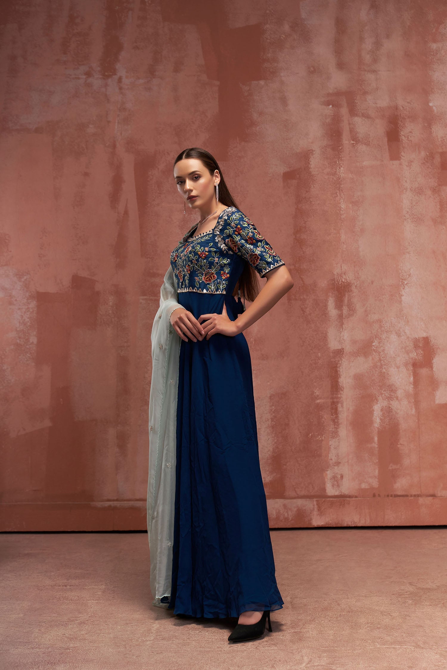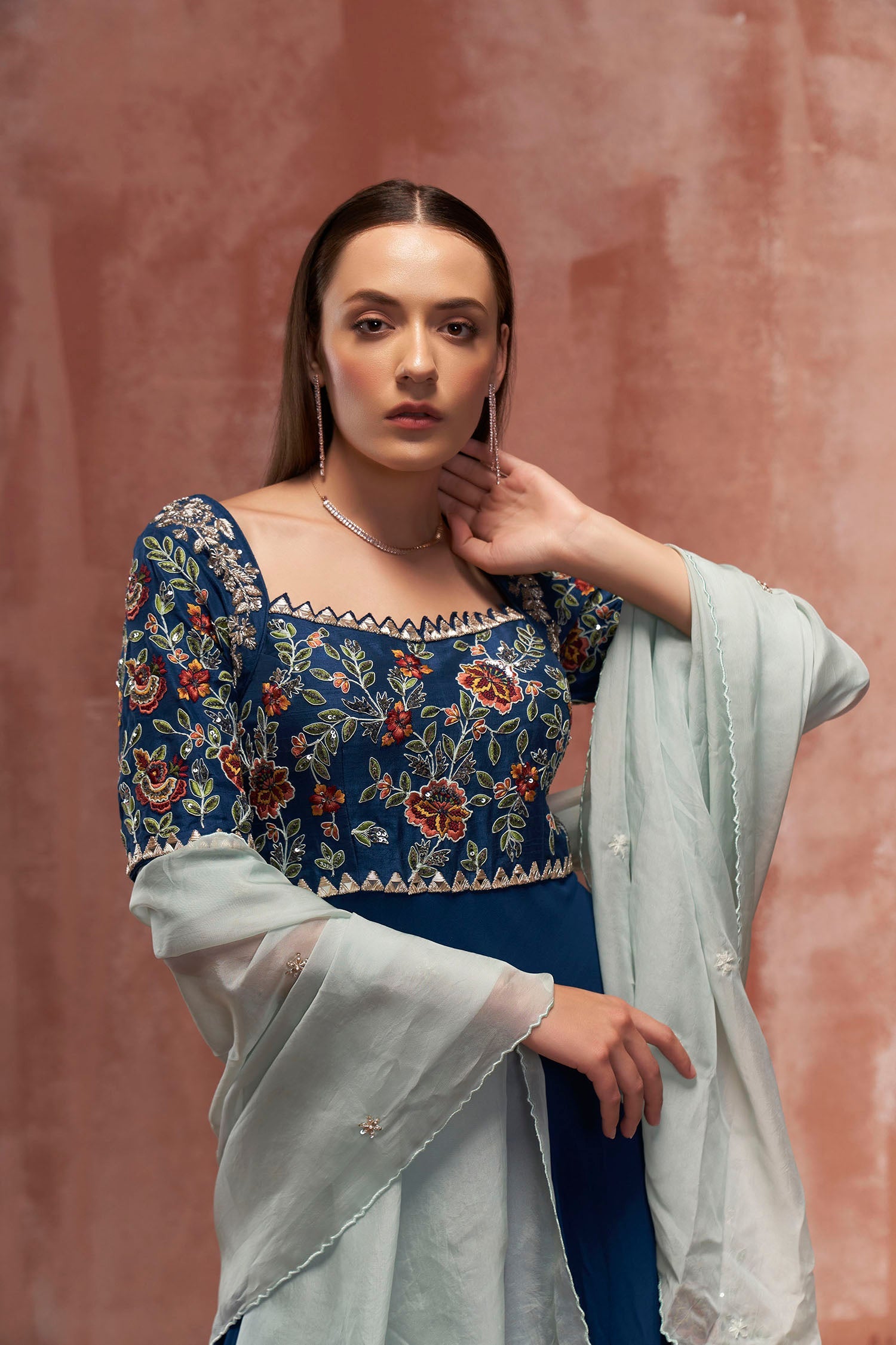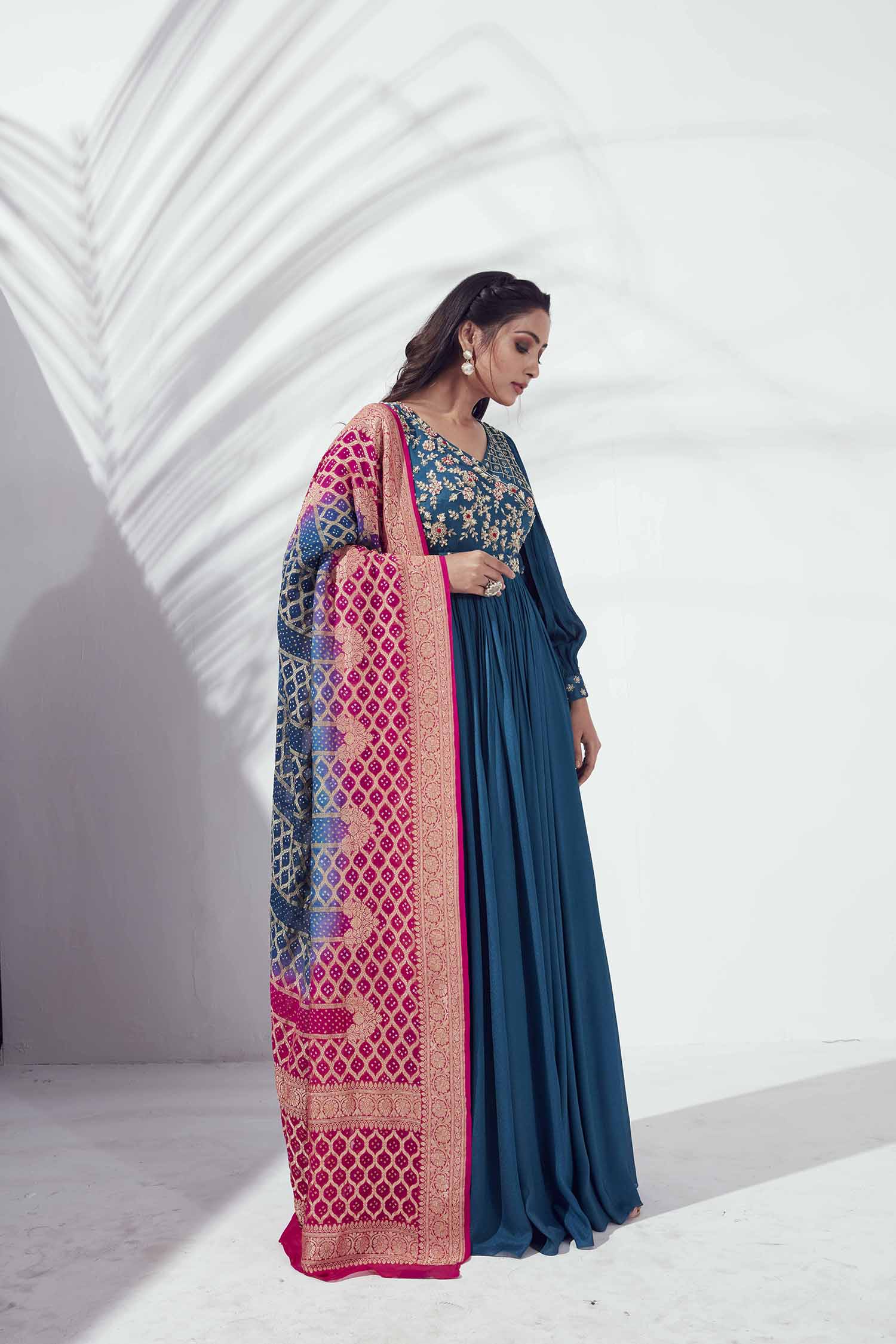 Teal Angrakha Style Anarkali with Banarasee Bandhani Dupatta