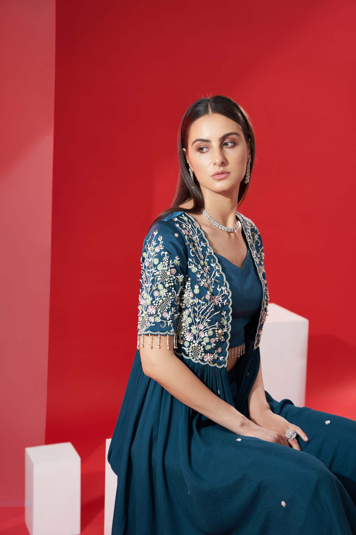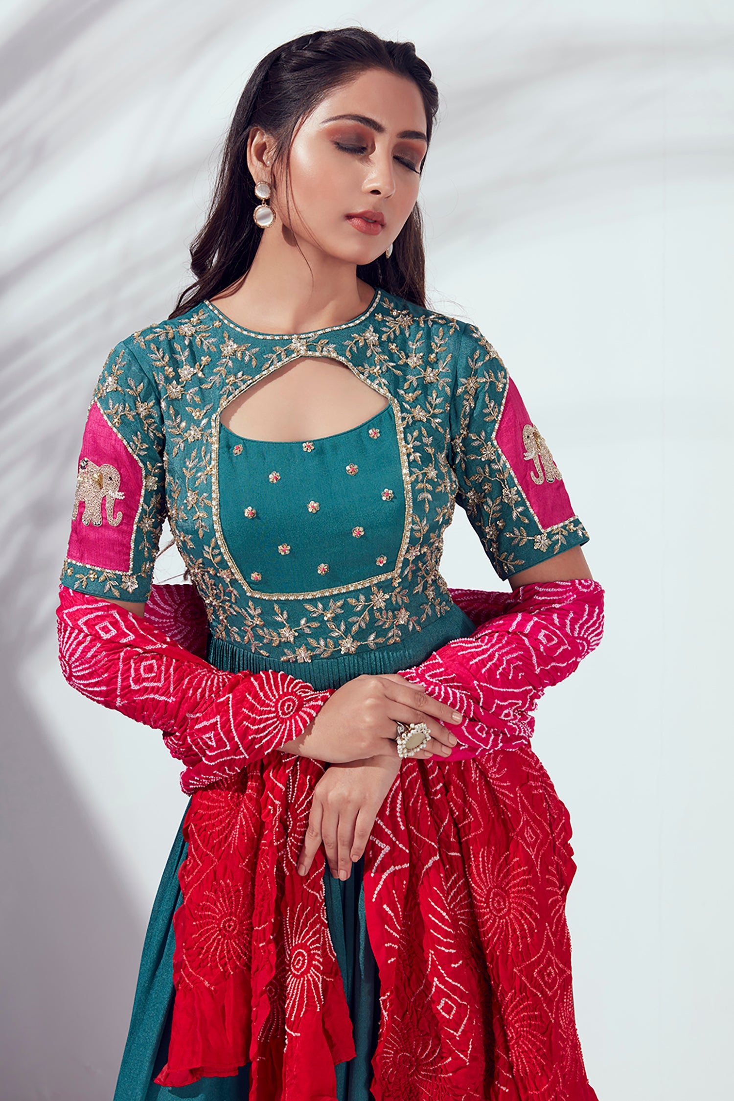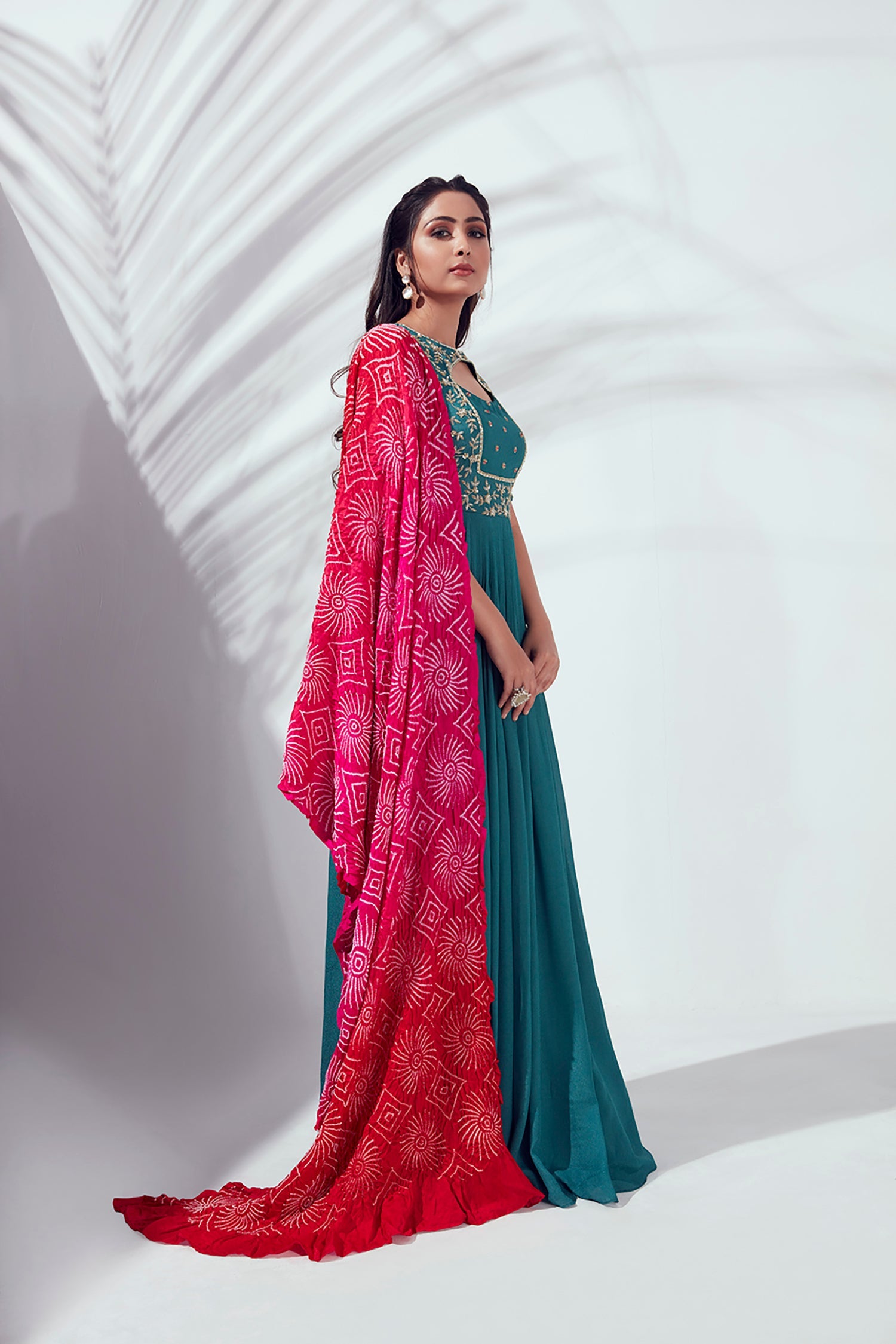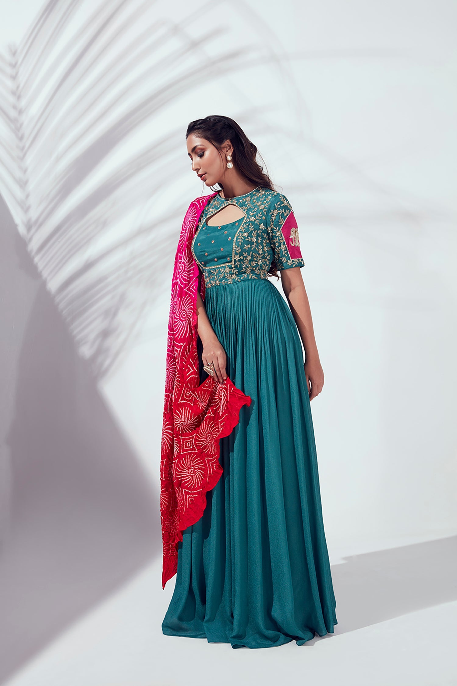 Teal Overlapping Angrakha Anarkali with Banarasee Bandhani Dupatta