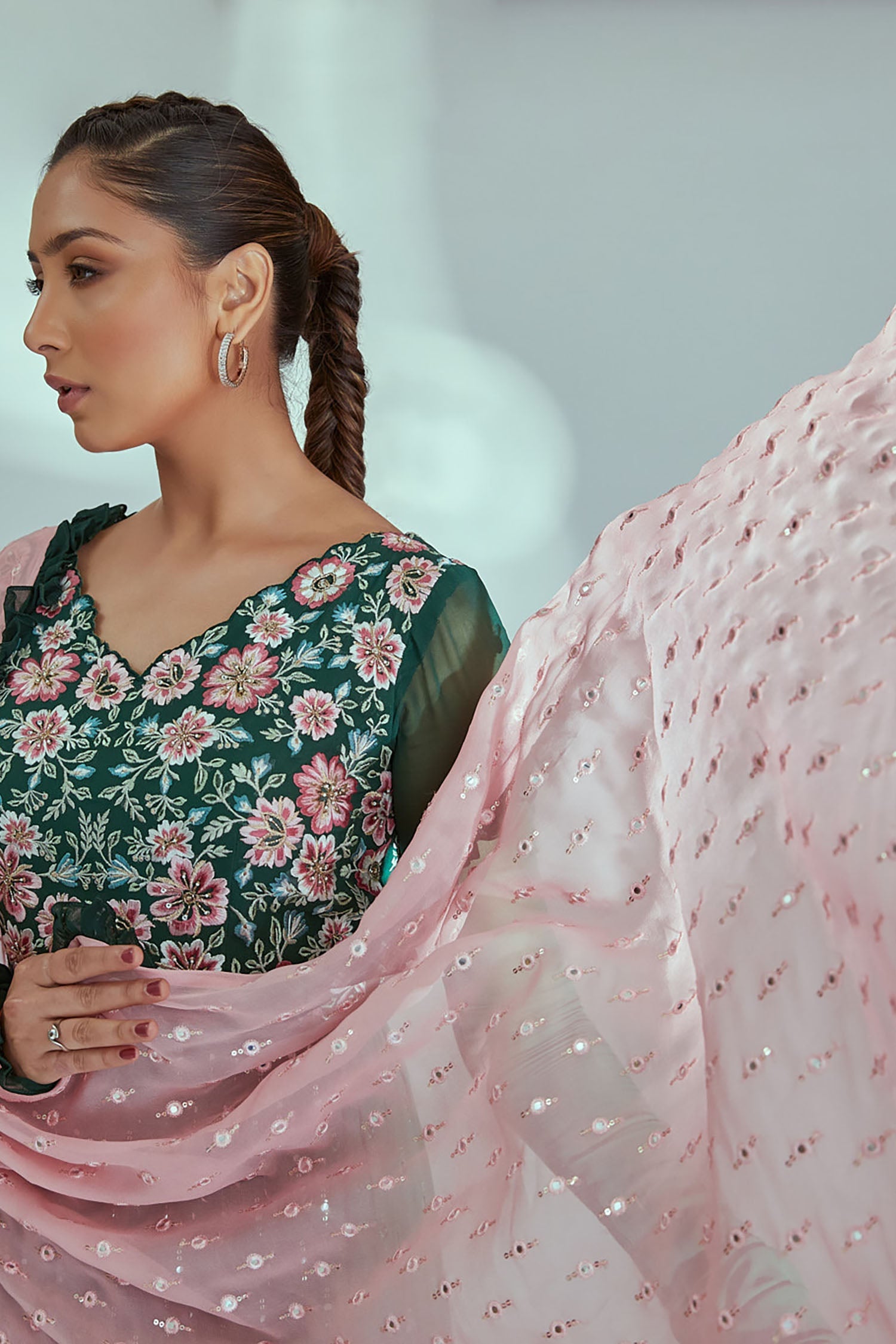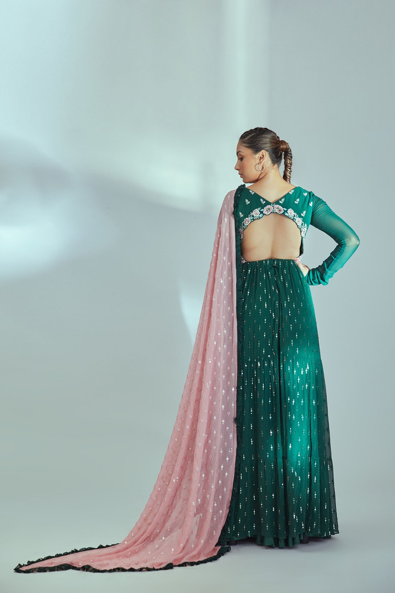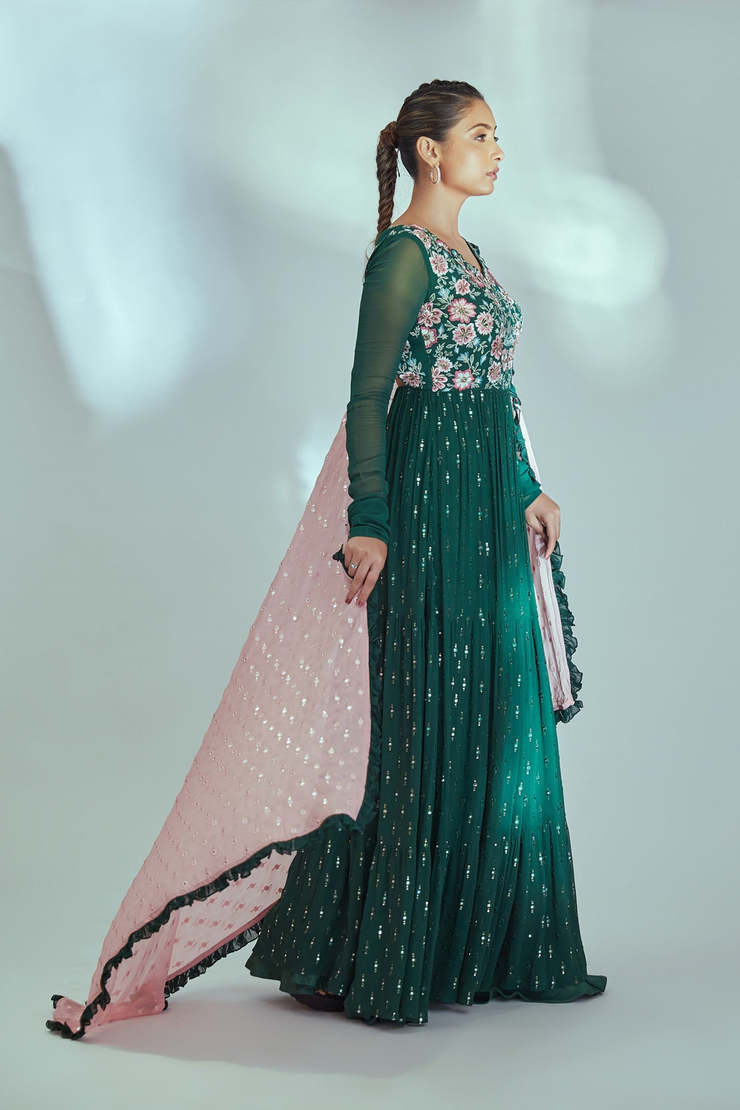 Intricately Sequin Embroidered Green Anarkali with Ombre Pleated Flare