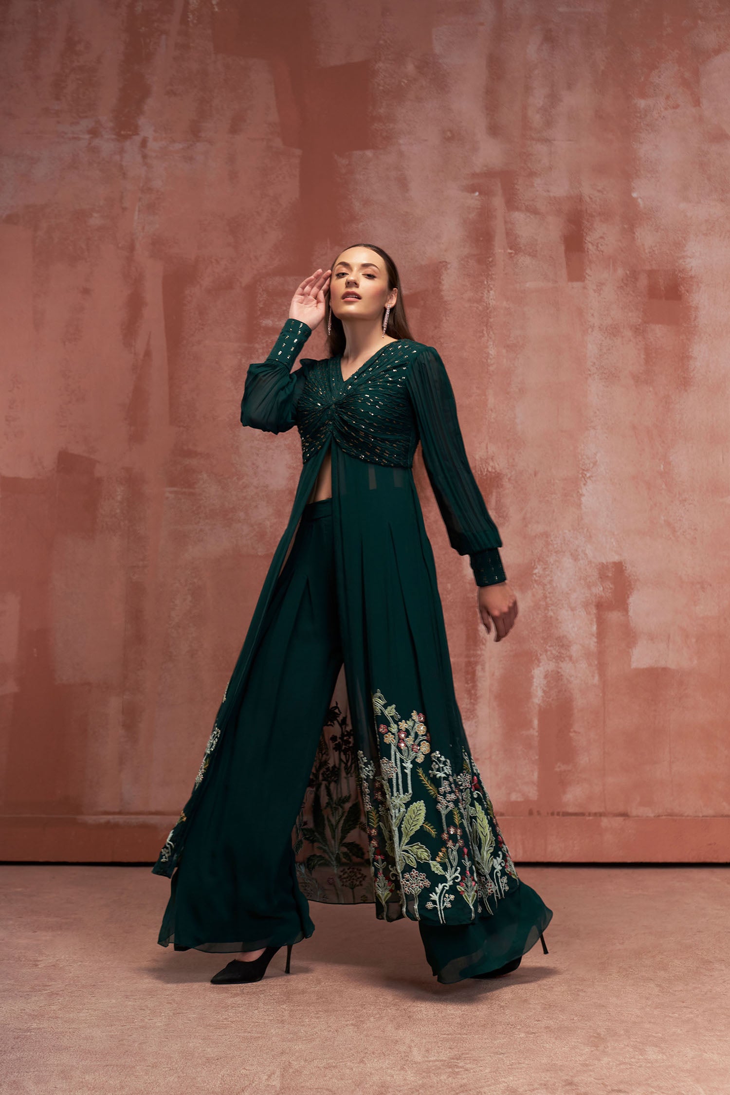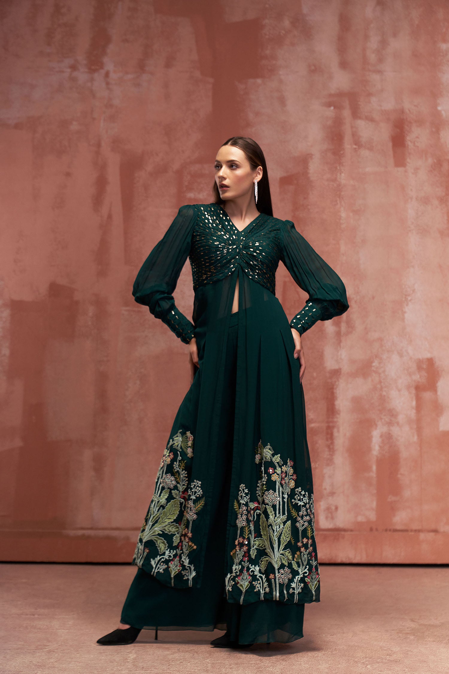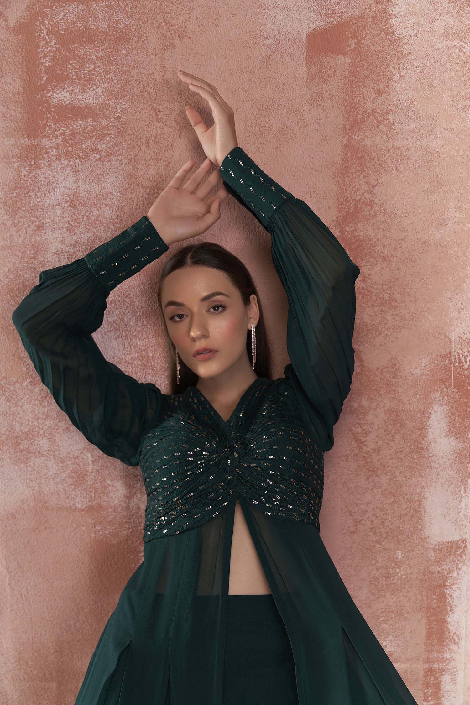 Intricately Sequin Embroidered Green Anarkali with Ombre Pleated Flare