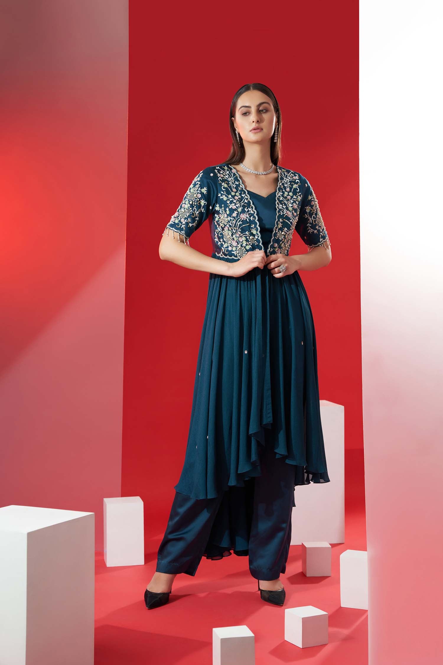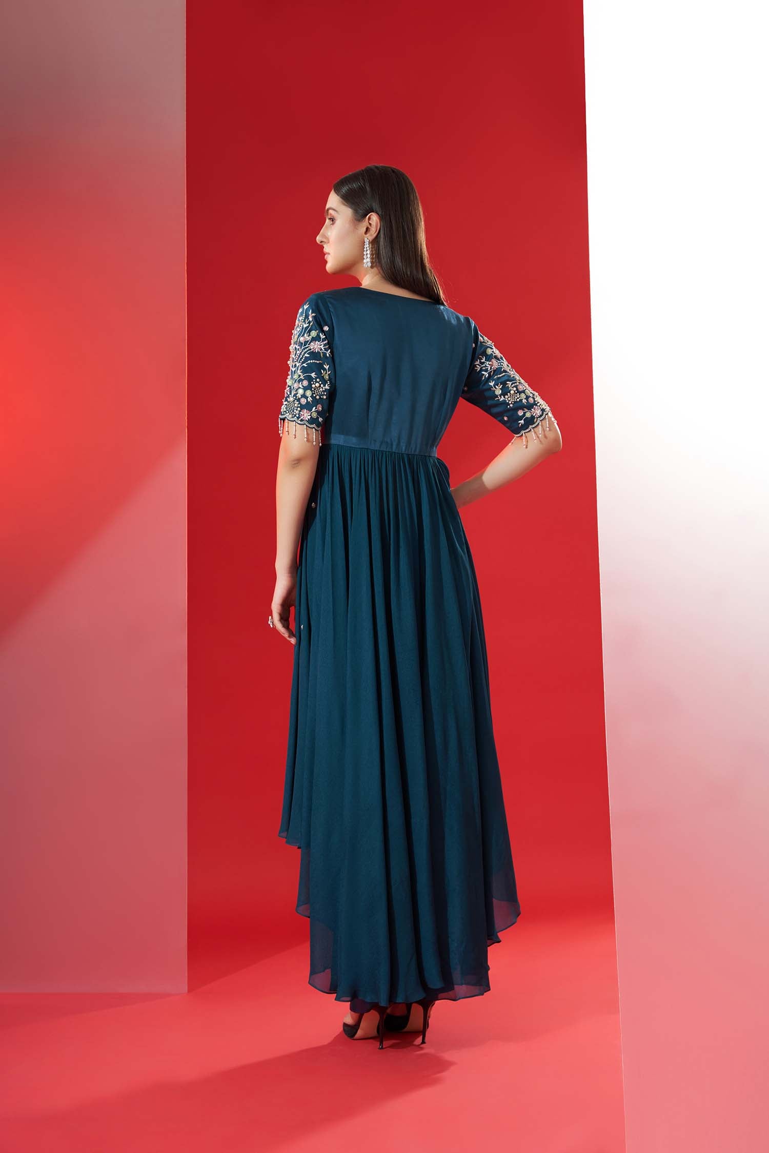 Teal Angrakha Style Anarkali with Flared Sleeves and Banarasee Bandhani Dupatta
