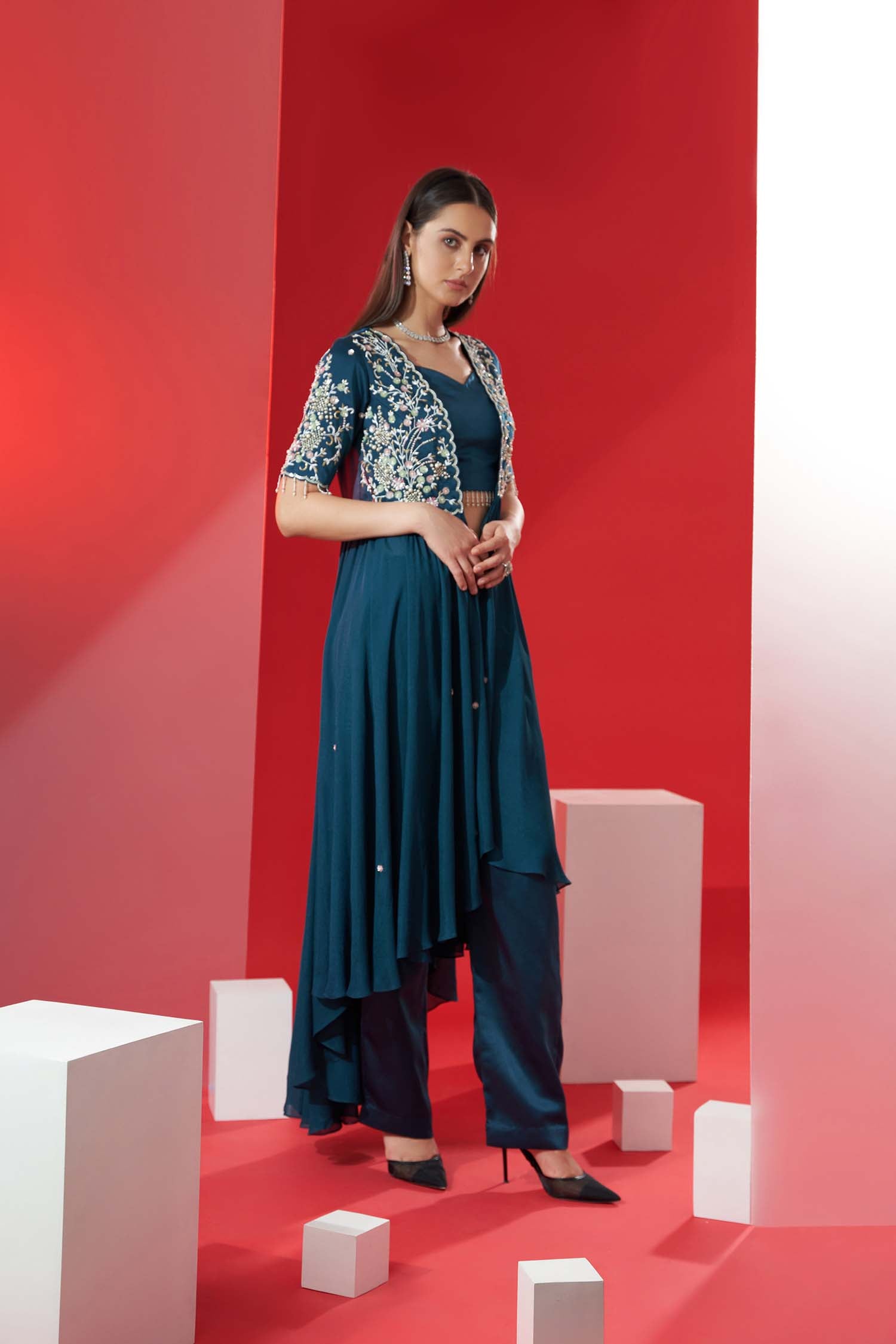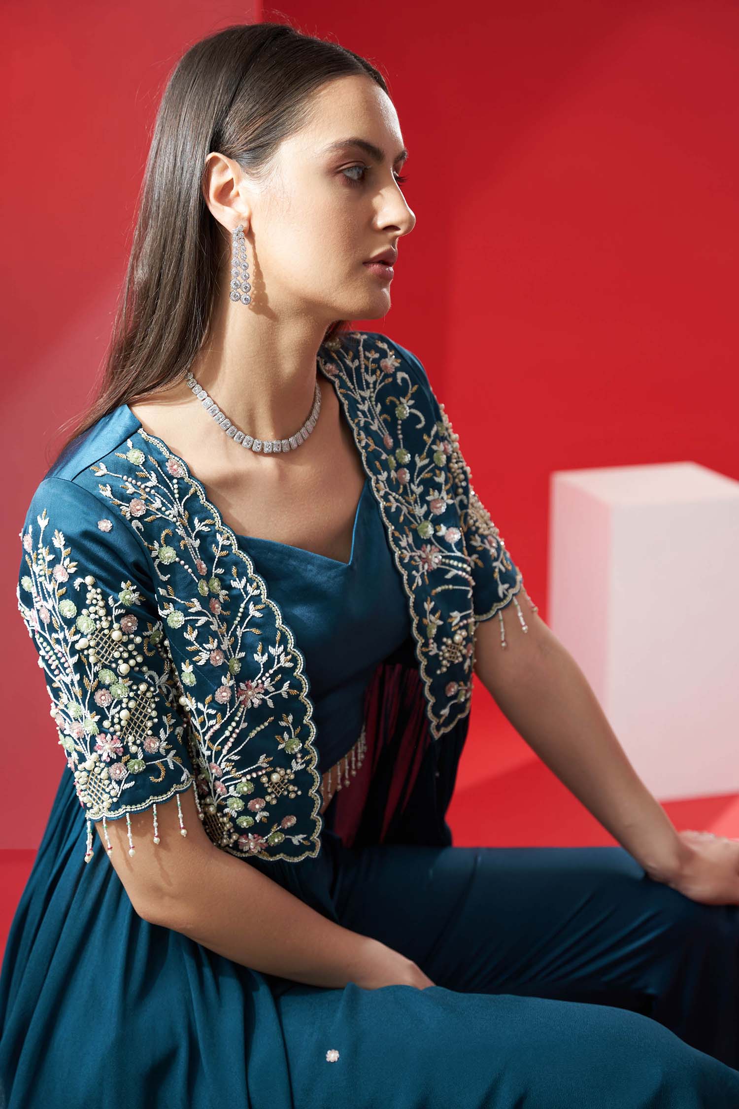 Teal Overlapping Angrakha Anarkali with Elephant Tassels and Banarasee Bandhani Dupatta