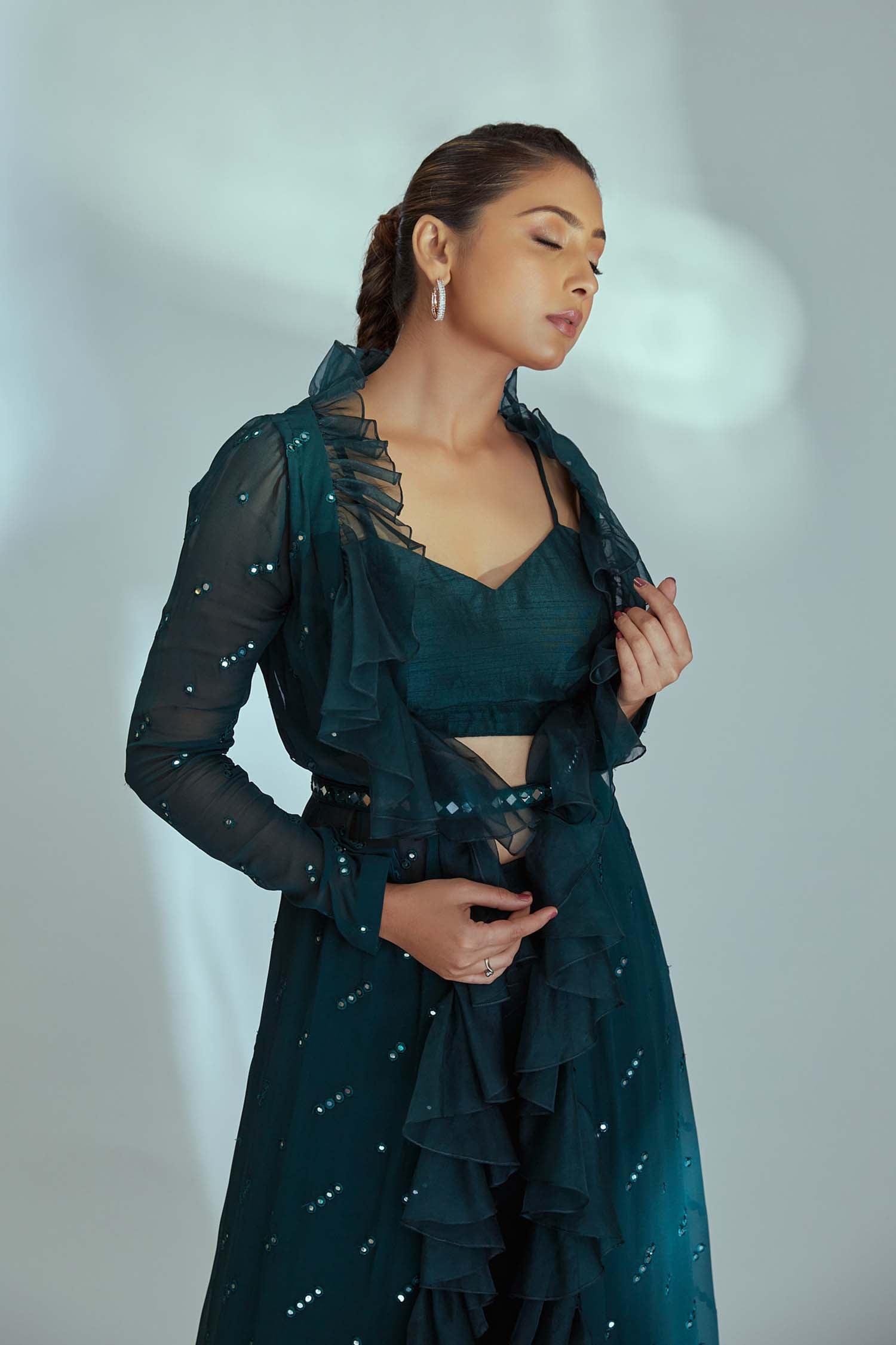 Mint Green Ruffle Drape Skirt Set with Crop Top and Dupatta
