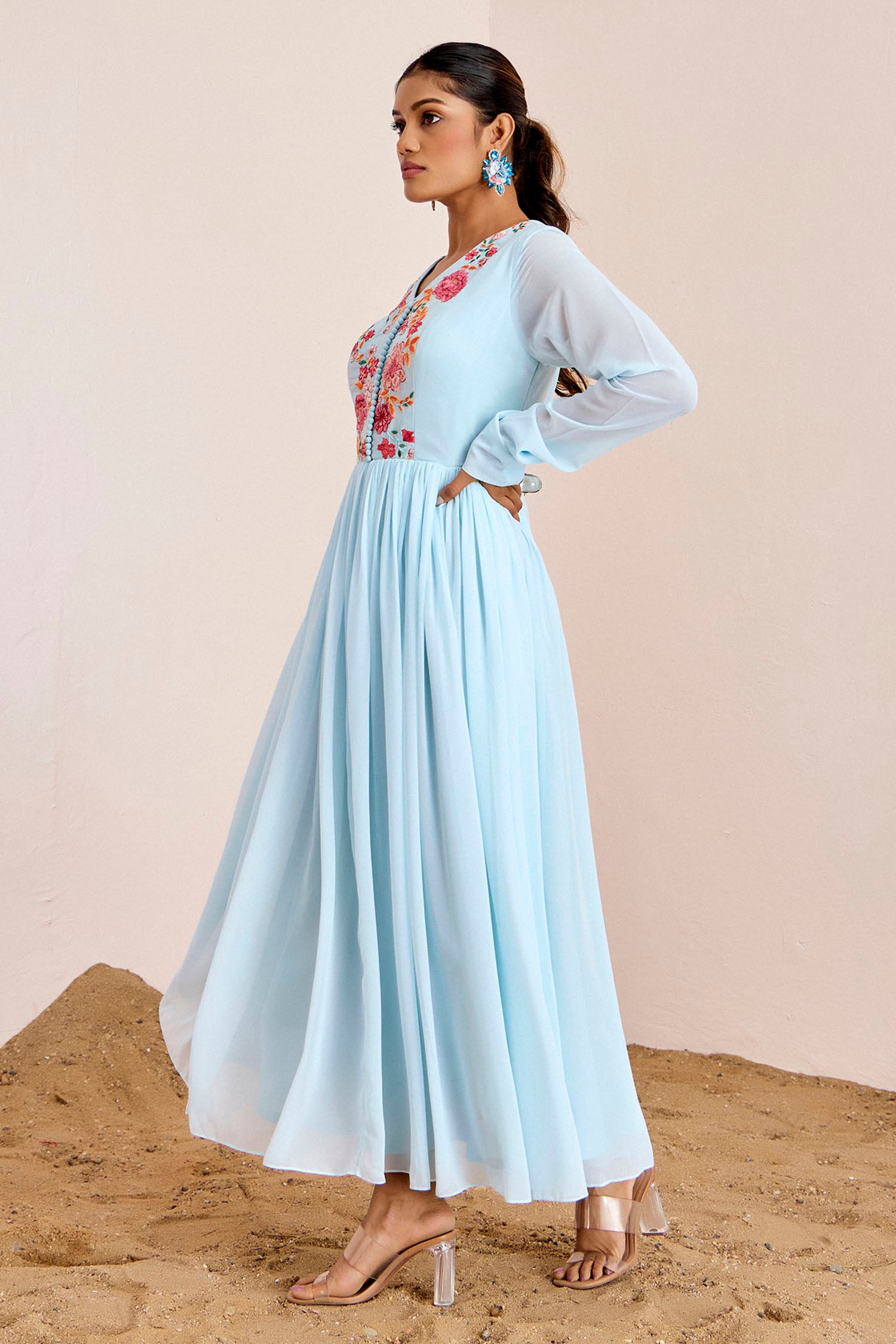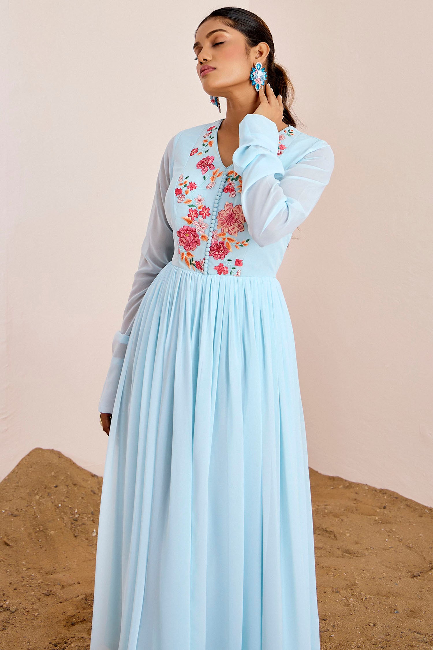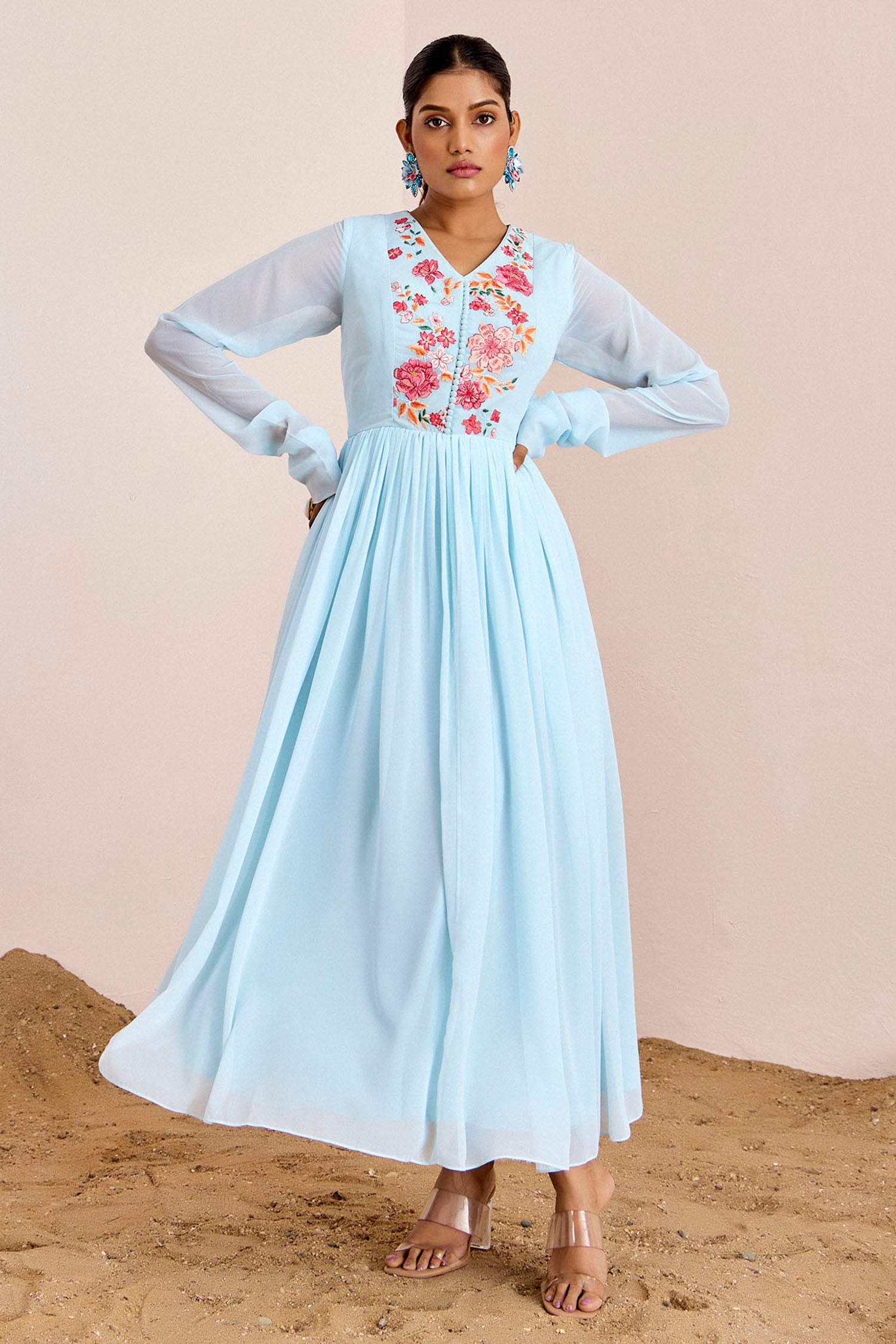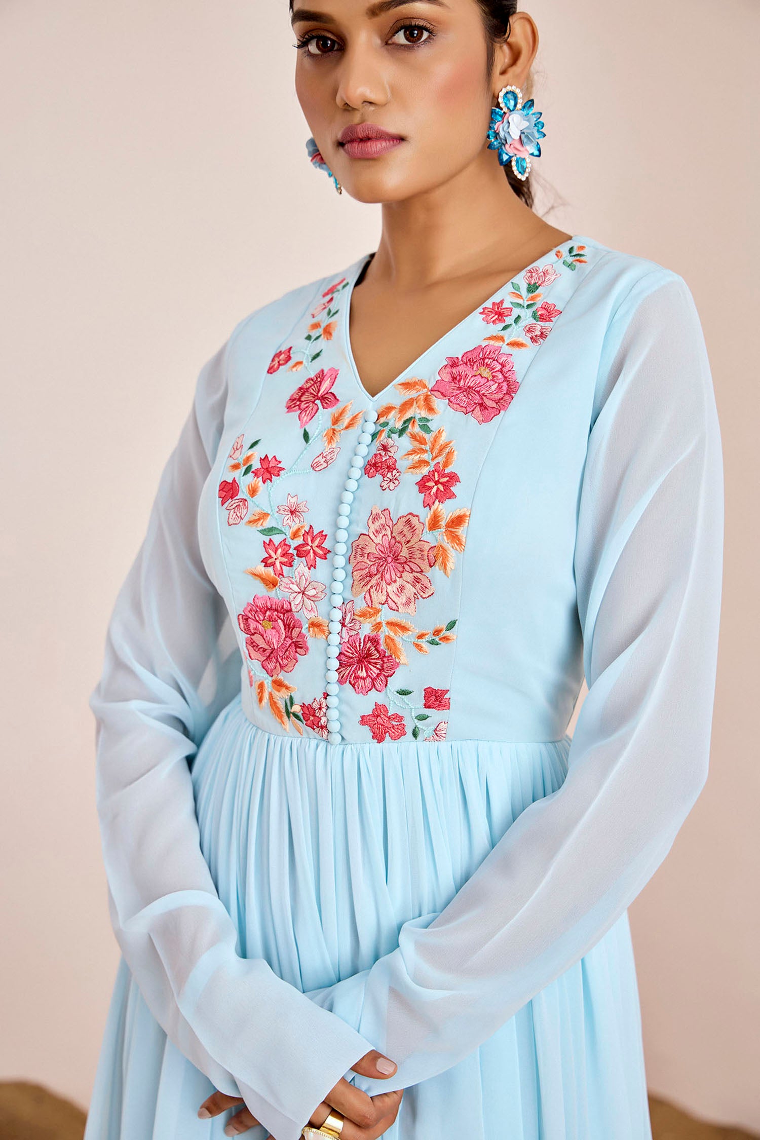 Thread Embroidered Floral Gown with Gathers and Chudi Sleeves