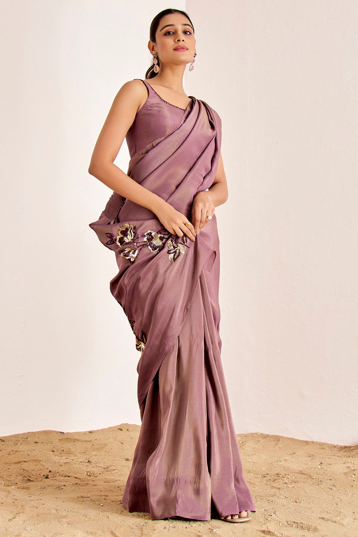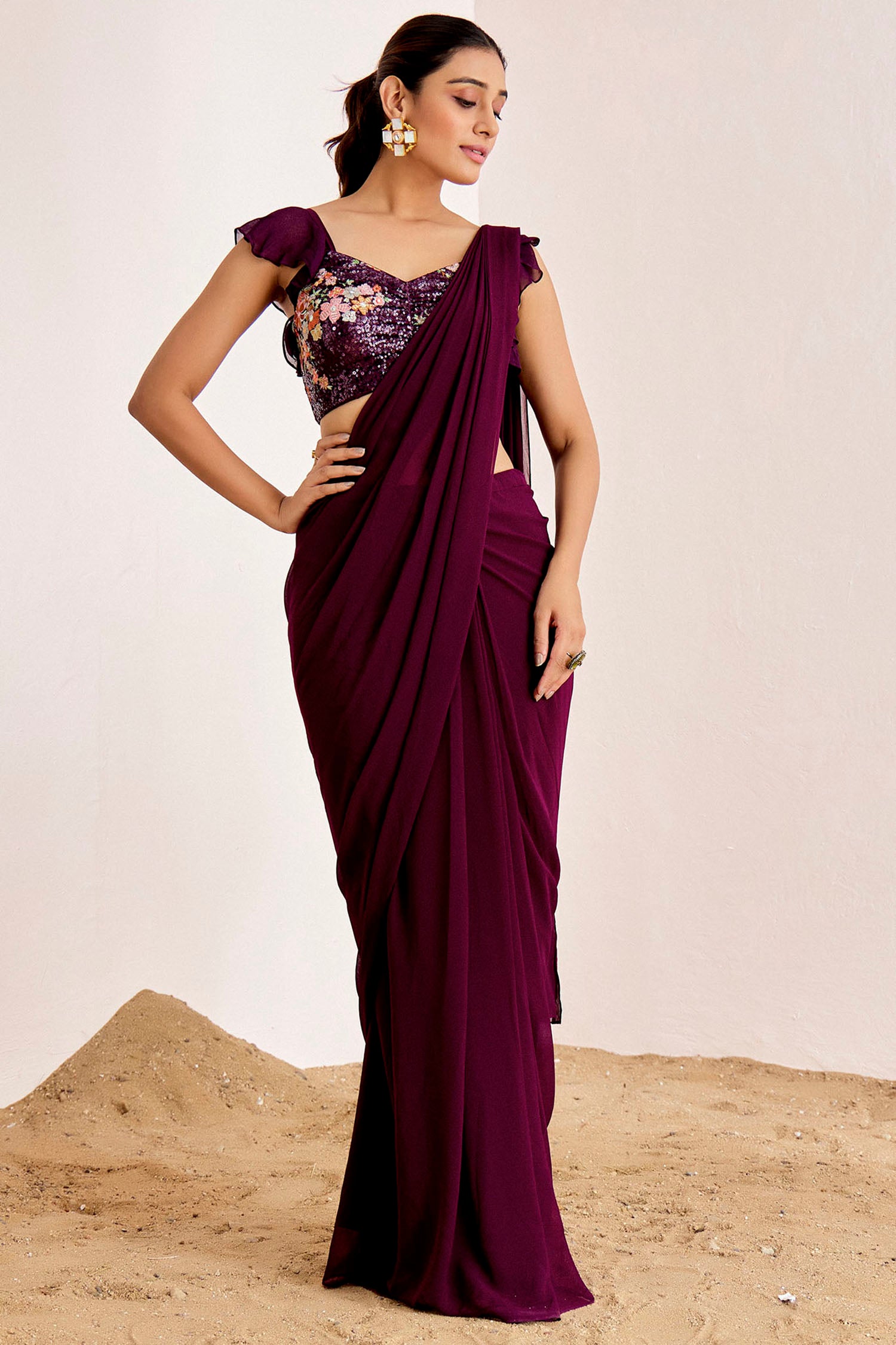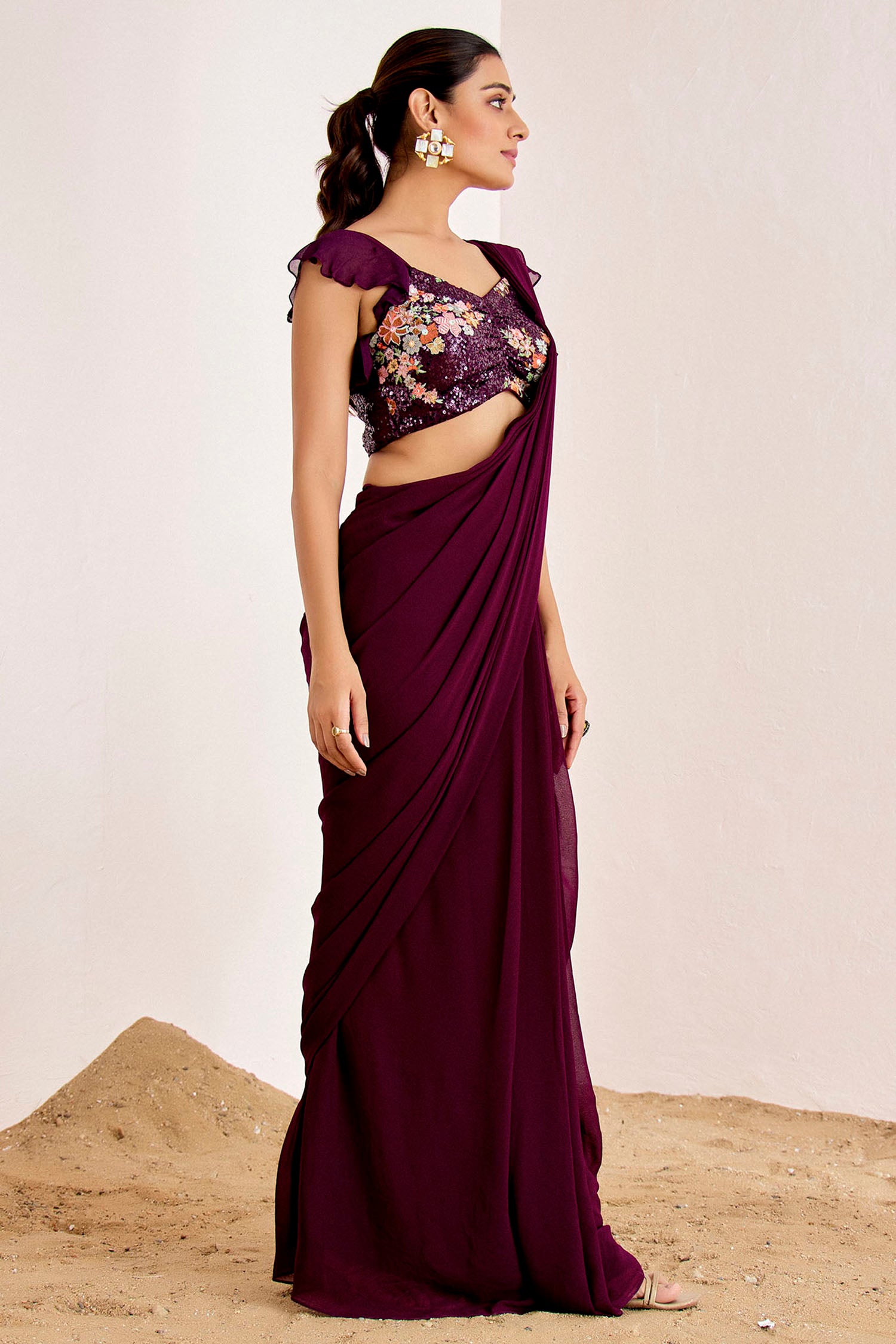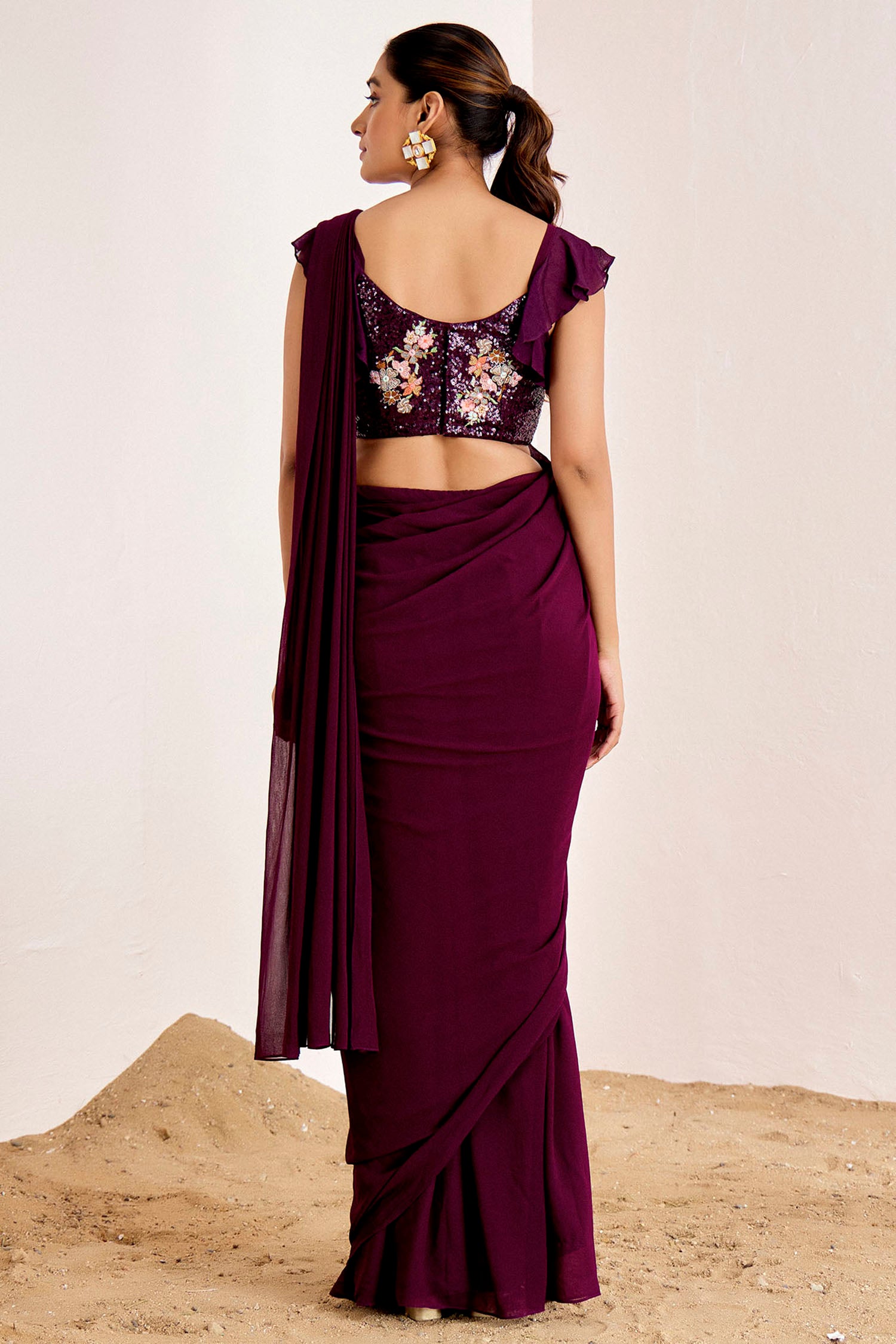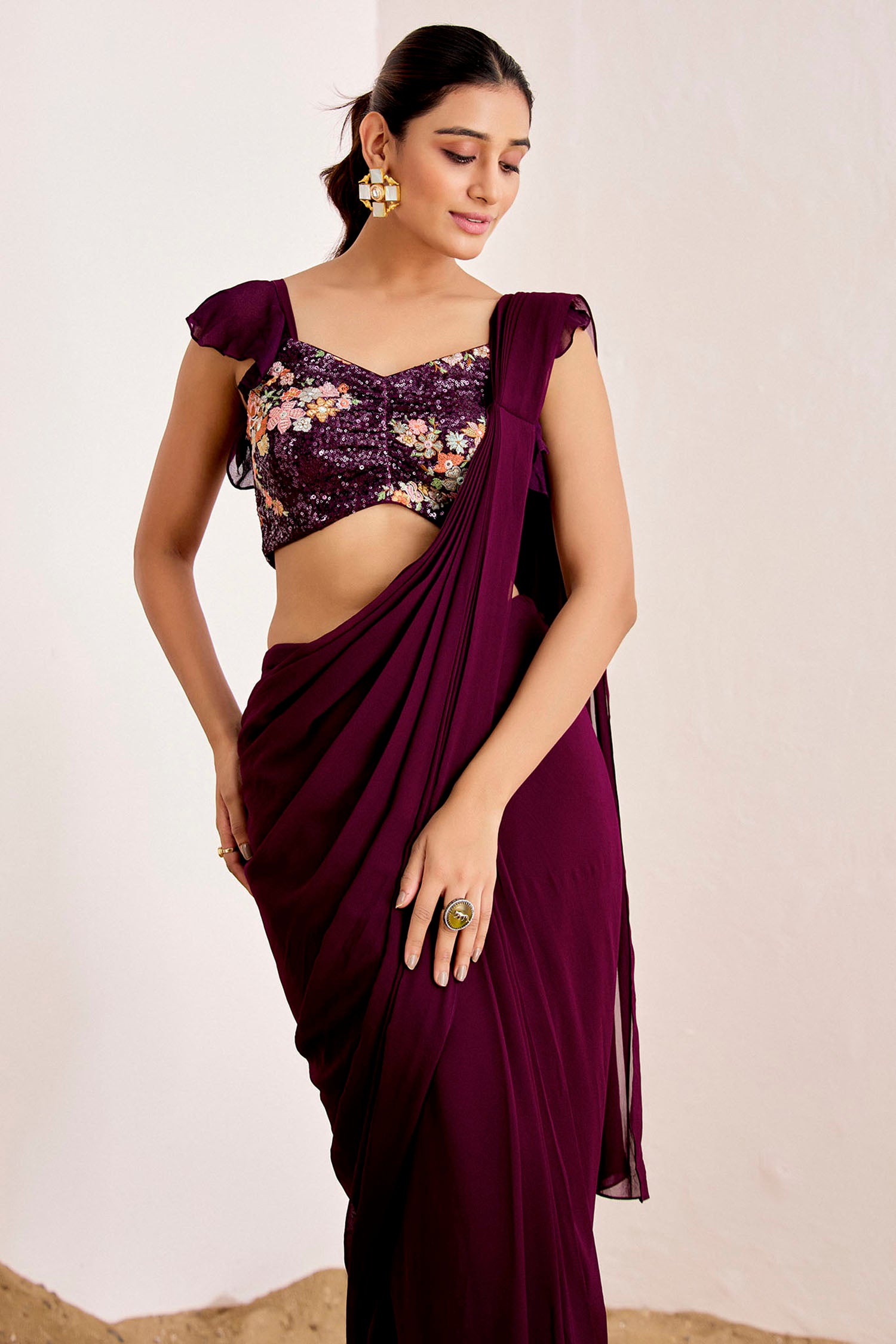 Pre-Draped Saree with Embellished Blouse and Ruching Details