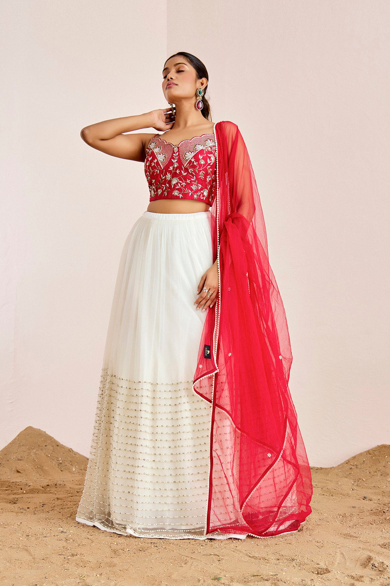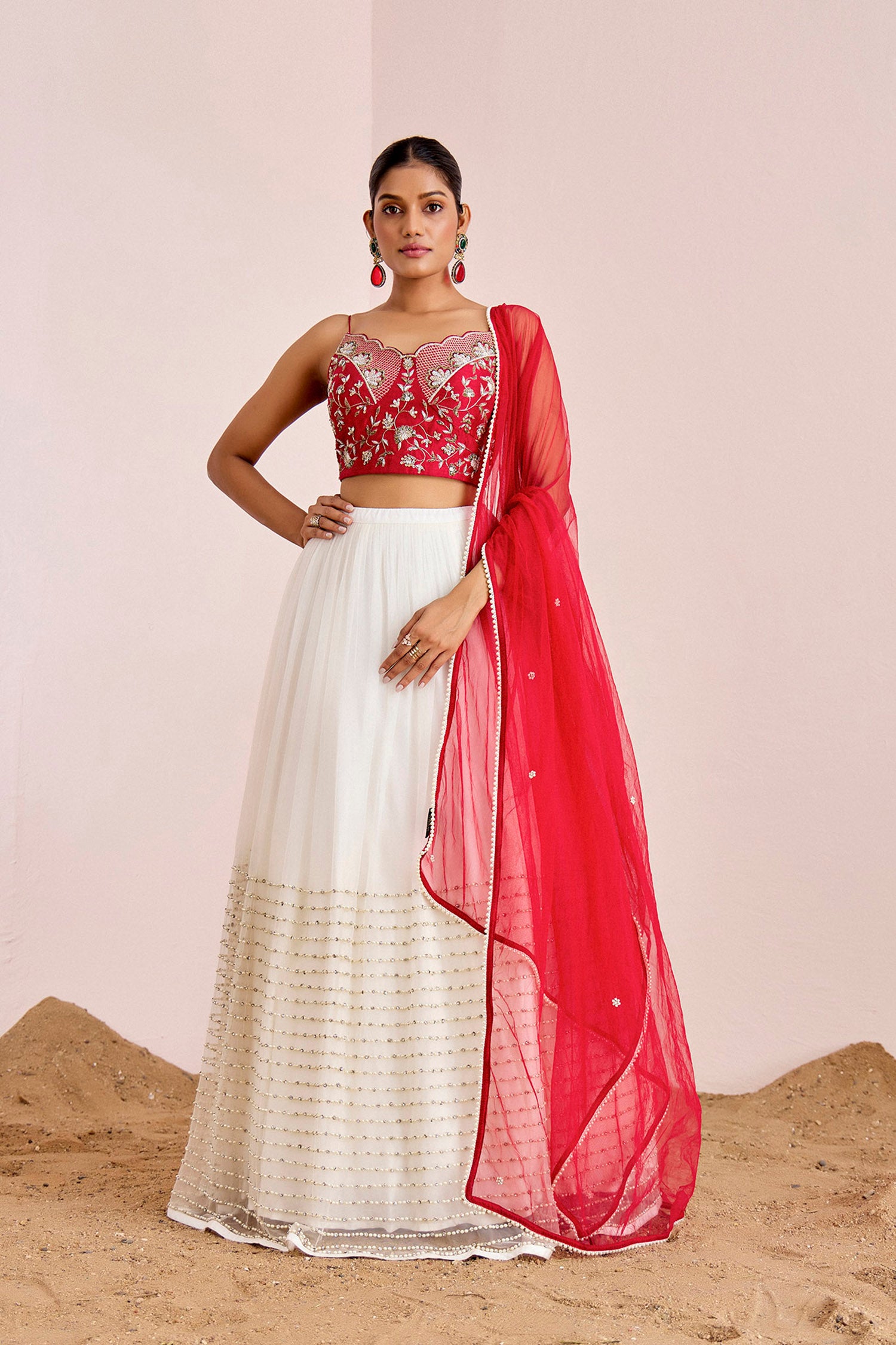 Hand Embroidered Bustier Blouse with Embellished Net Lehenga and Dupatta