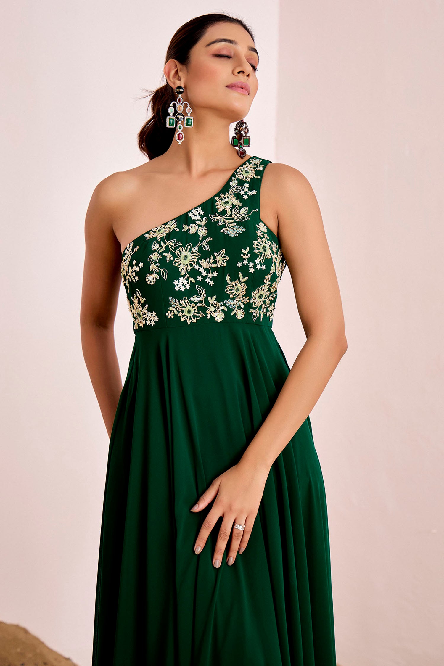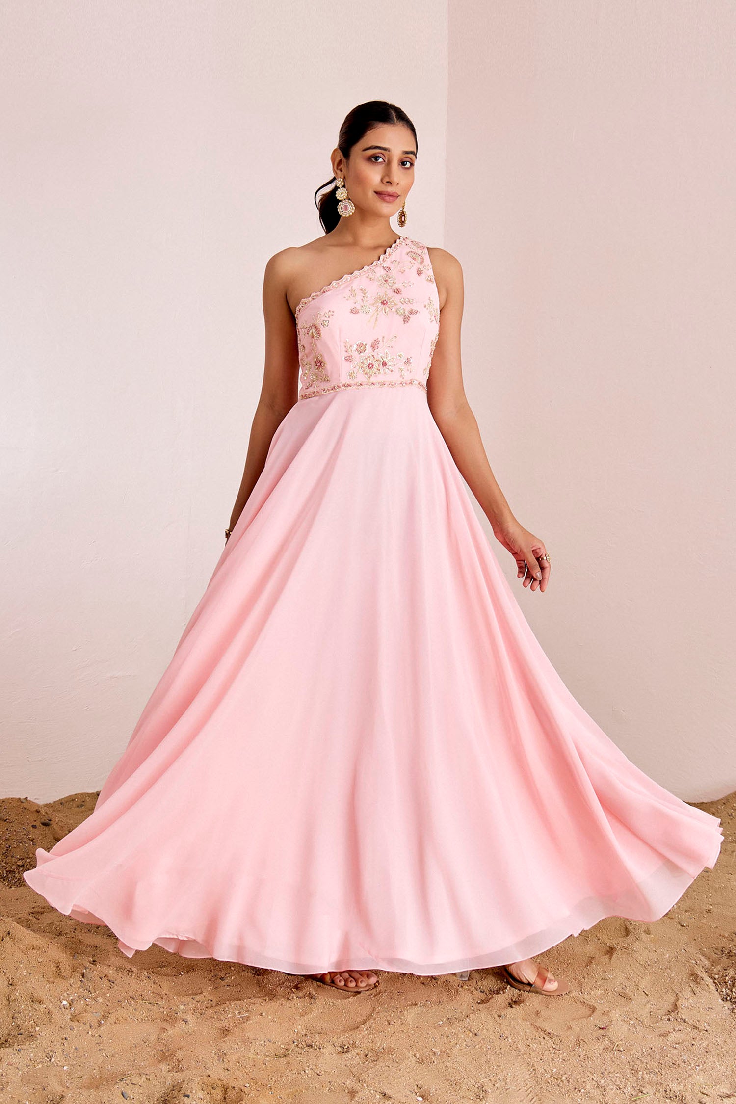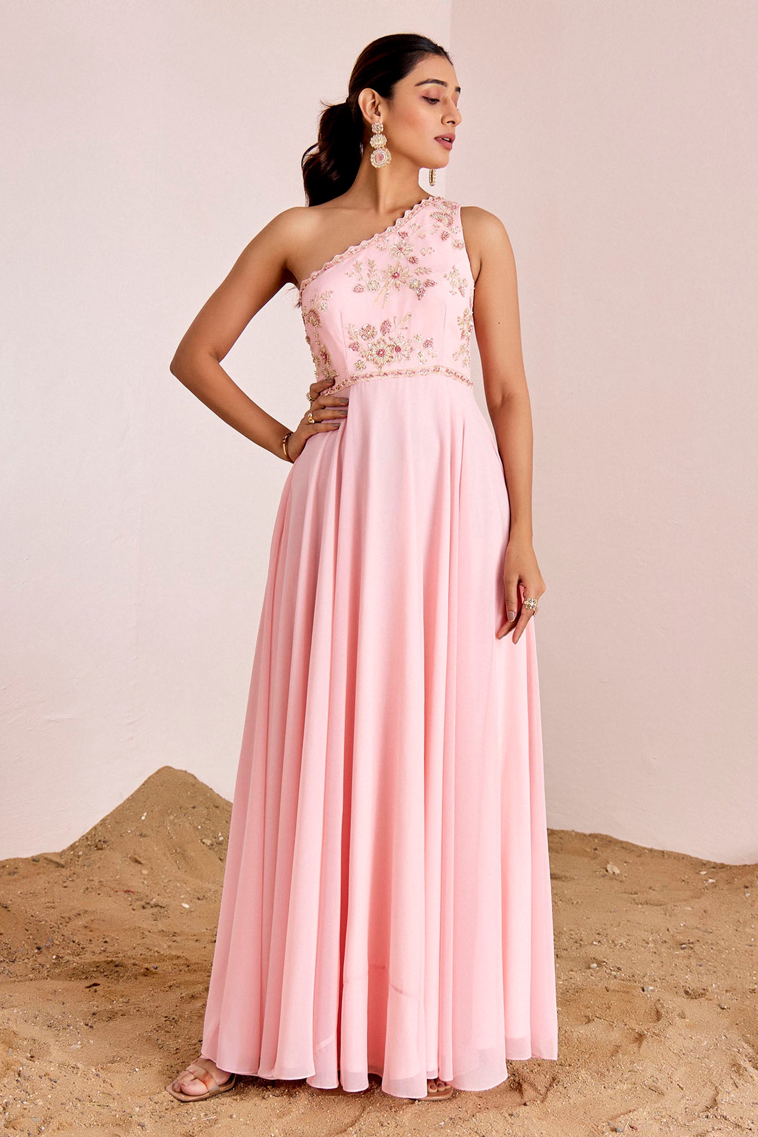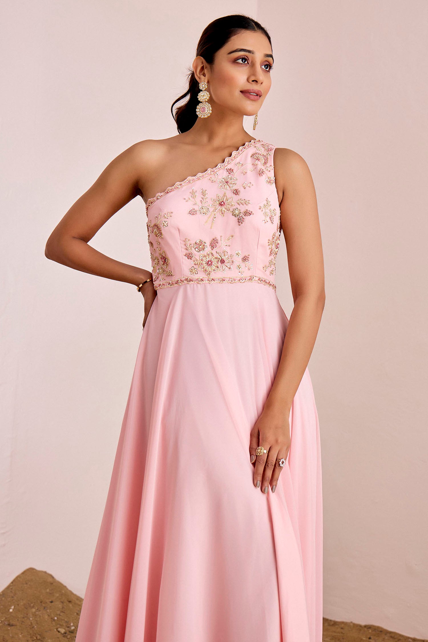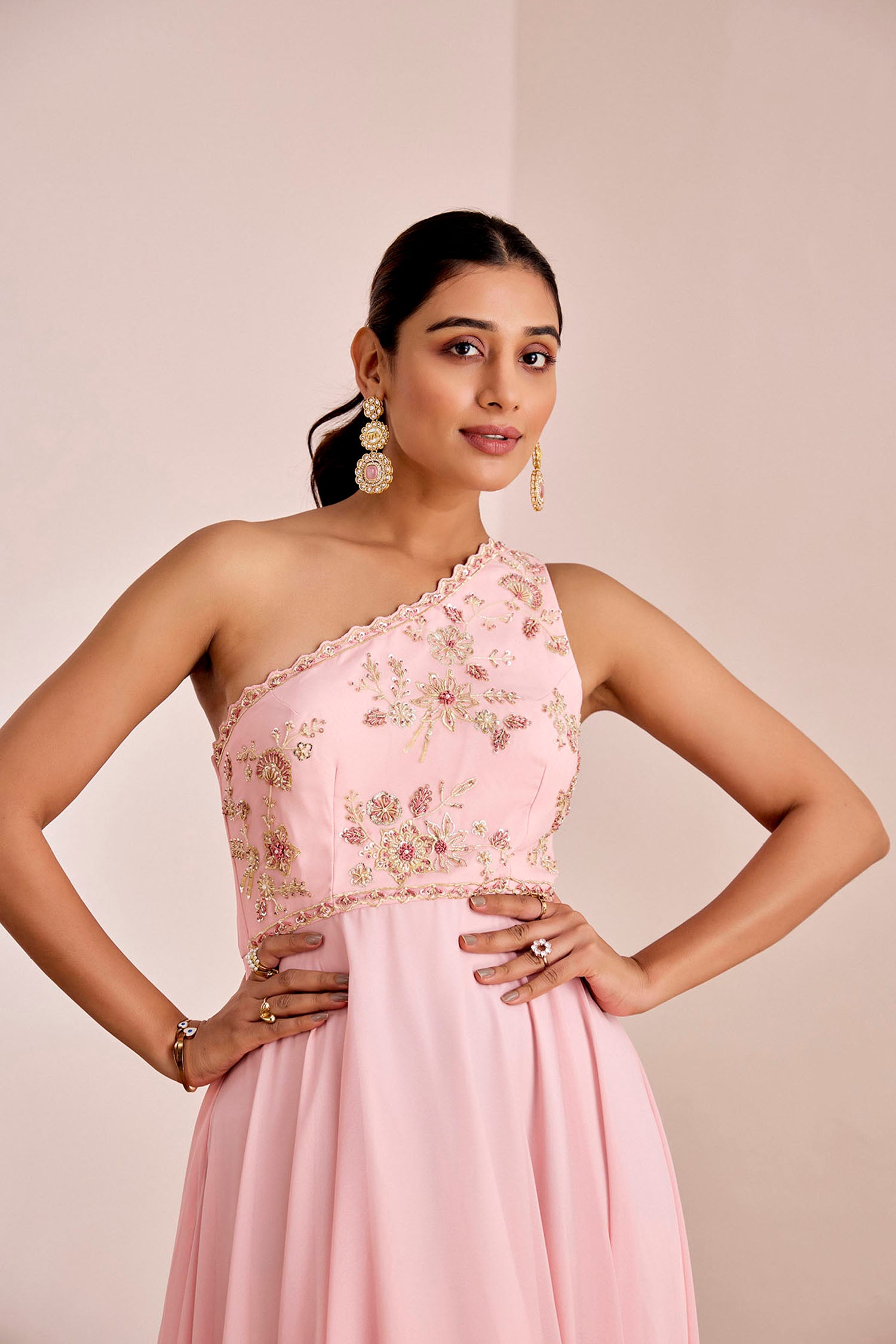 Hand Embroidered One Shoulder Gown with Tucks and Embroidered Strap