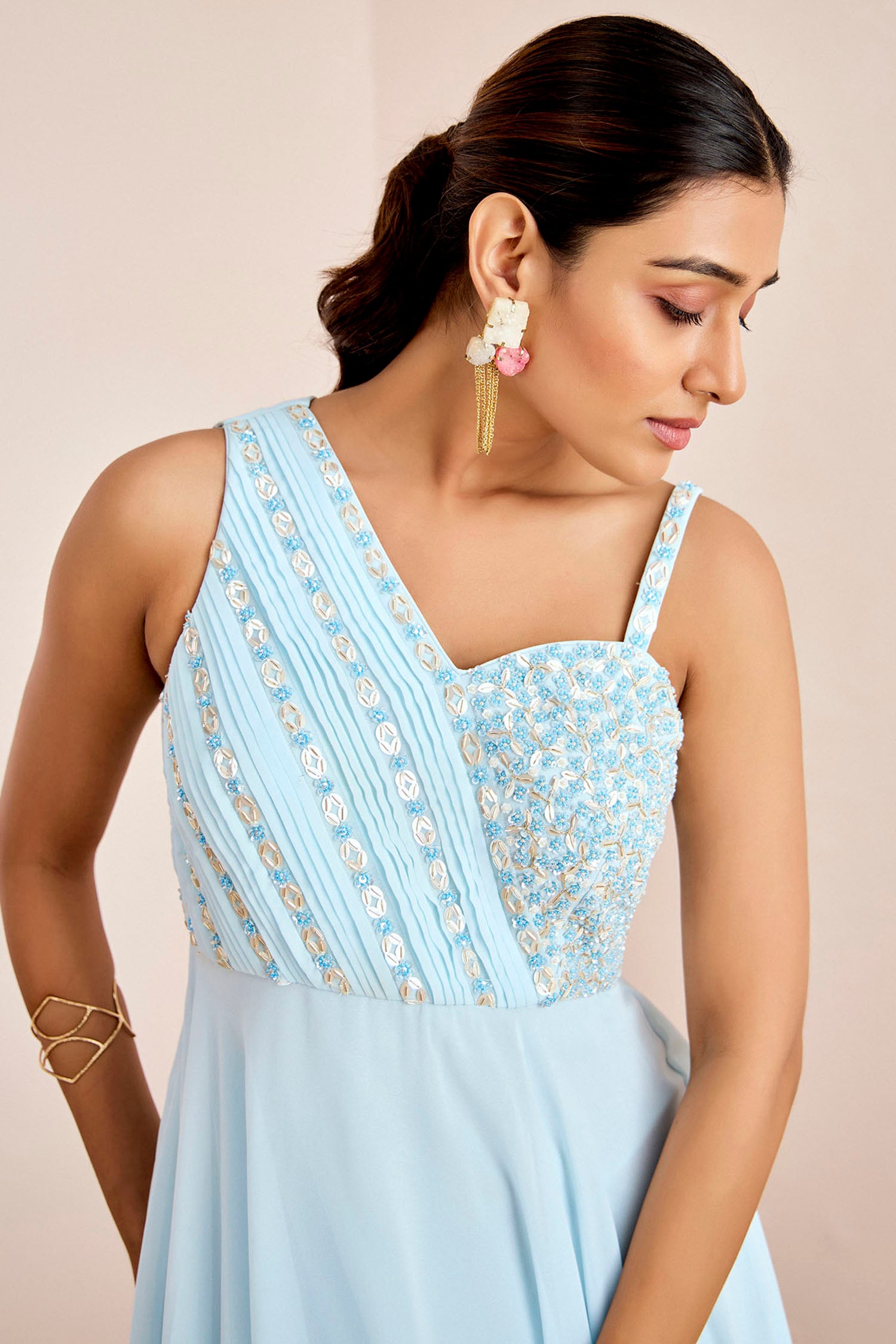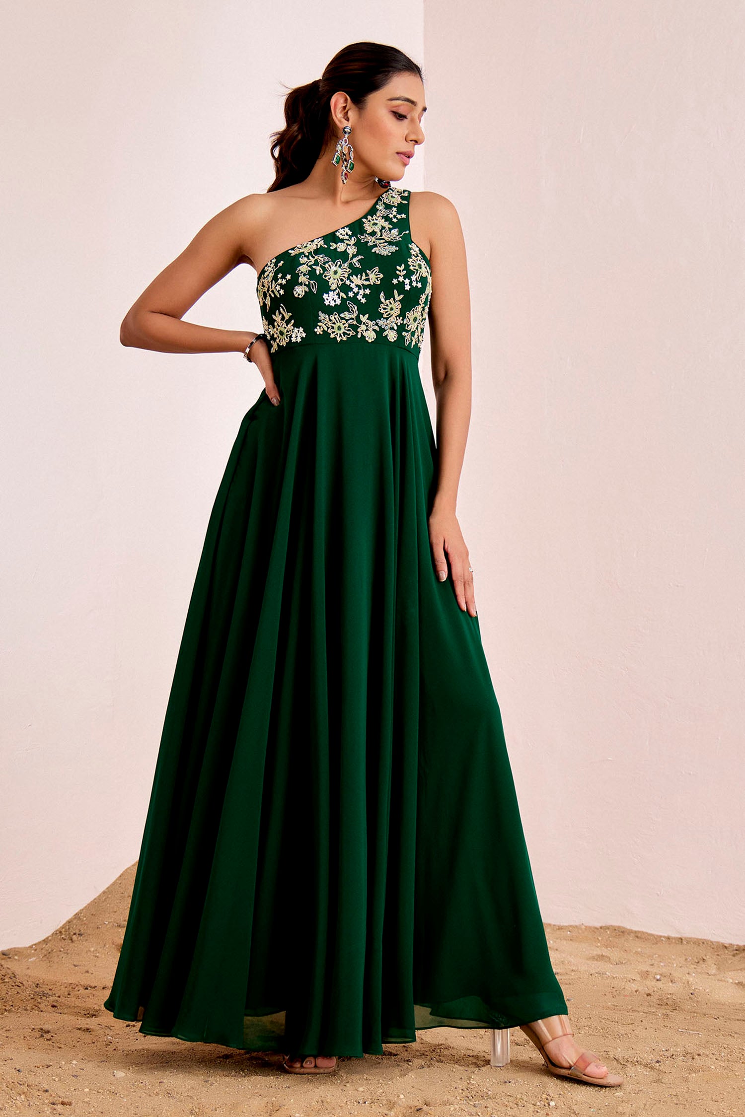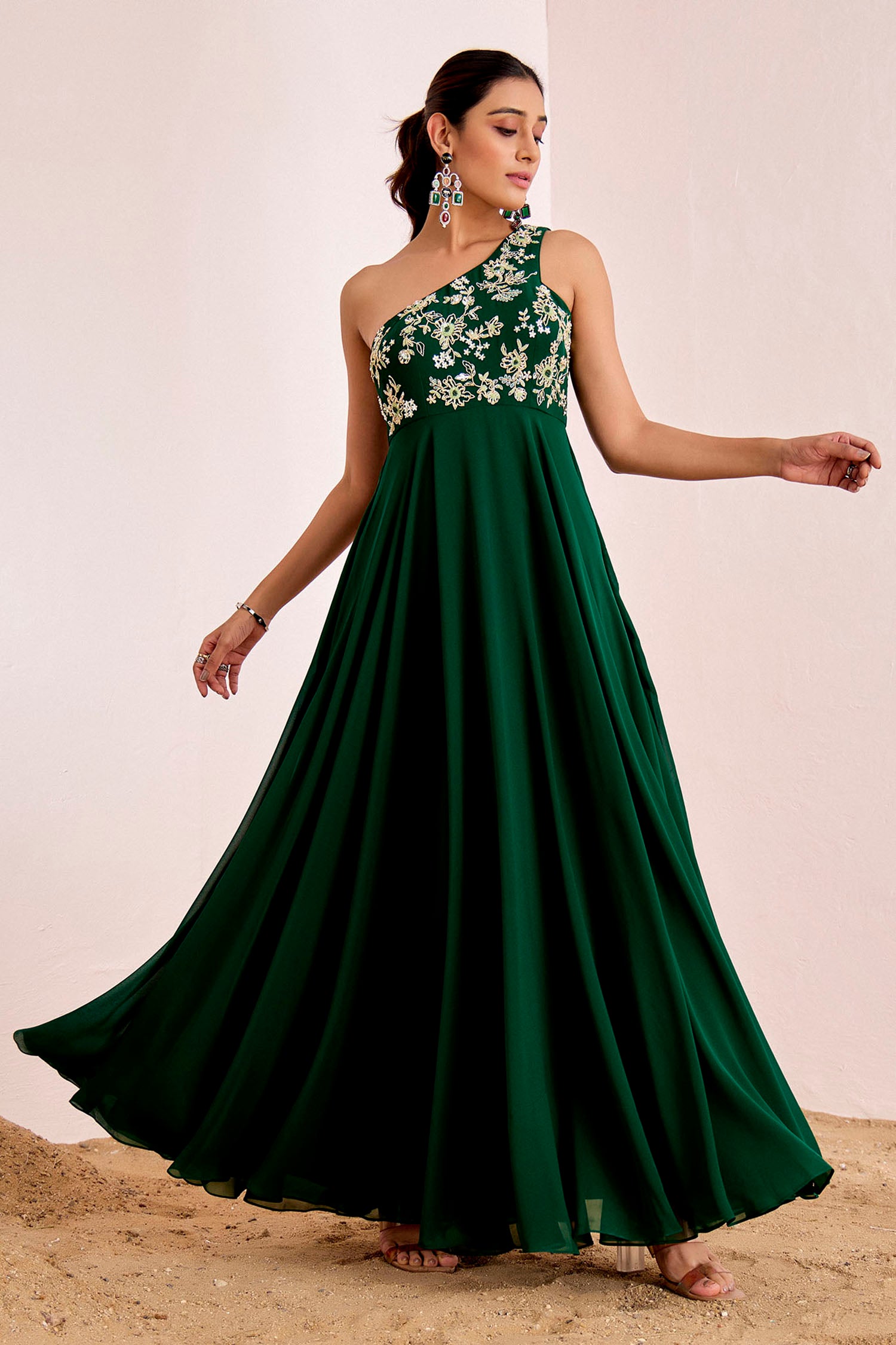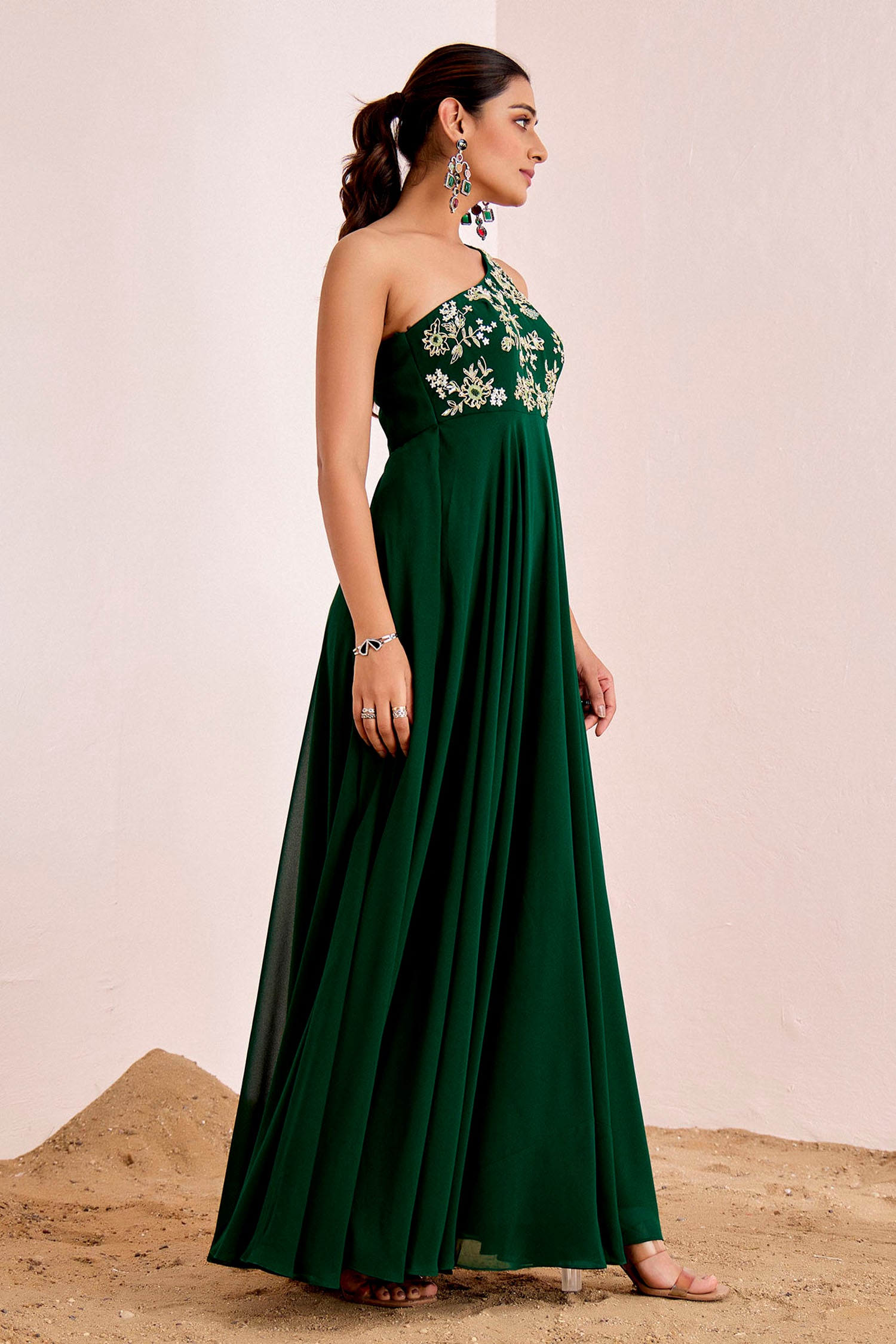 Hand Embroidered One Shoulder Gown with Tucks and Embroidered Strap