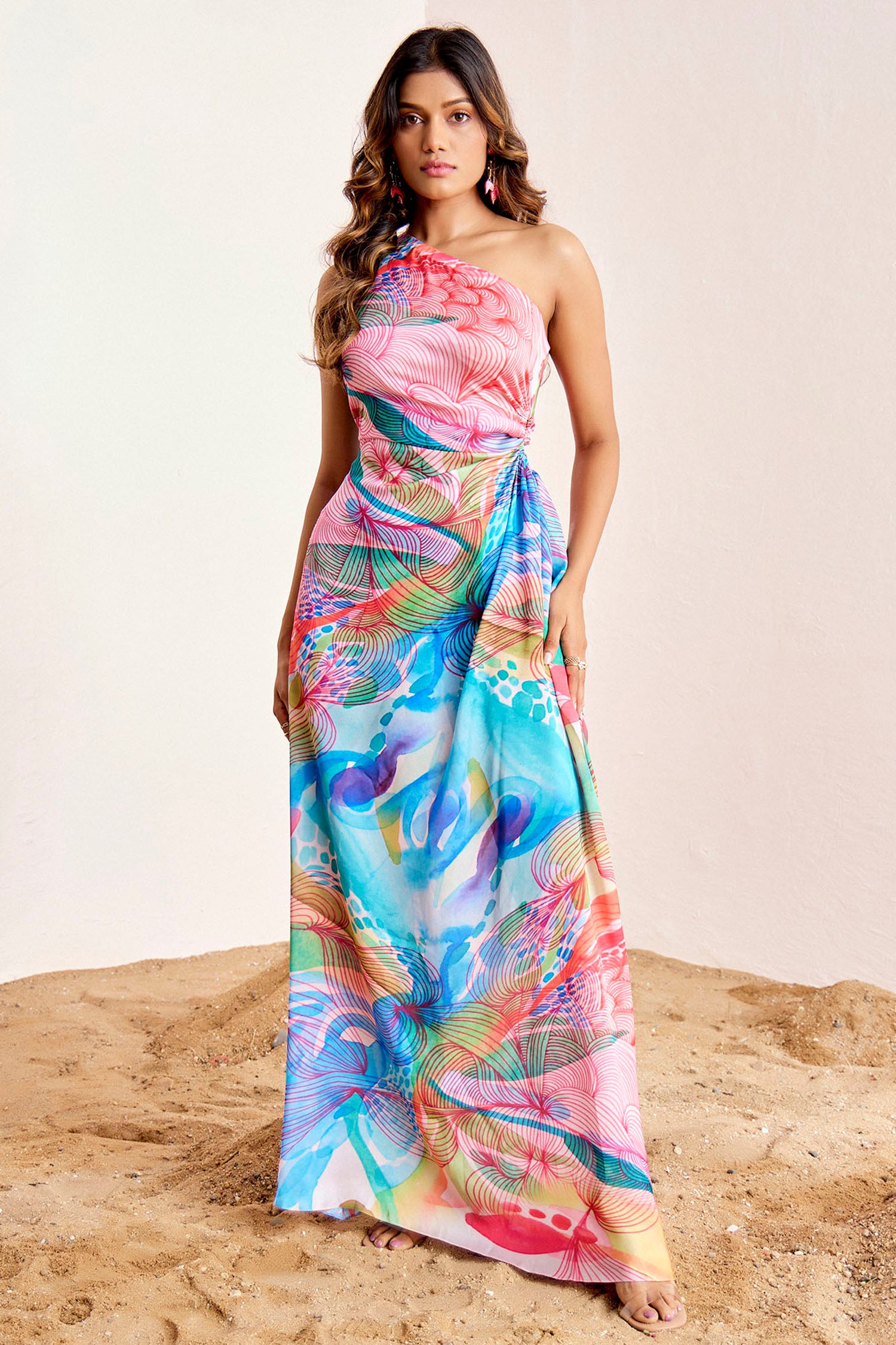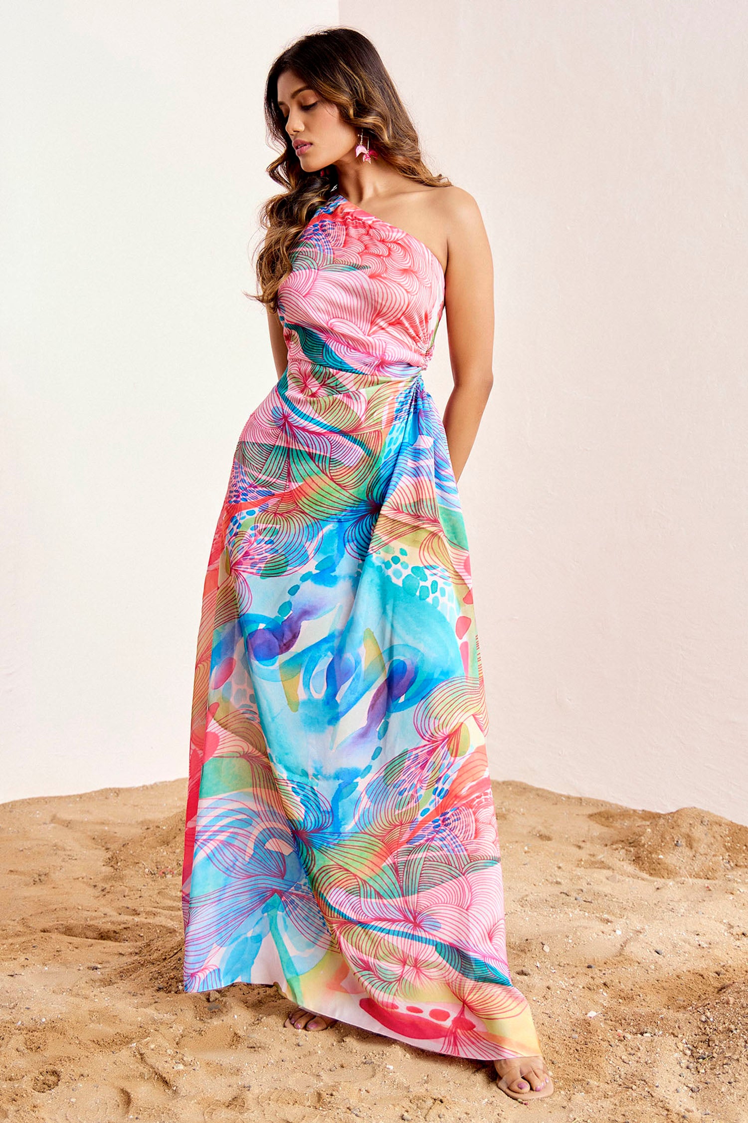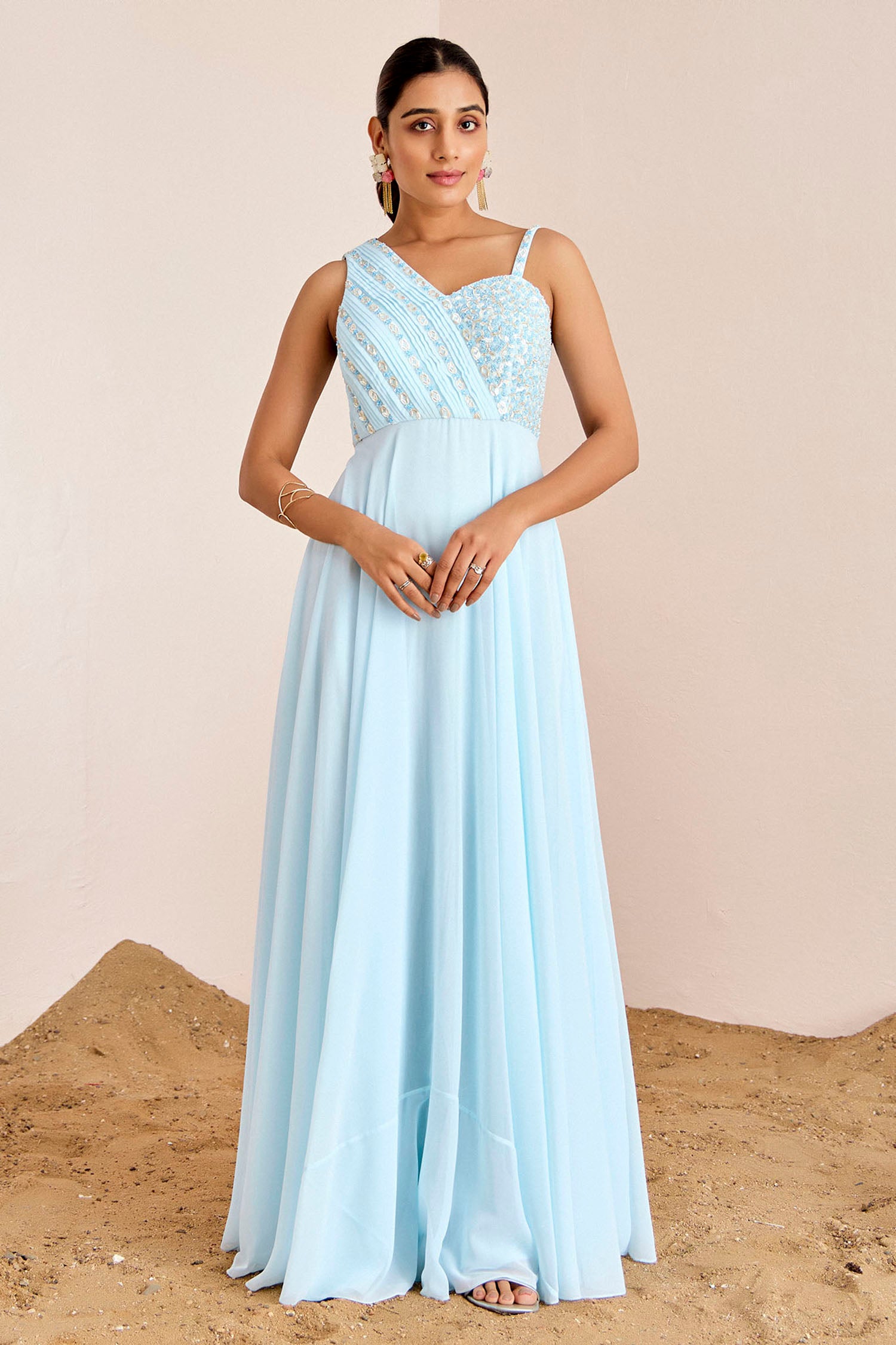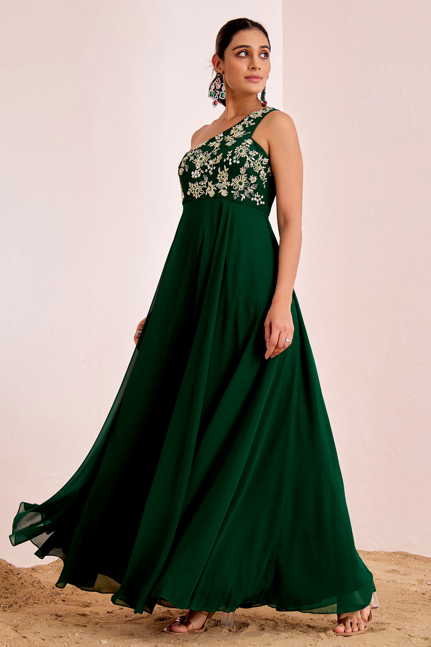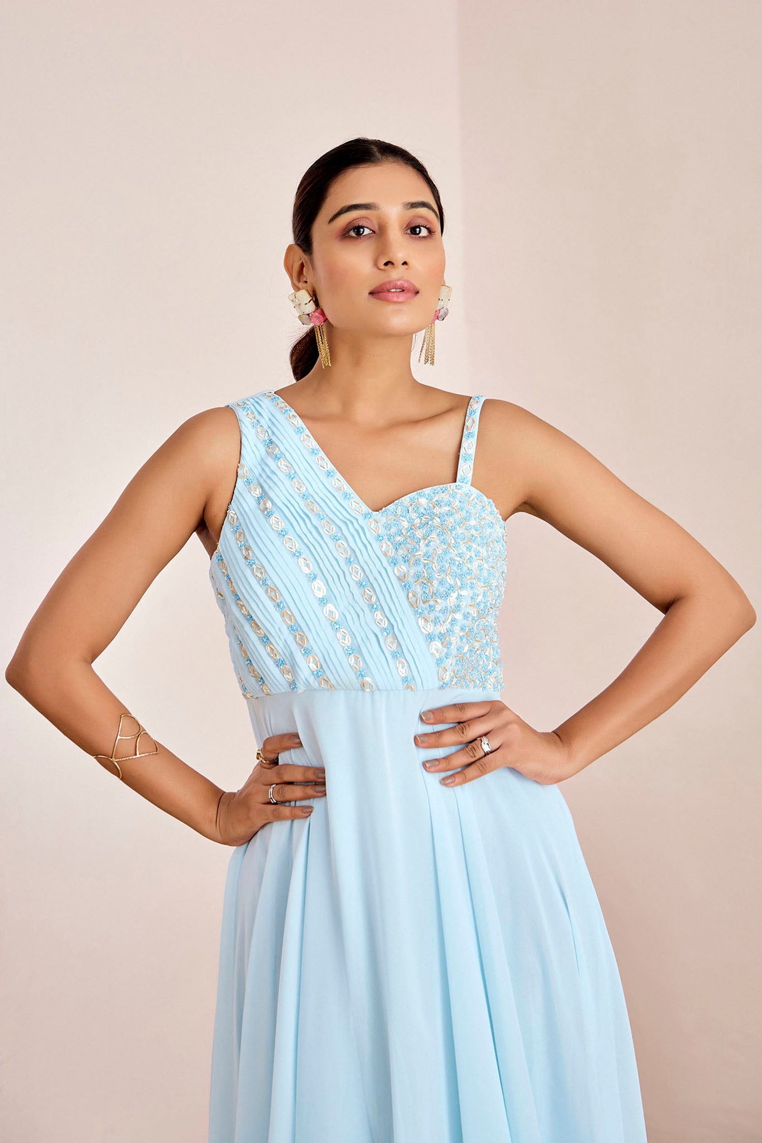 Hand Embroidered One Shoulder Gown with Tucks and Embroidered Strap