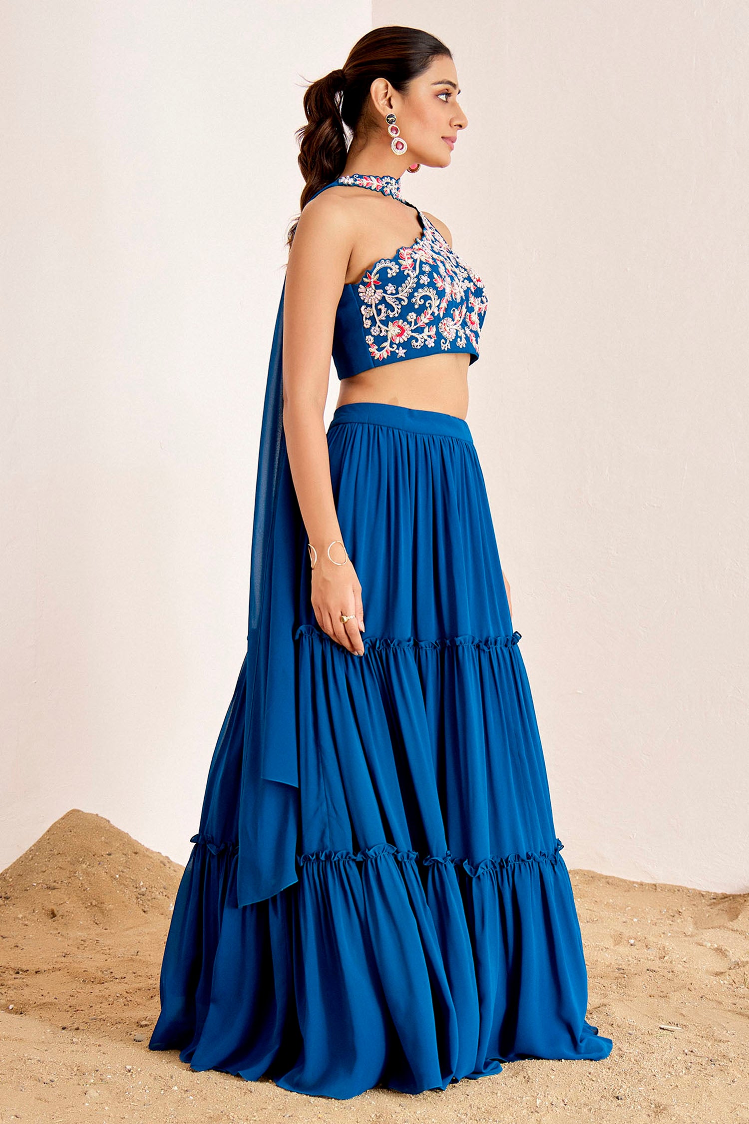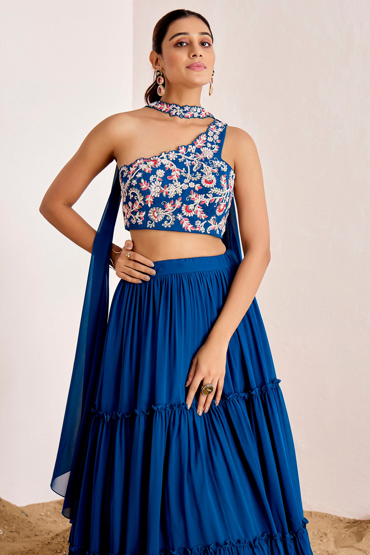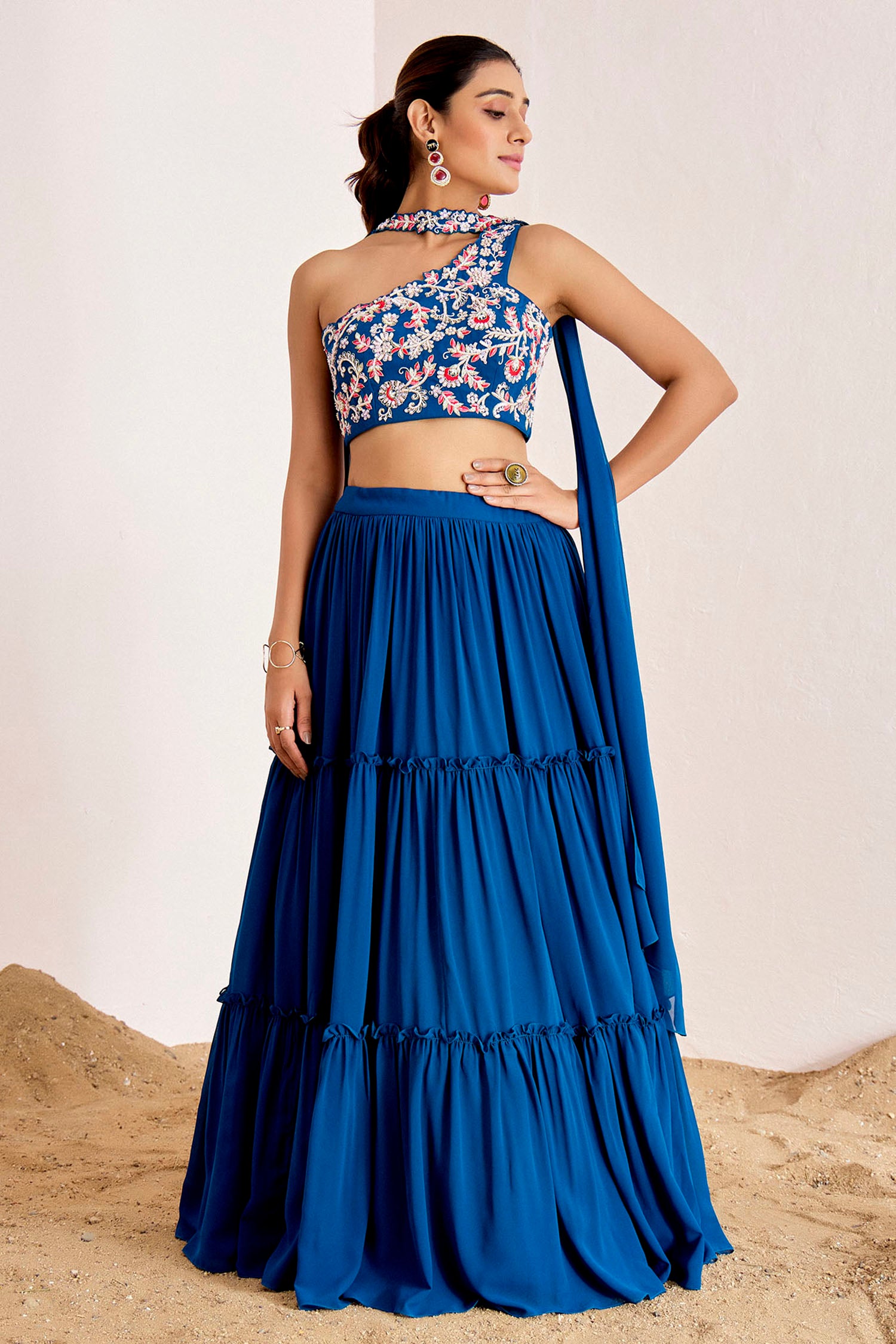 Tiered Plain Lehenga with One Shoulder Embroidered Blouse and Choker Dupatta