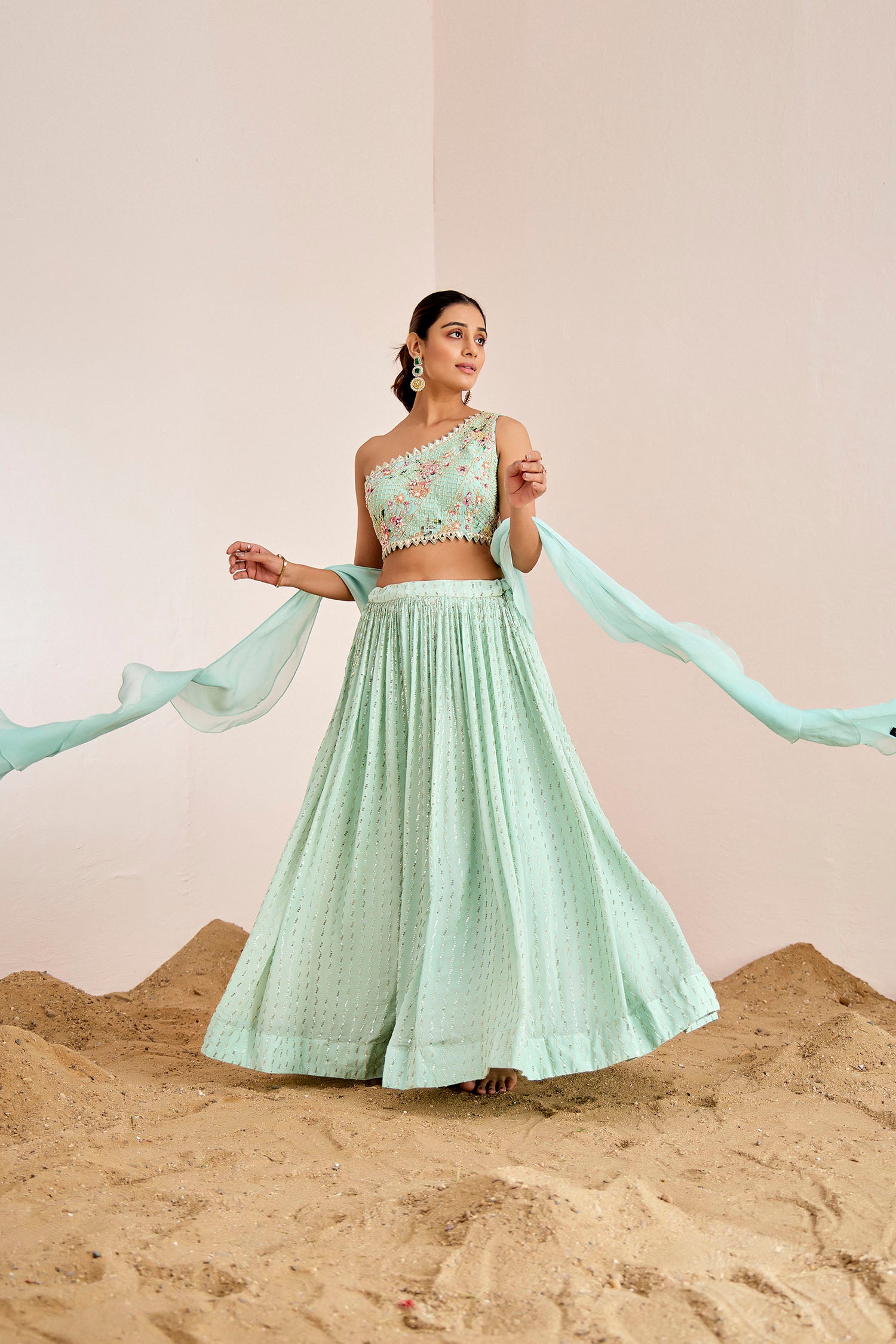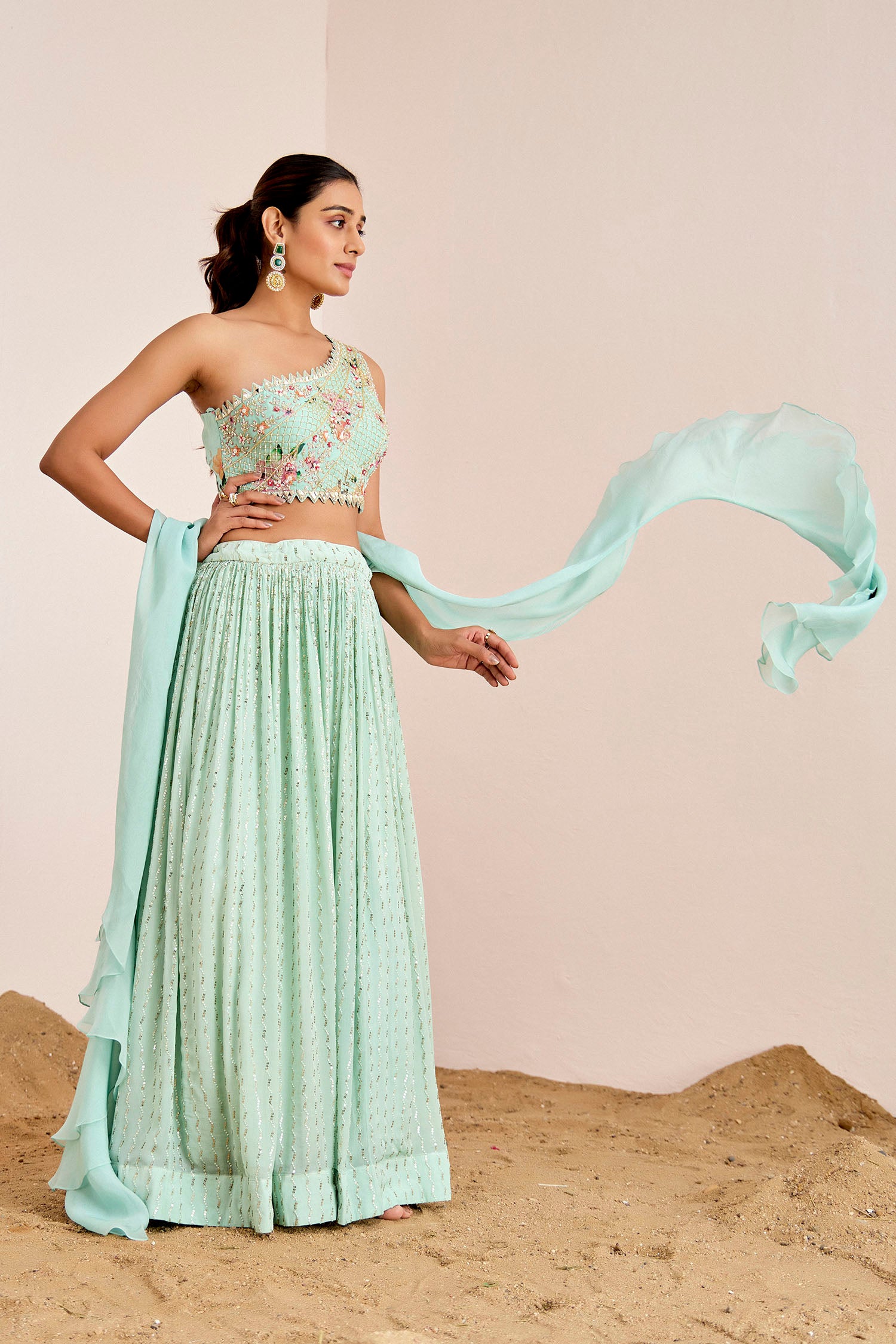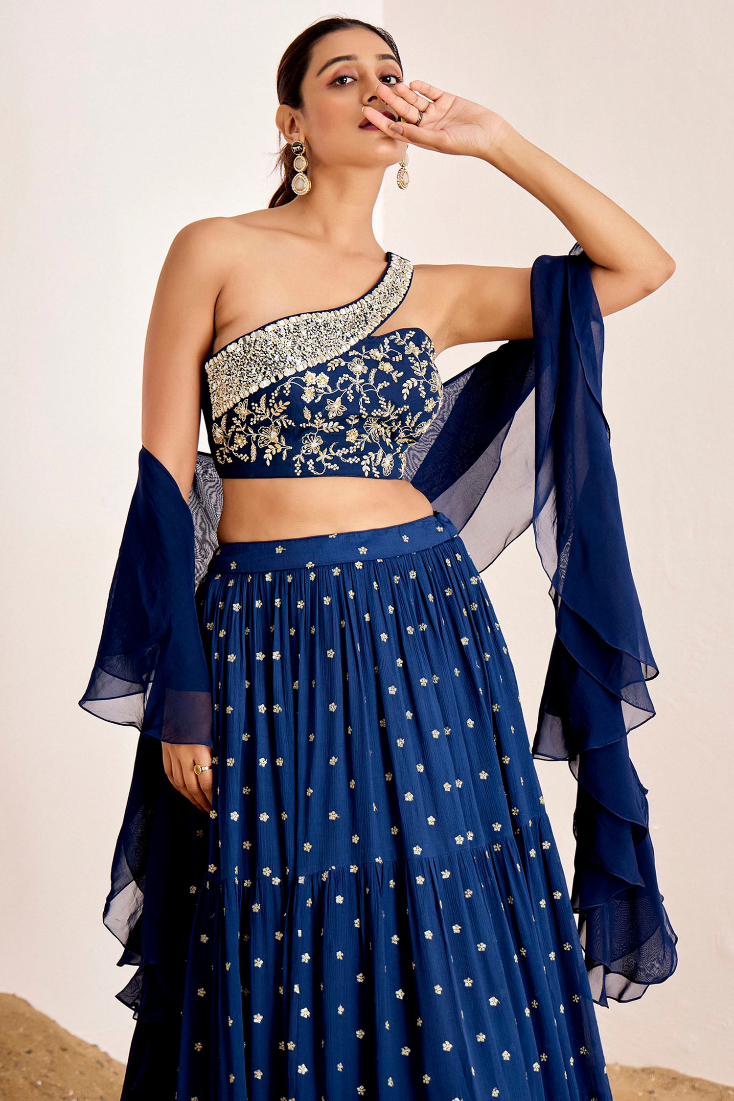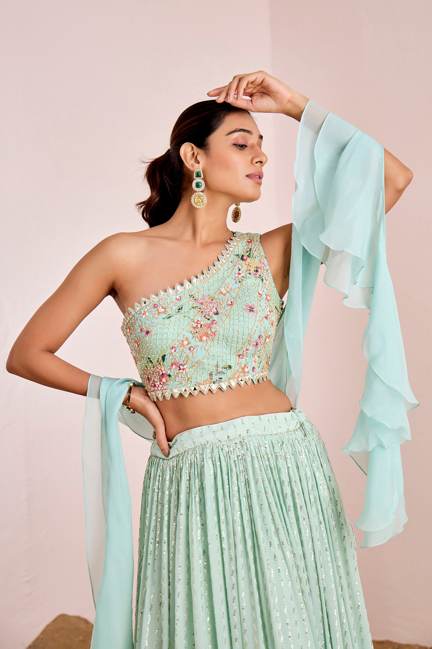 Sequin Embroidered One Shoulder Blouse with Plain Lehenga and Ruffle Dupatta