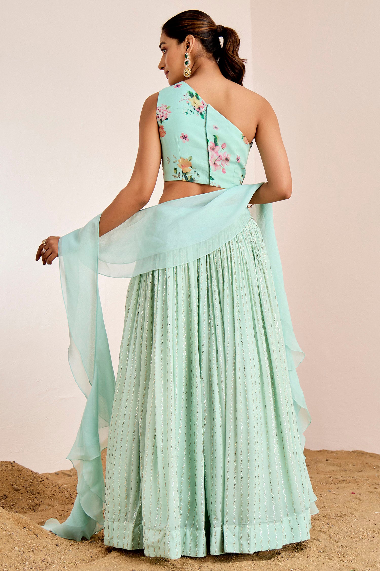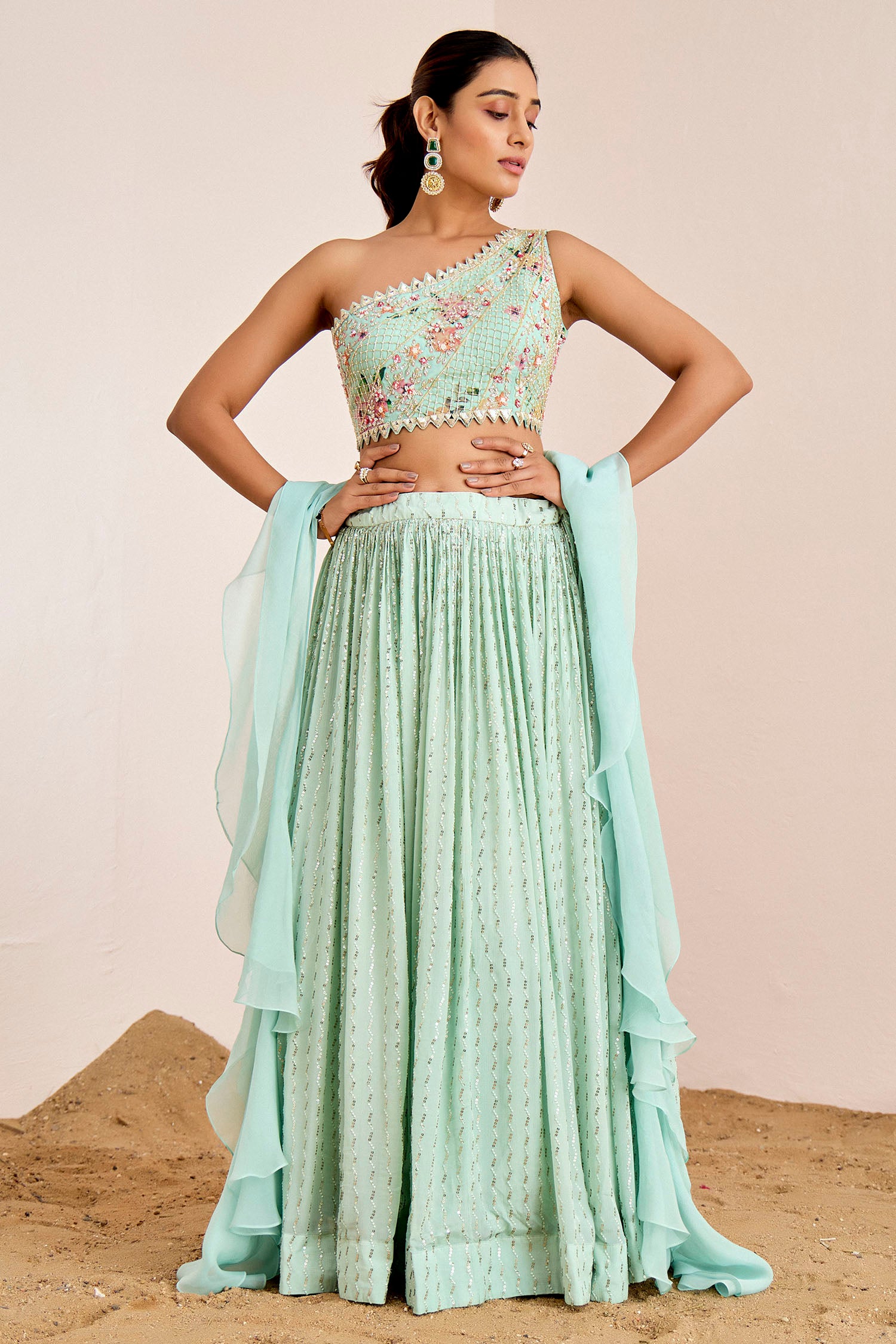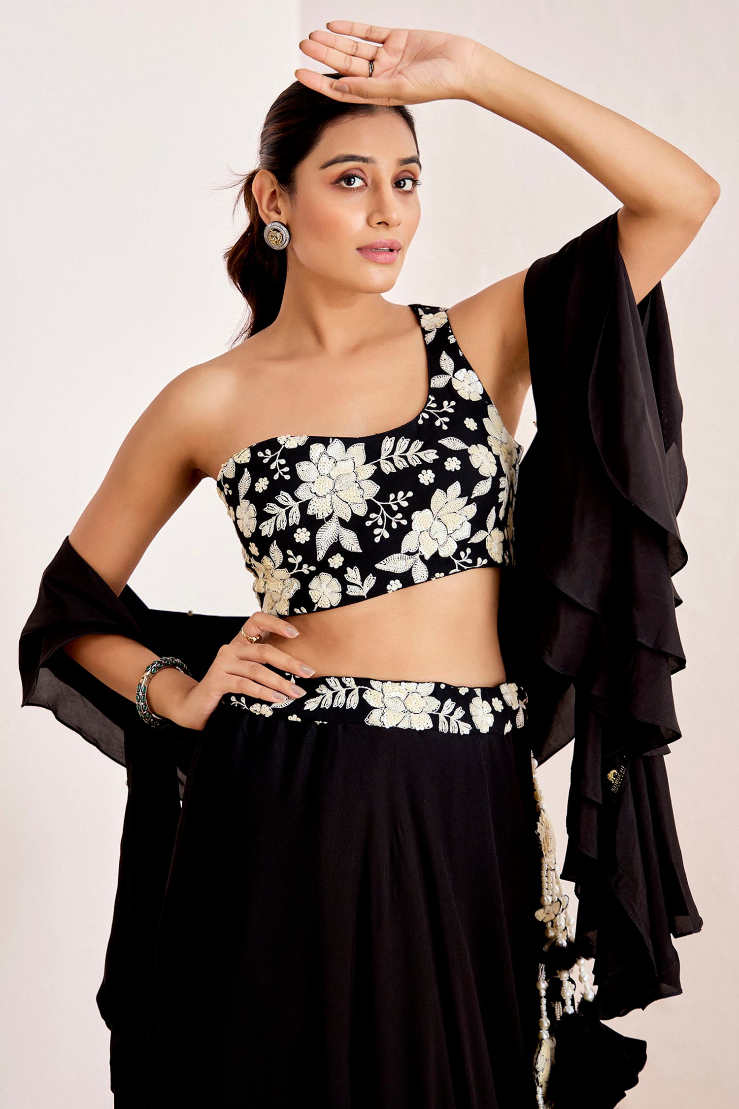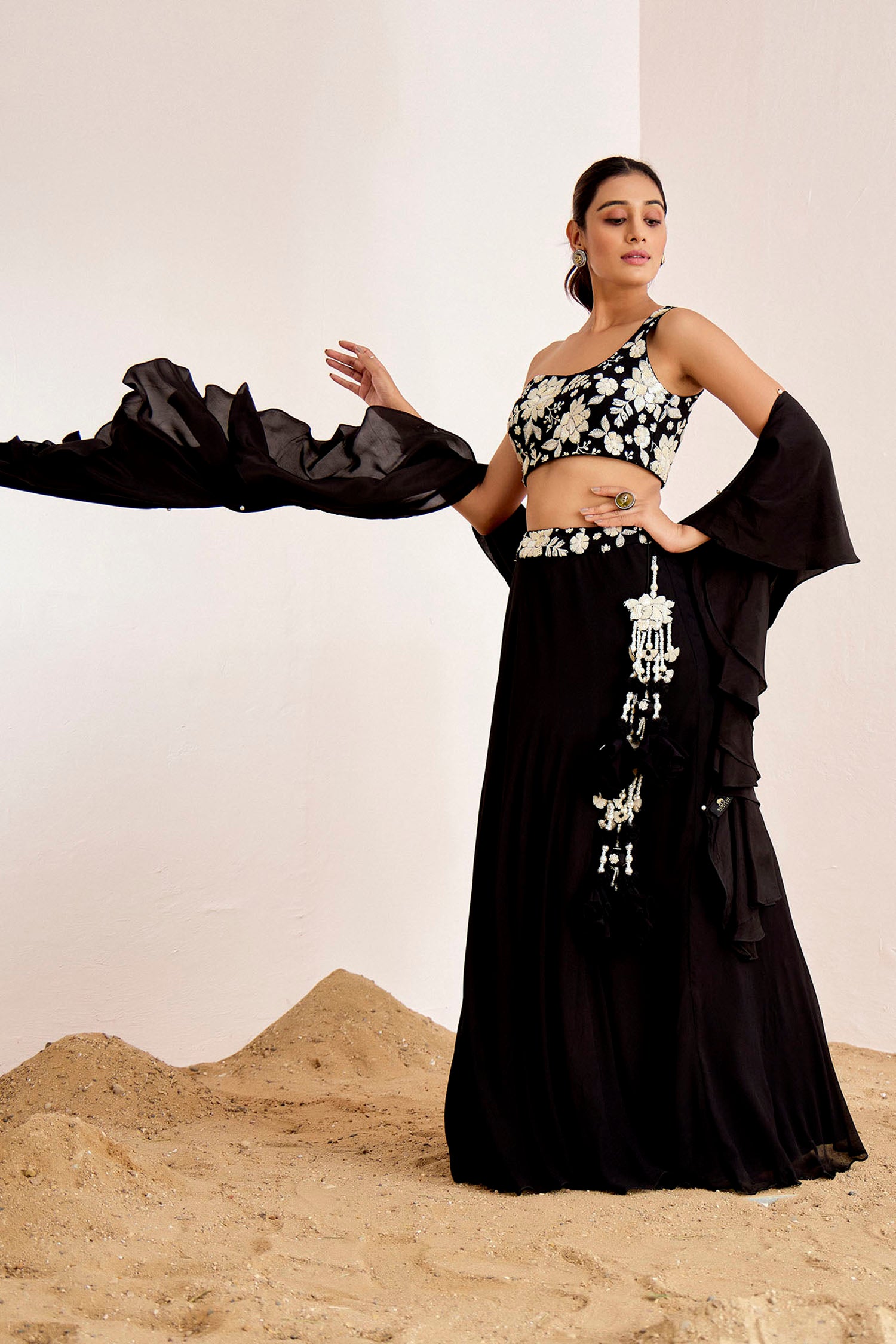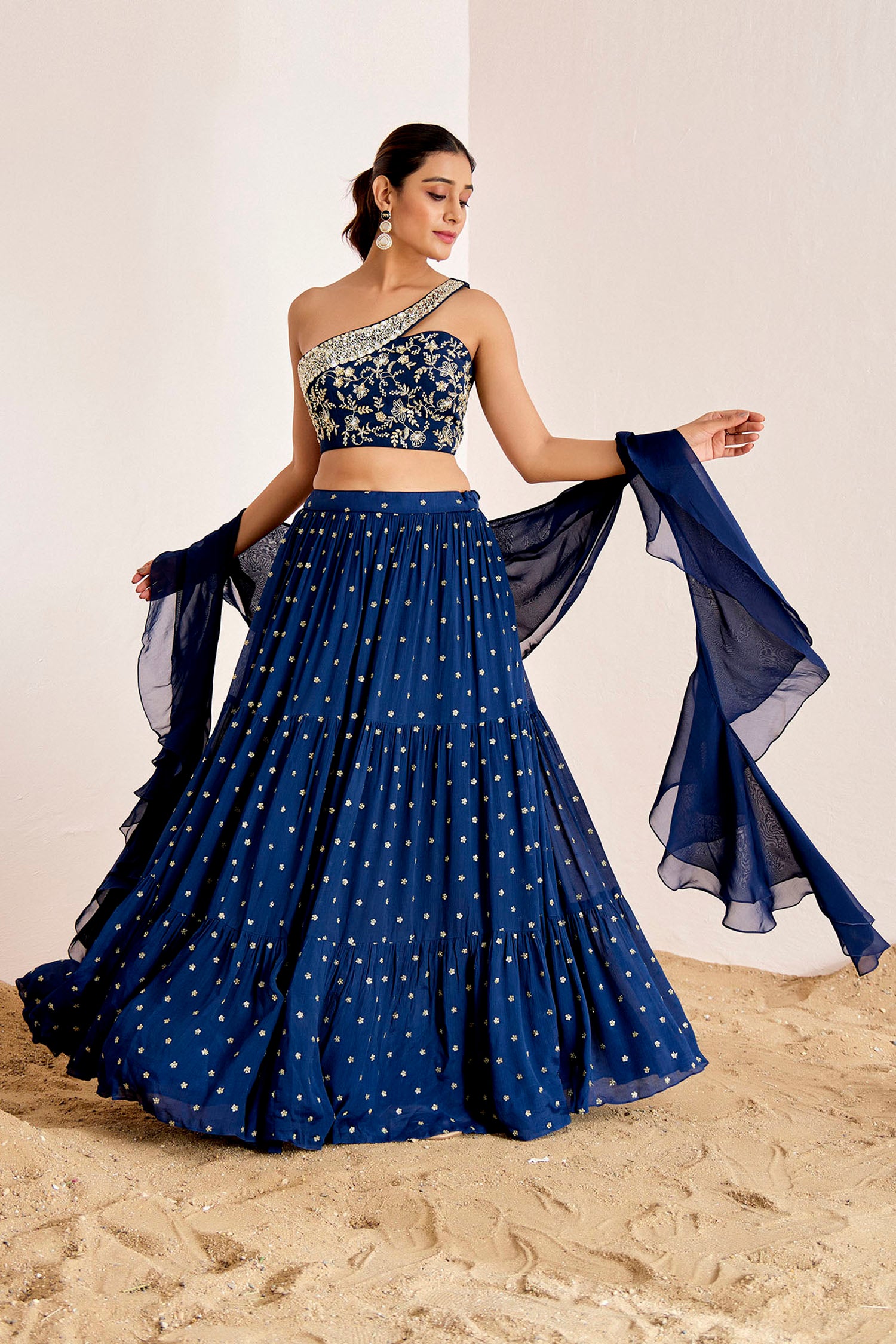 Sequin Embroidered One Shoulder Blouse with Plain Lehenga and Ruffle Dupatta