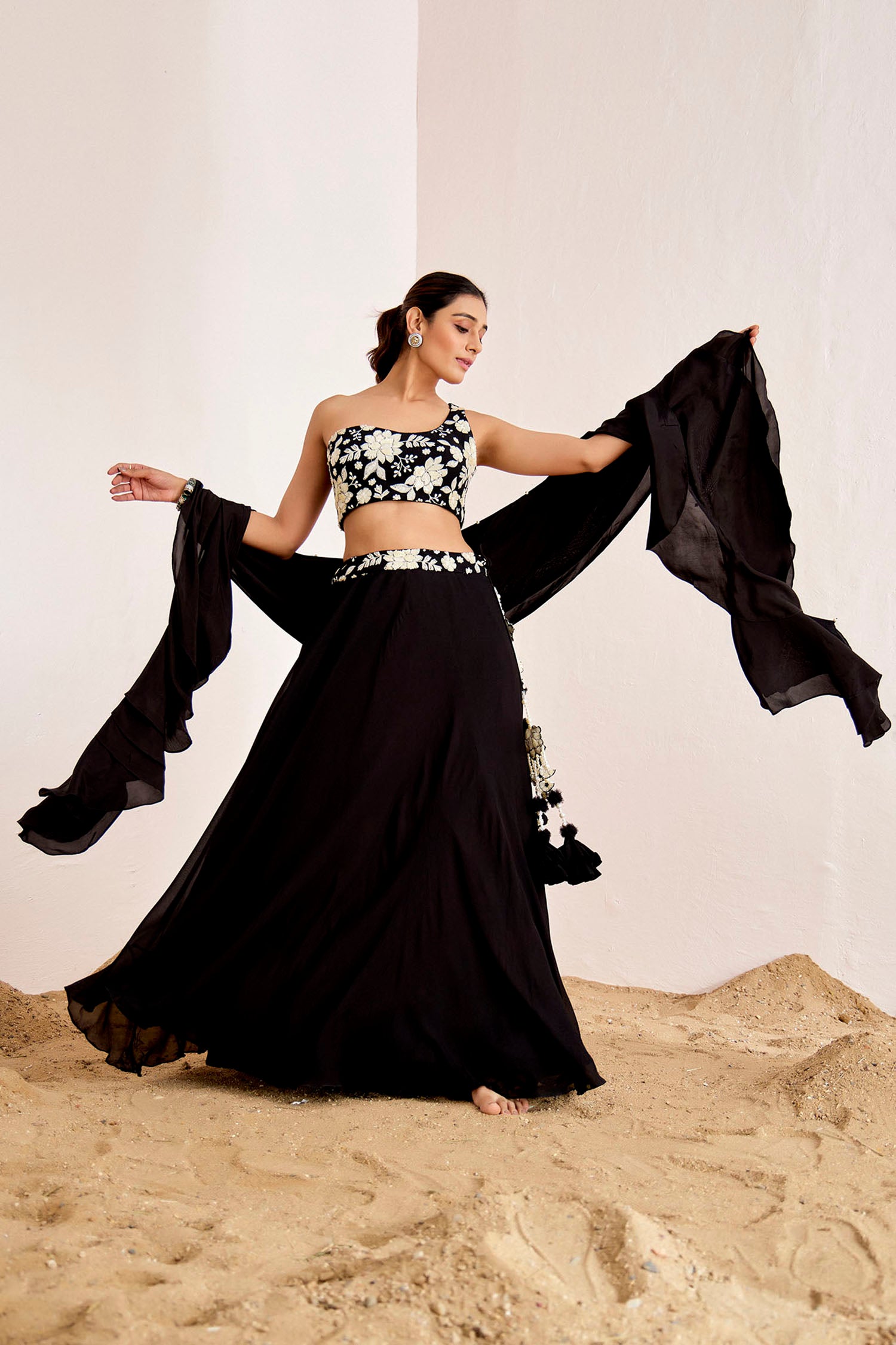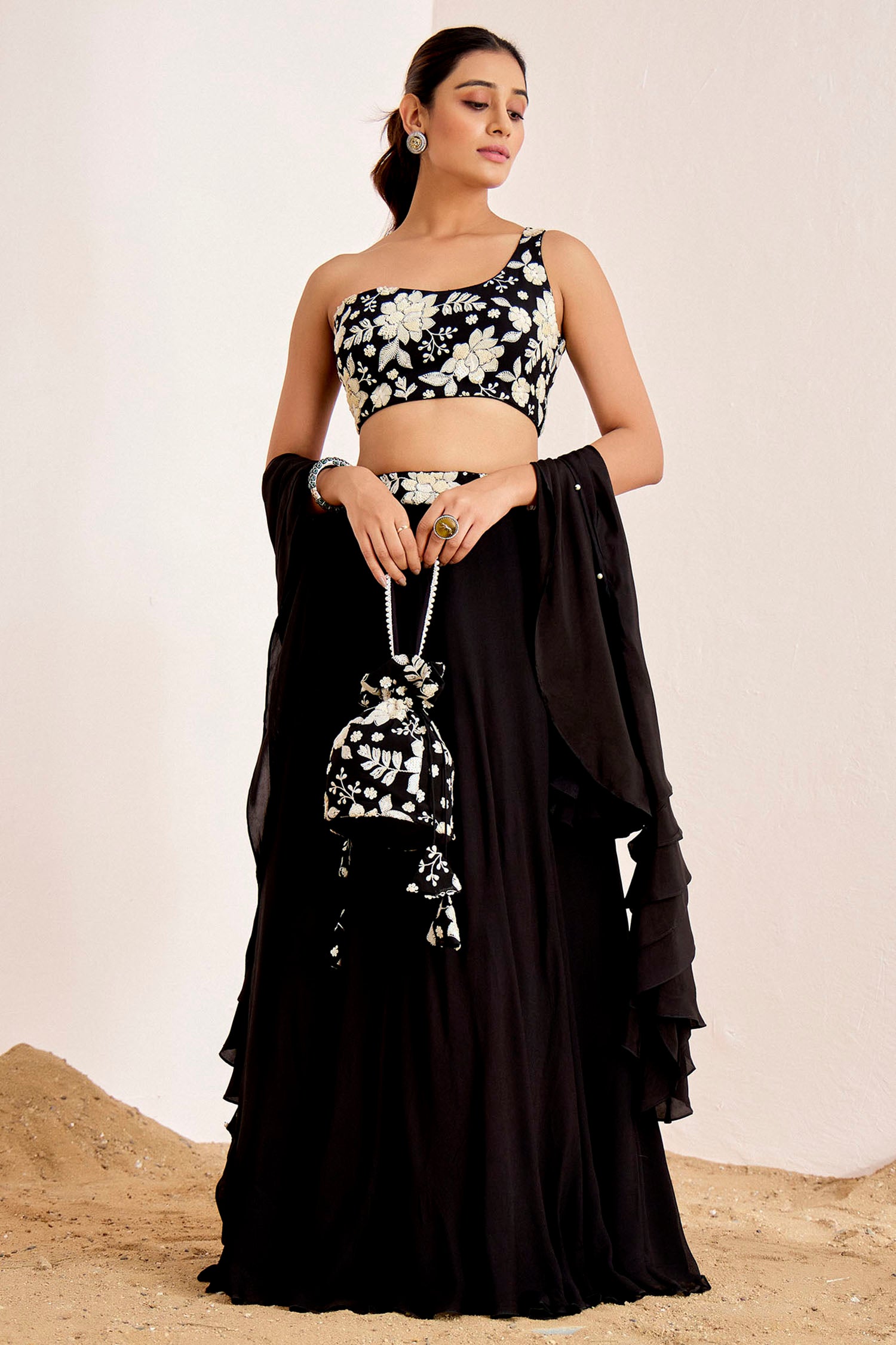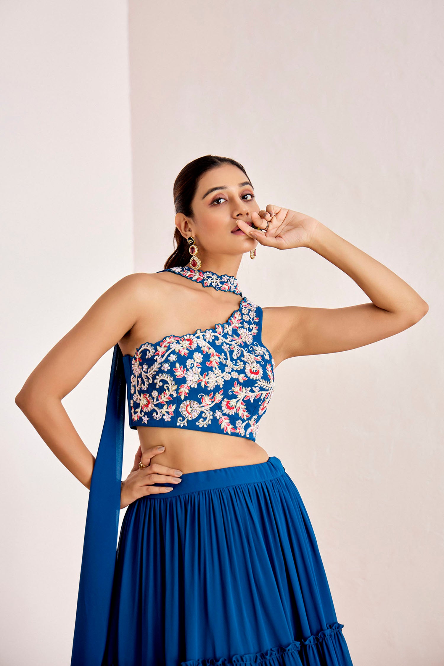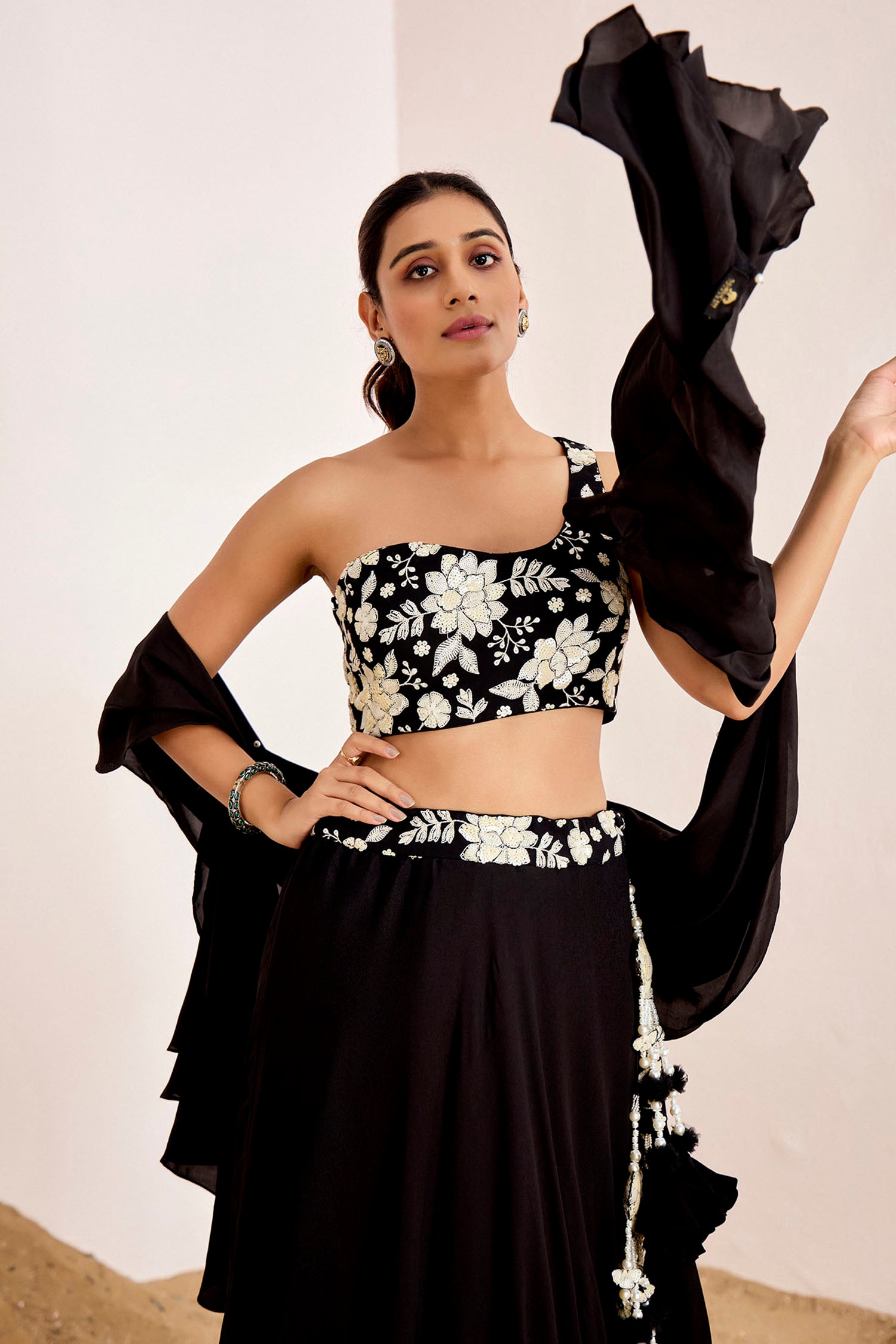 Sequin Embroidered One Shoulder Blouse with Plain Lehenga and Ruffle Dupatta