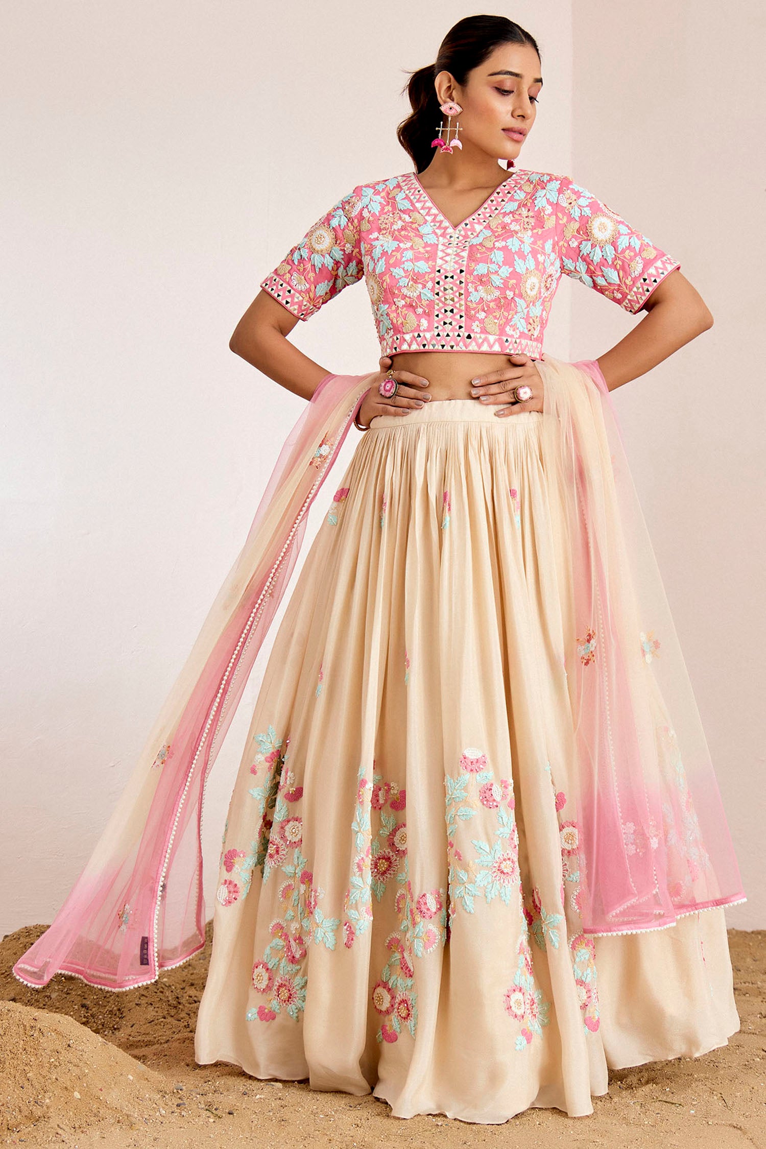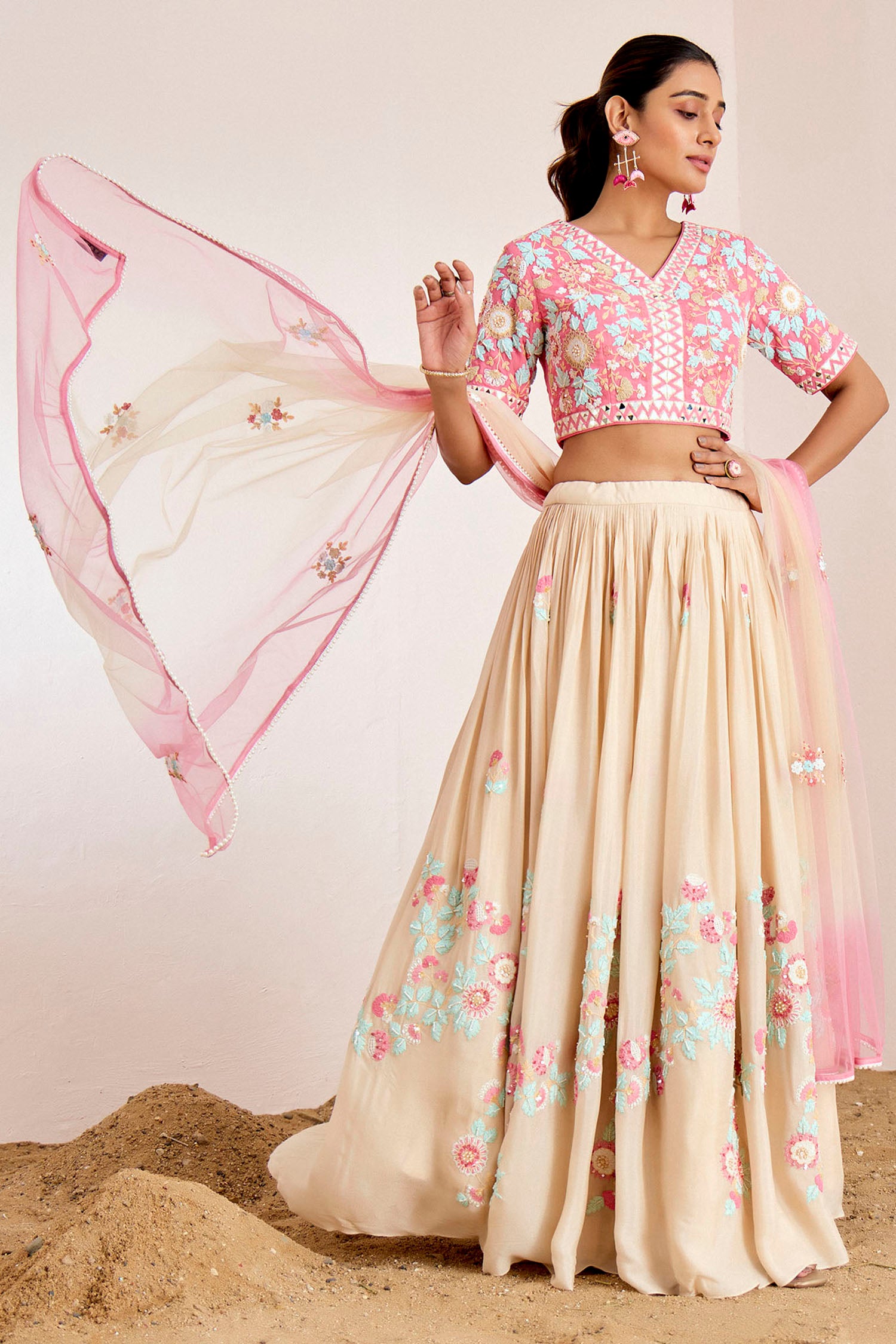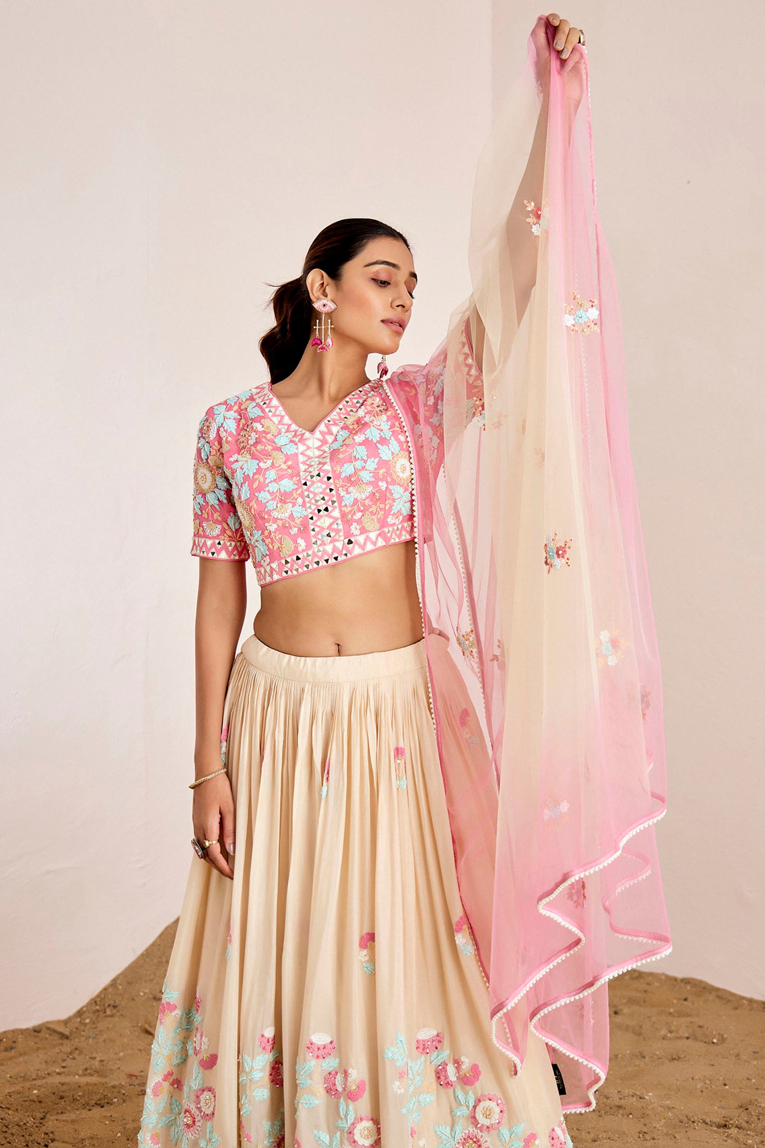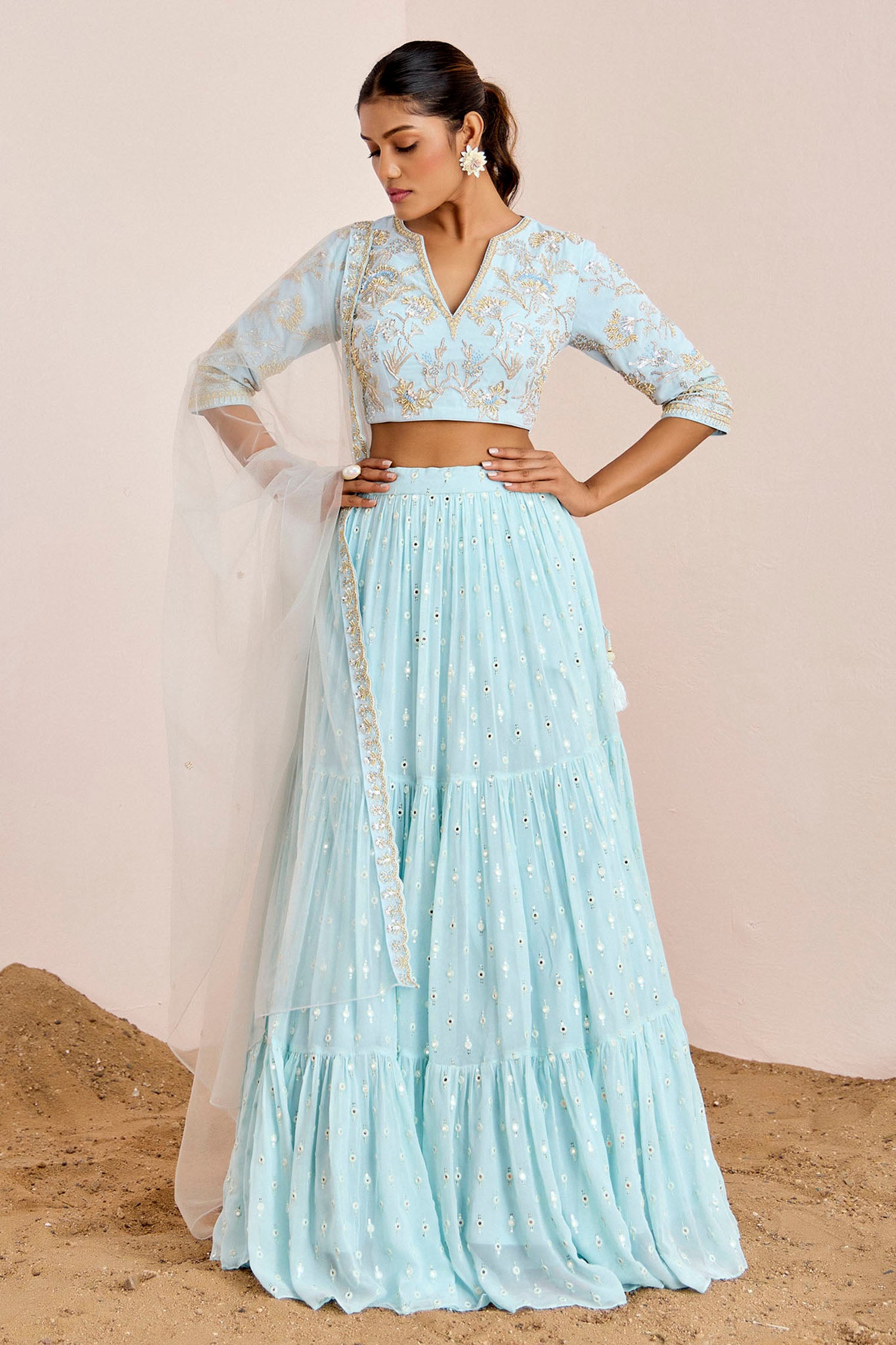 Mirror Work Blouse with Embroidered Lehenga and Shaded Net Dupatta
