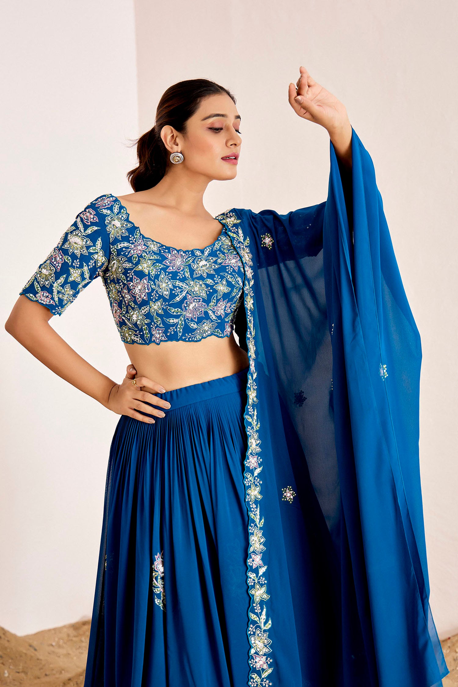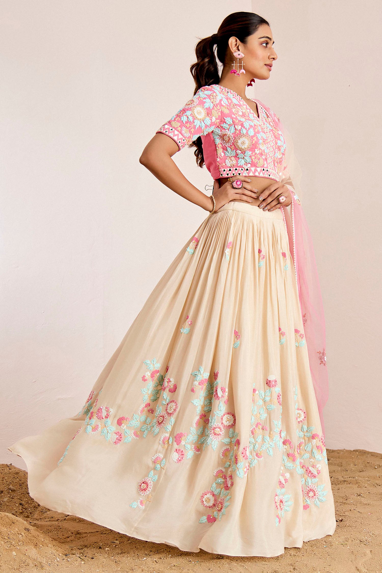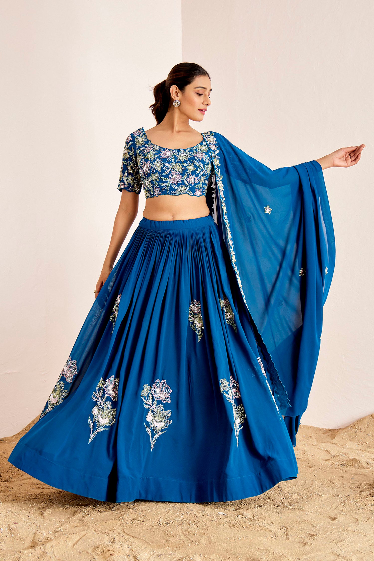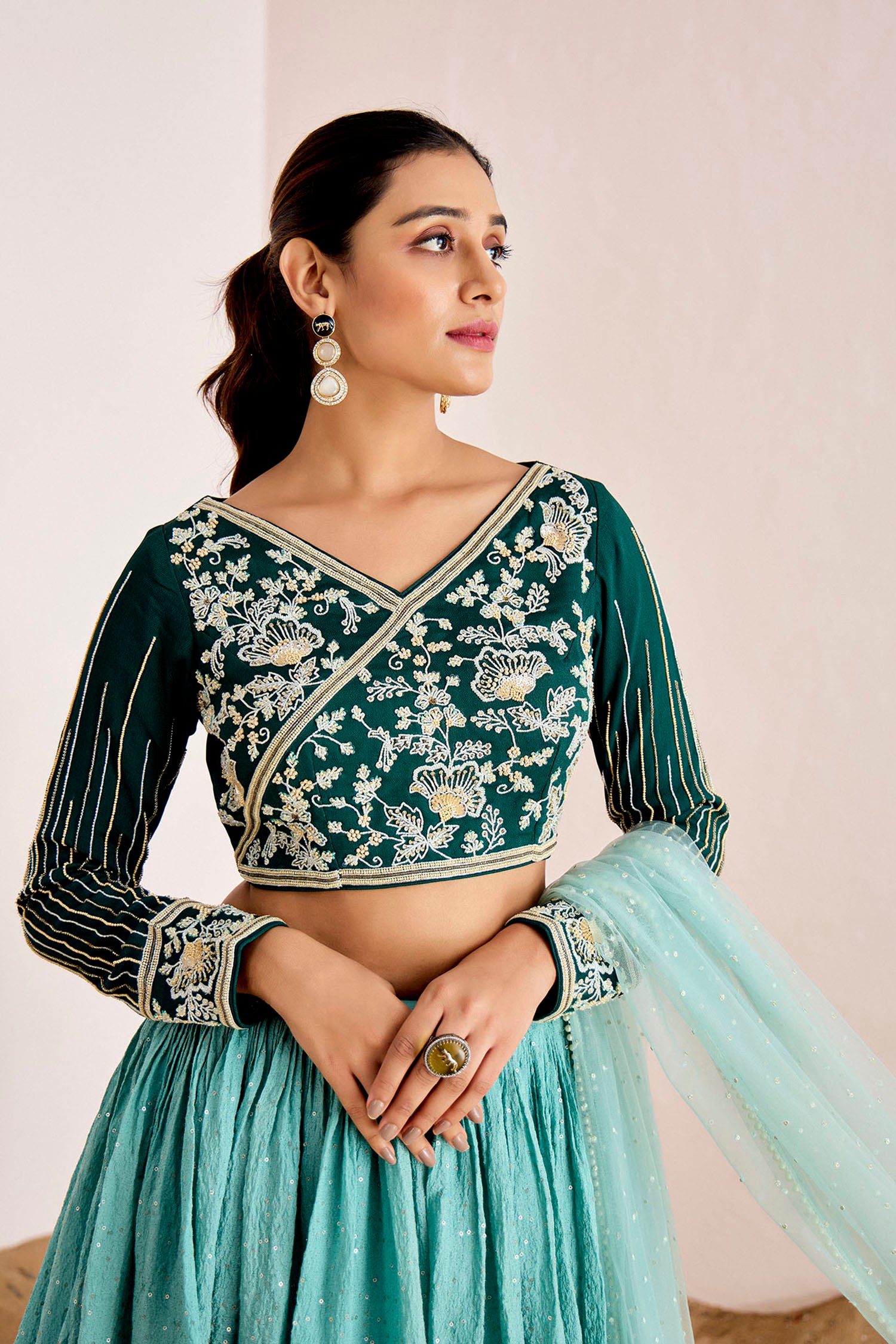 Mirror Work Blouse with Embroidered Lehenga and Shaded Net Dupatta