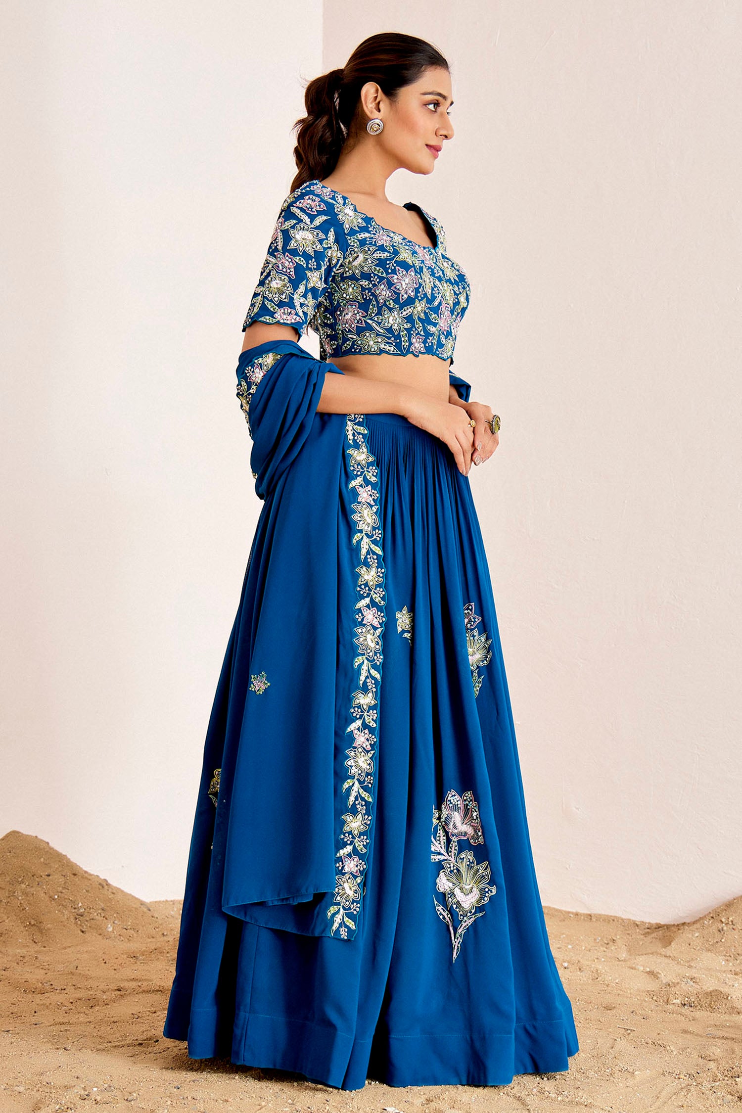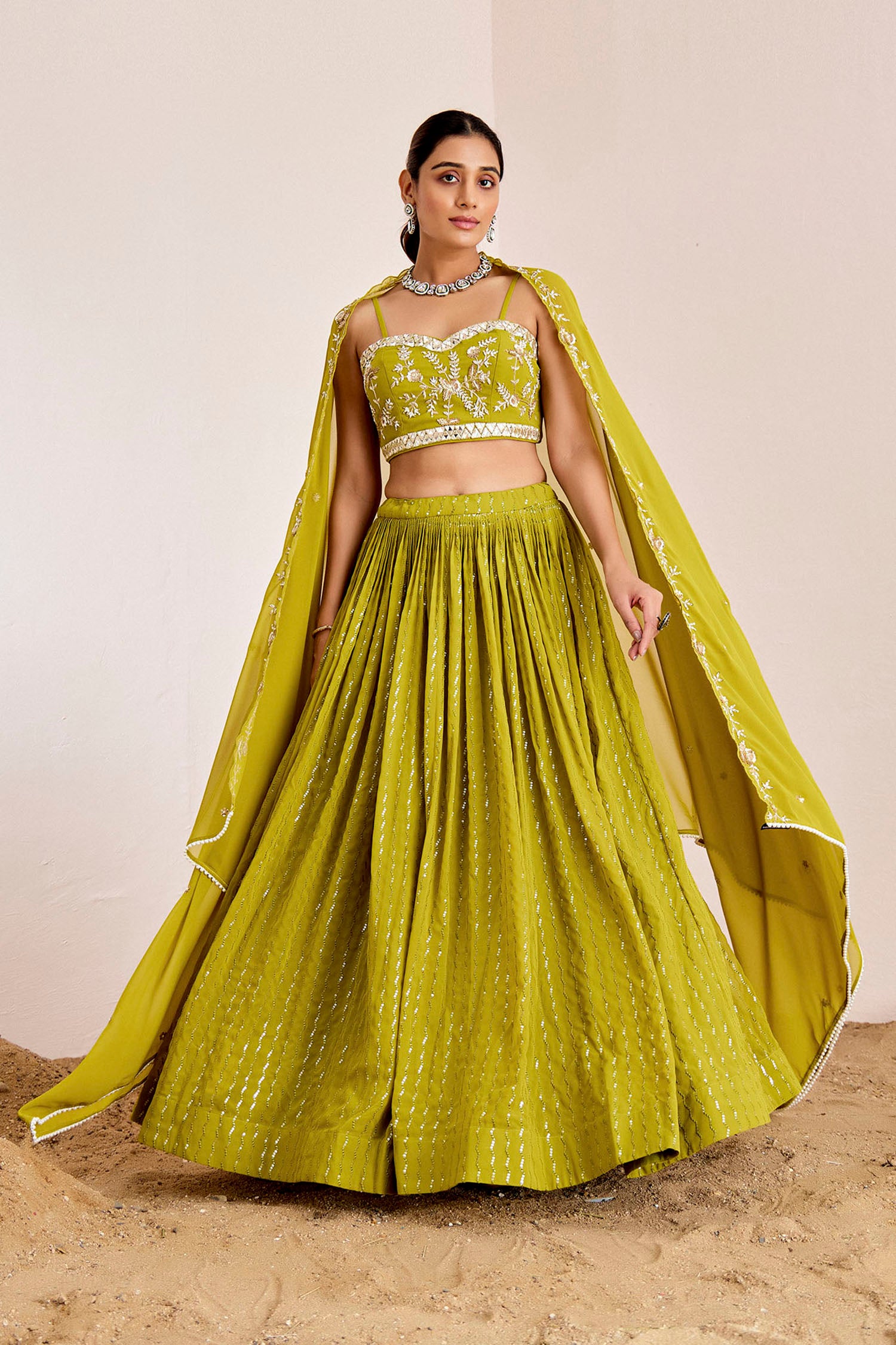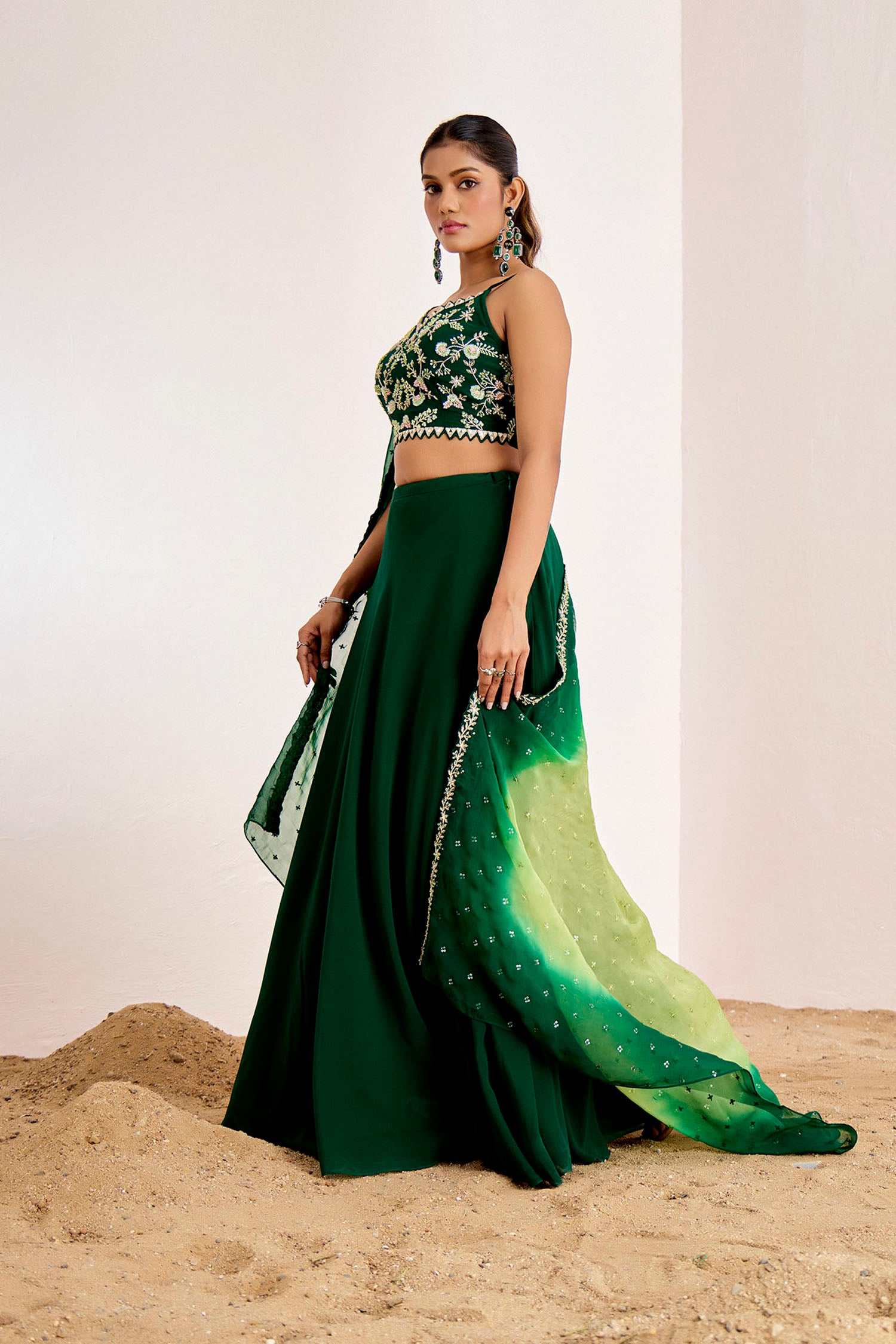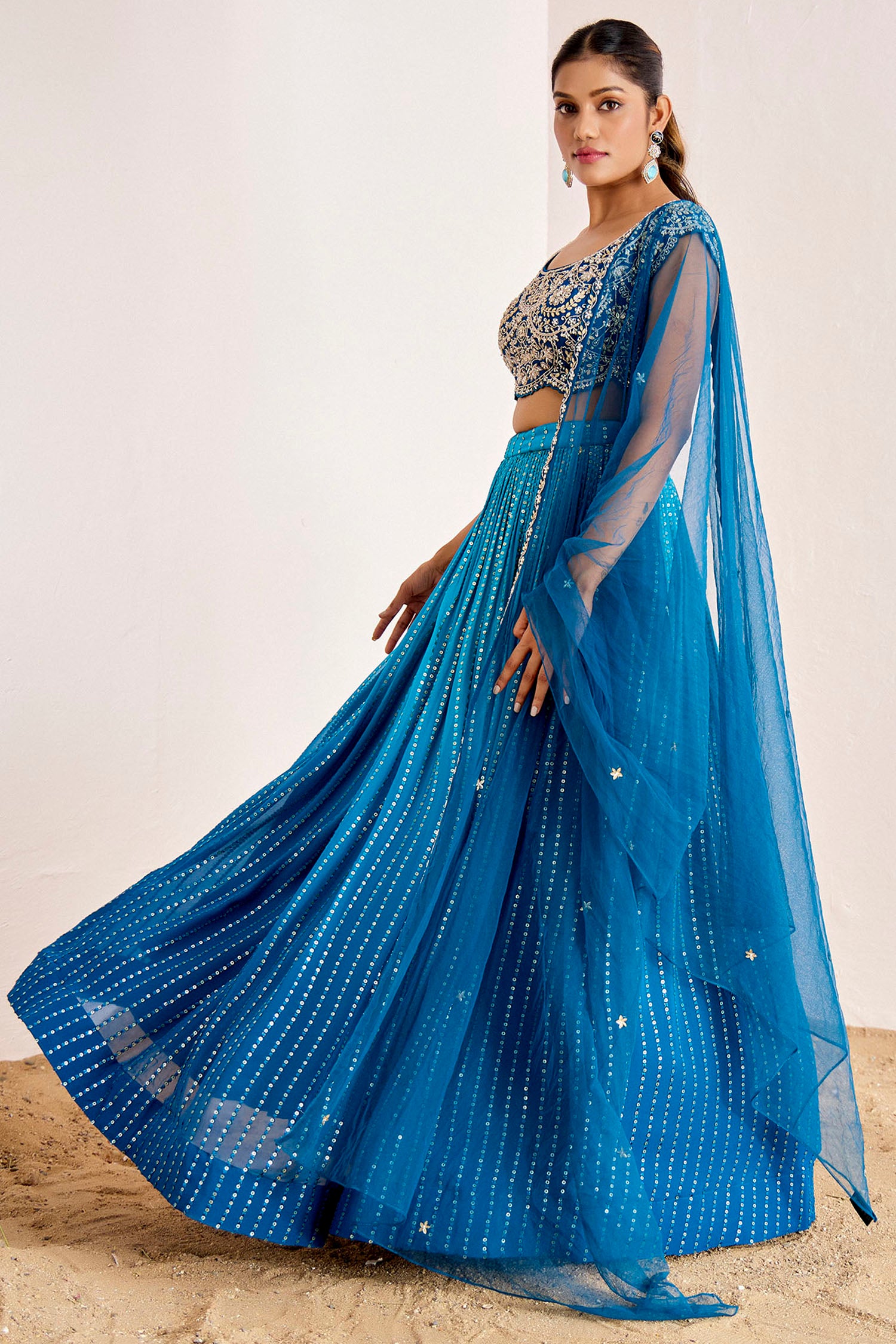 Mirror Work Blouse with Embroidered Lehenga and Shaded Net Dupatta