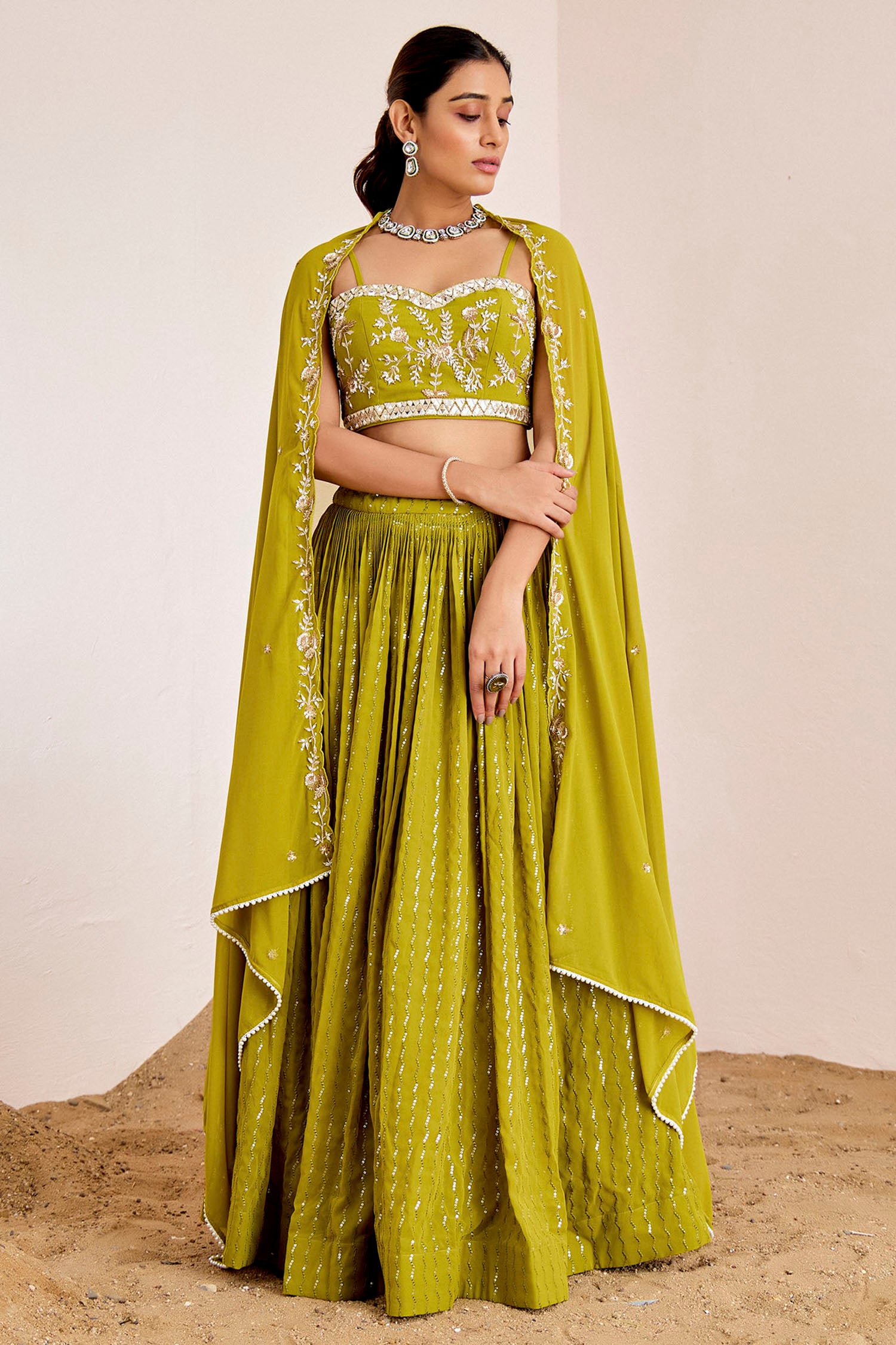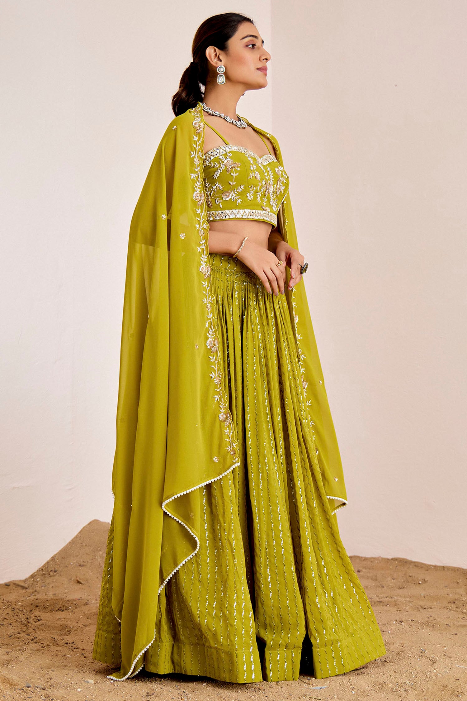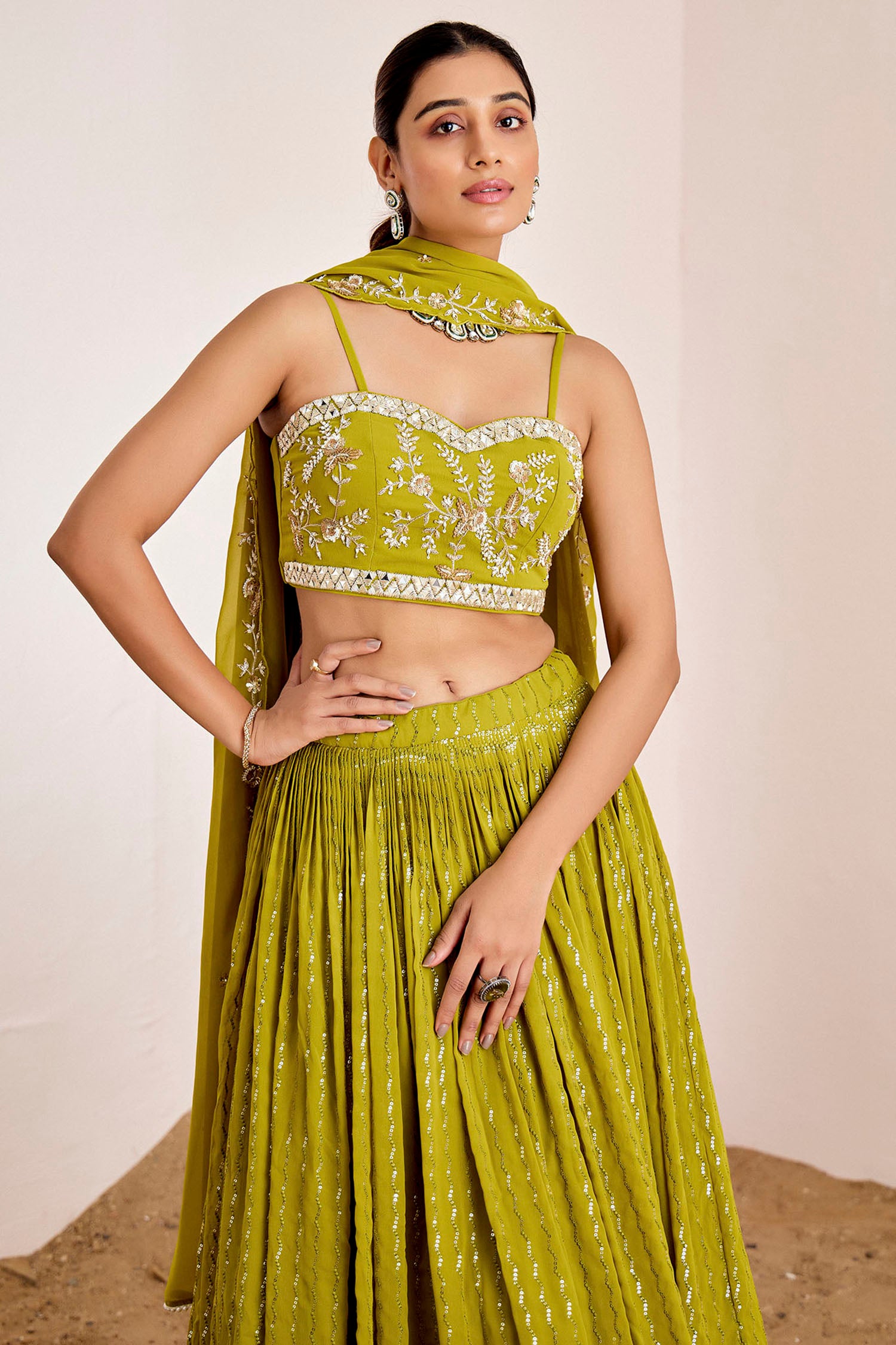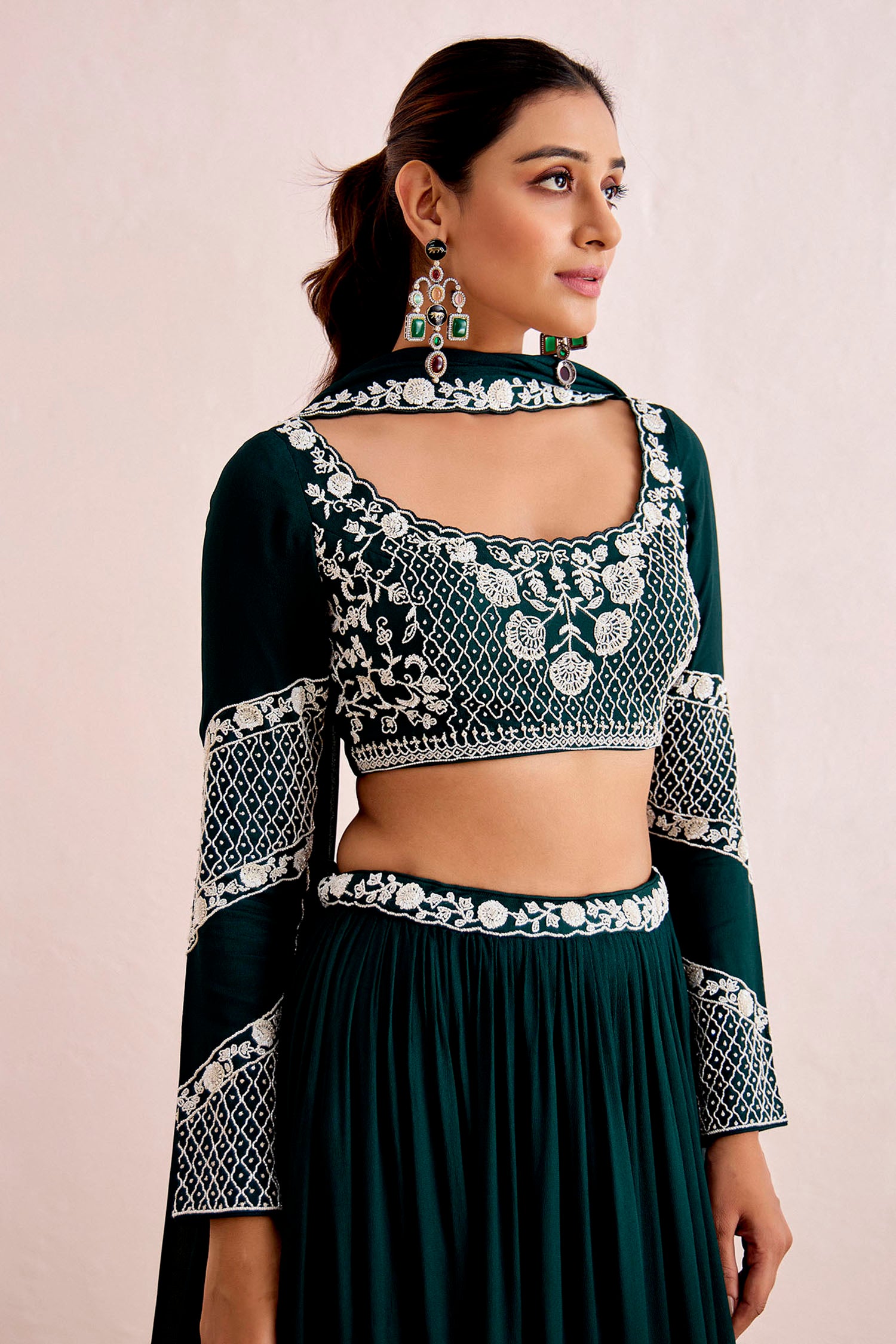 Mirror Work Blouse with Embroidered Lehenga and Shaded Net Dupatta
