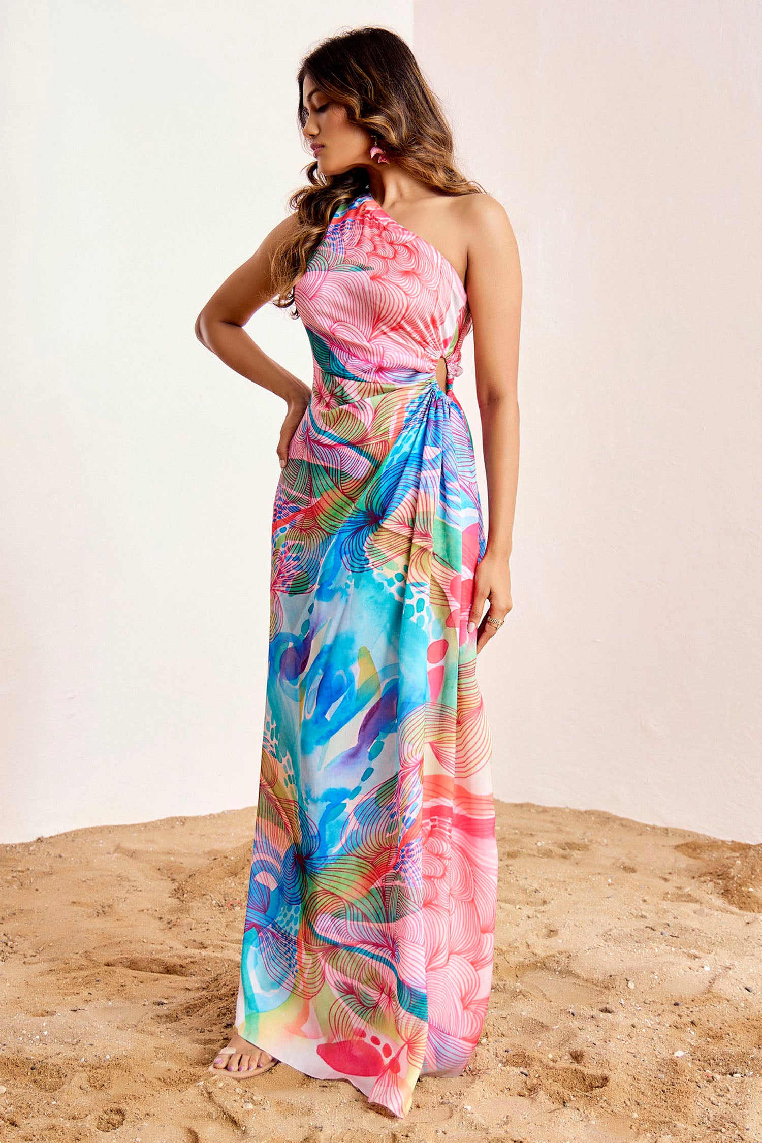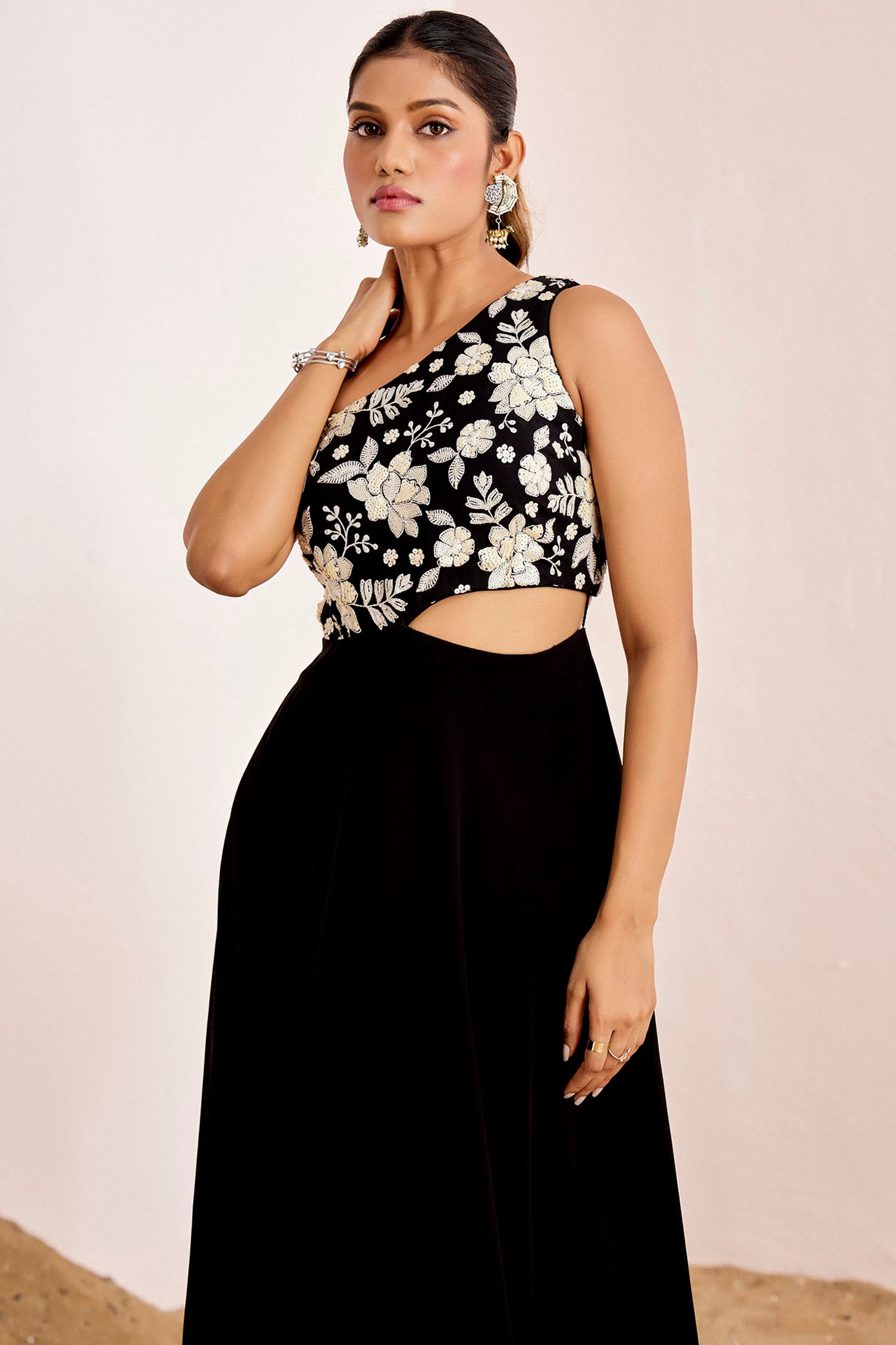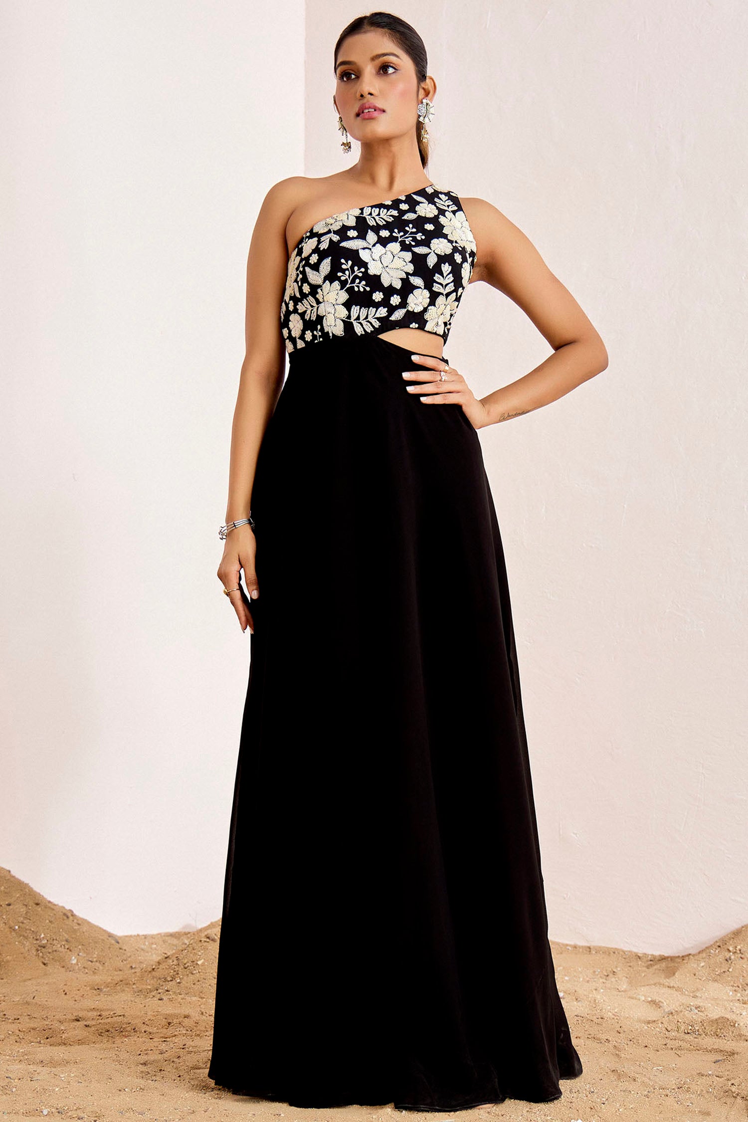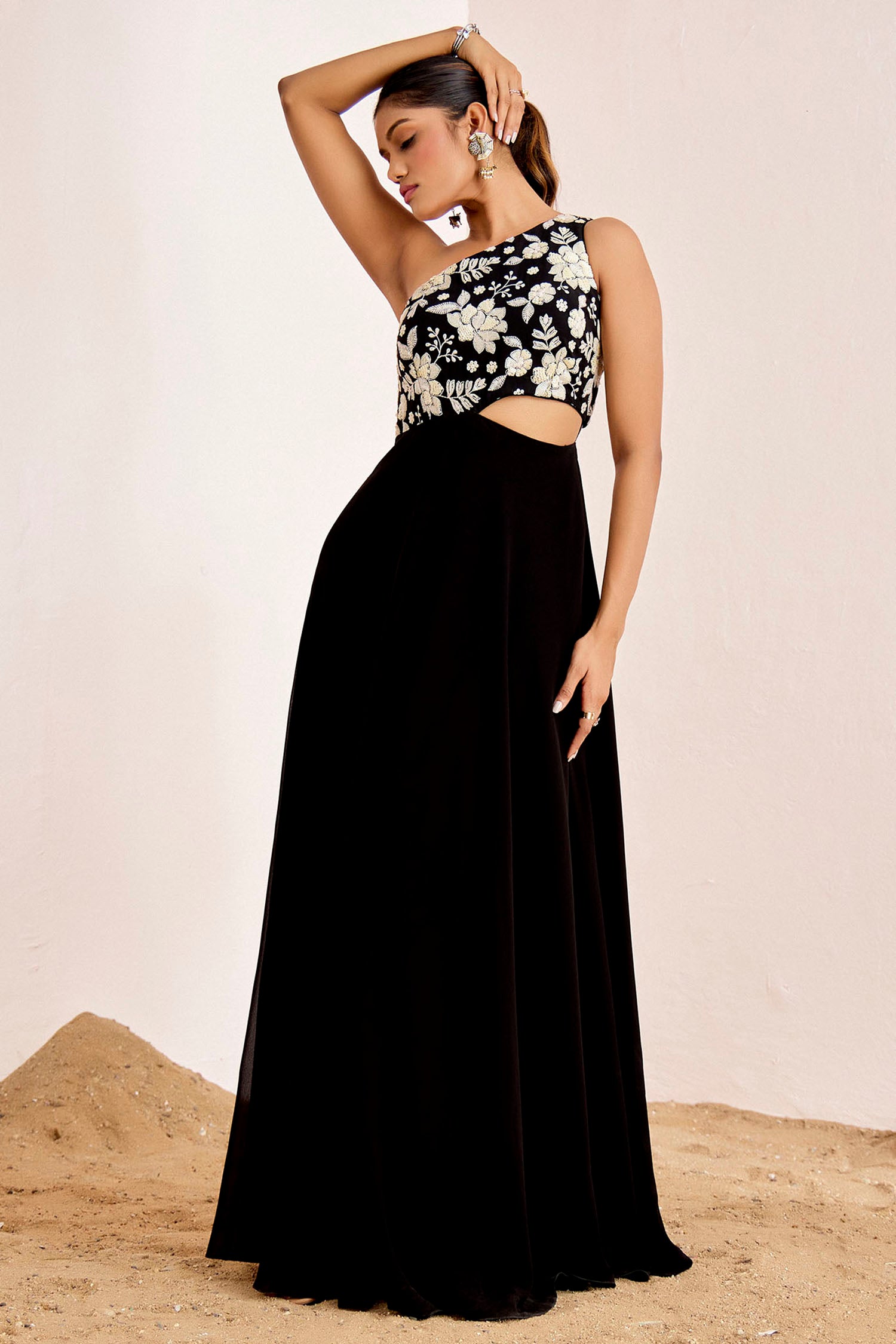 One Shoulder Hand Embroidered Gown with Cutwork Neckline
