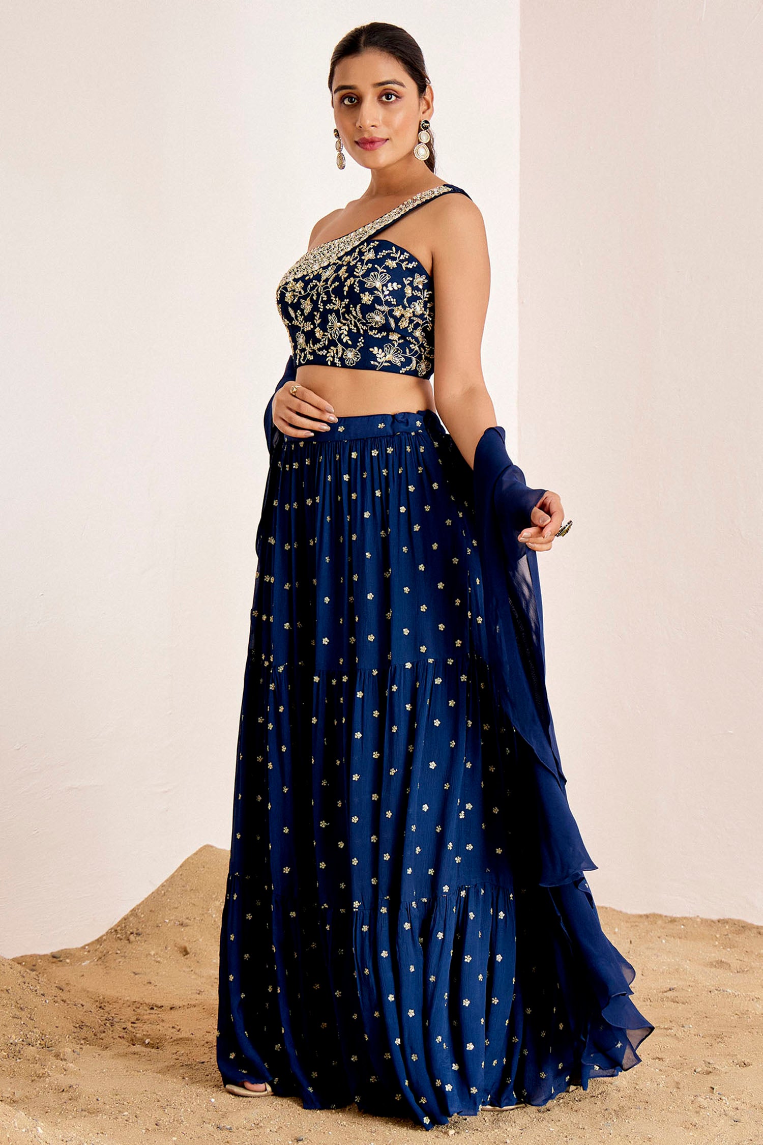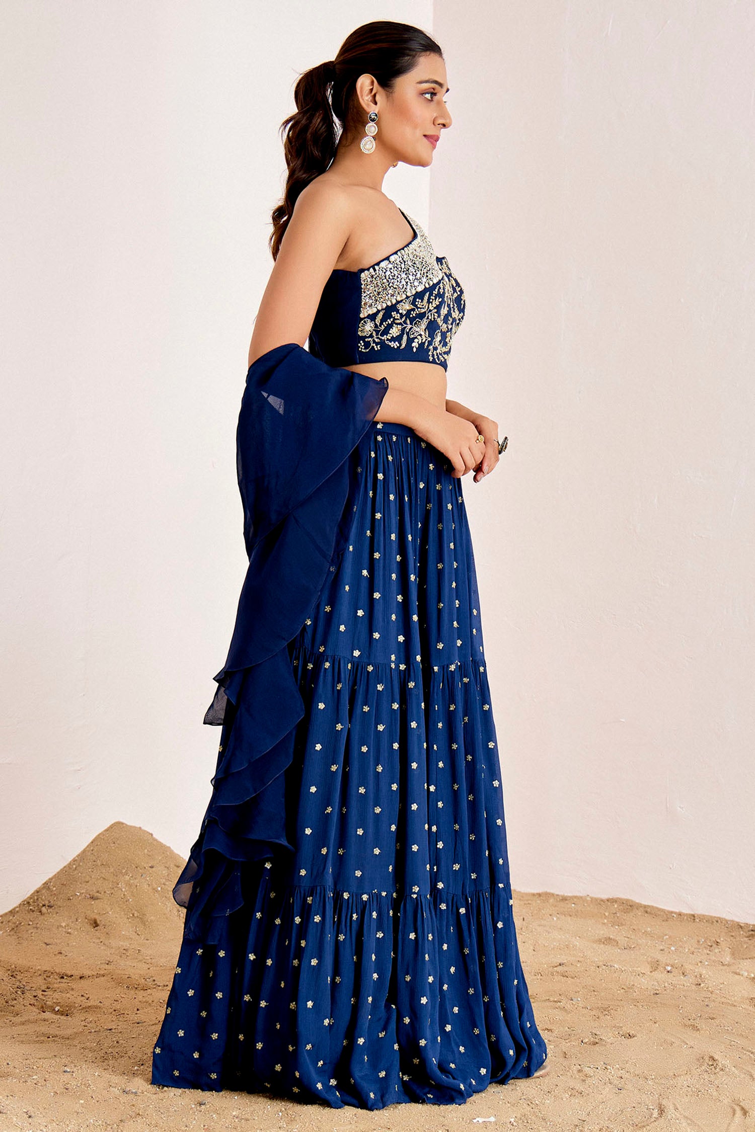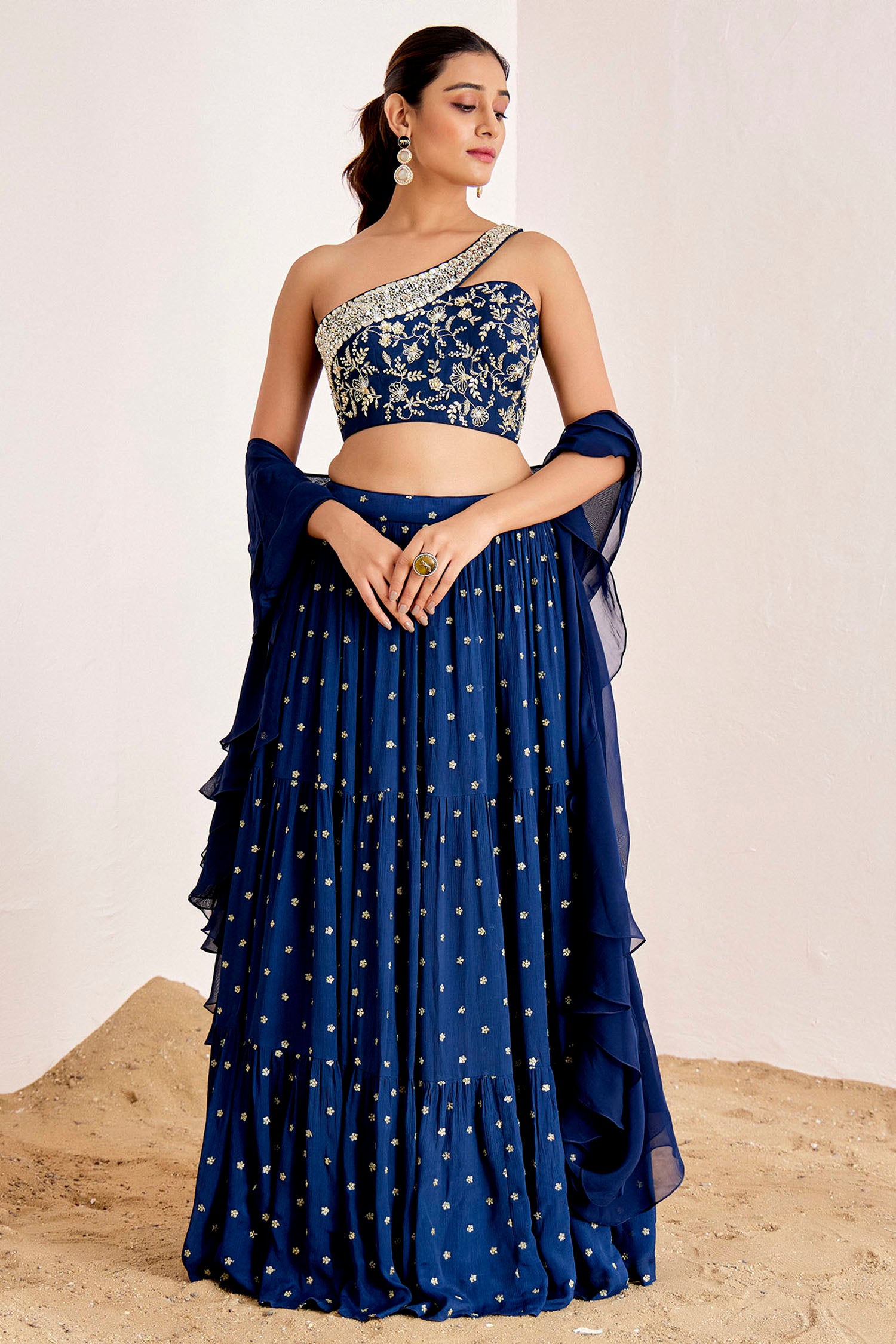 Mirror Work One Shoulder Blouse with Sequin Tiered Lehenga and Ruffle Dupatta