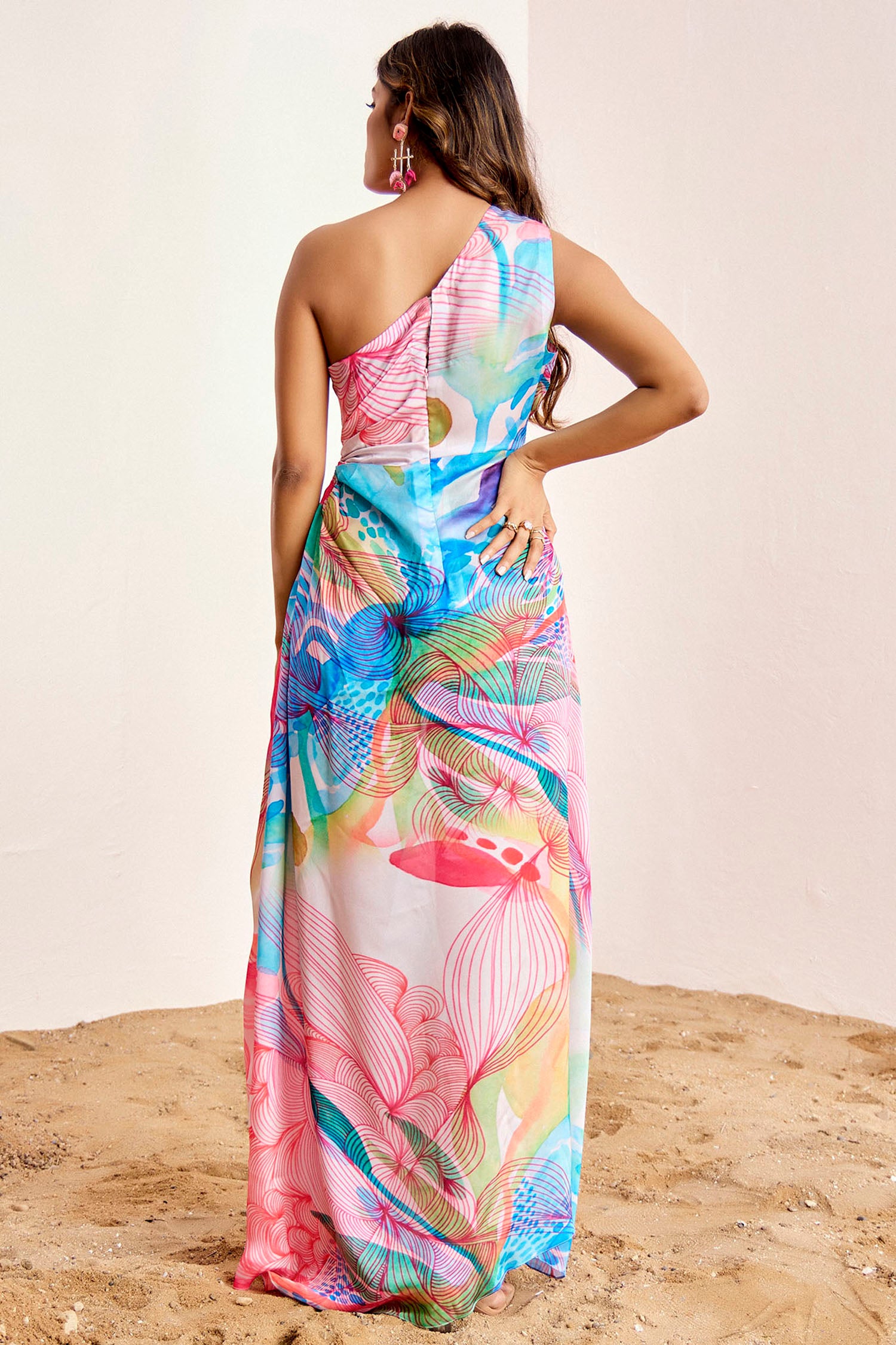One Shoulder Sequin Embroidered Gown with Side Cutout Detail