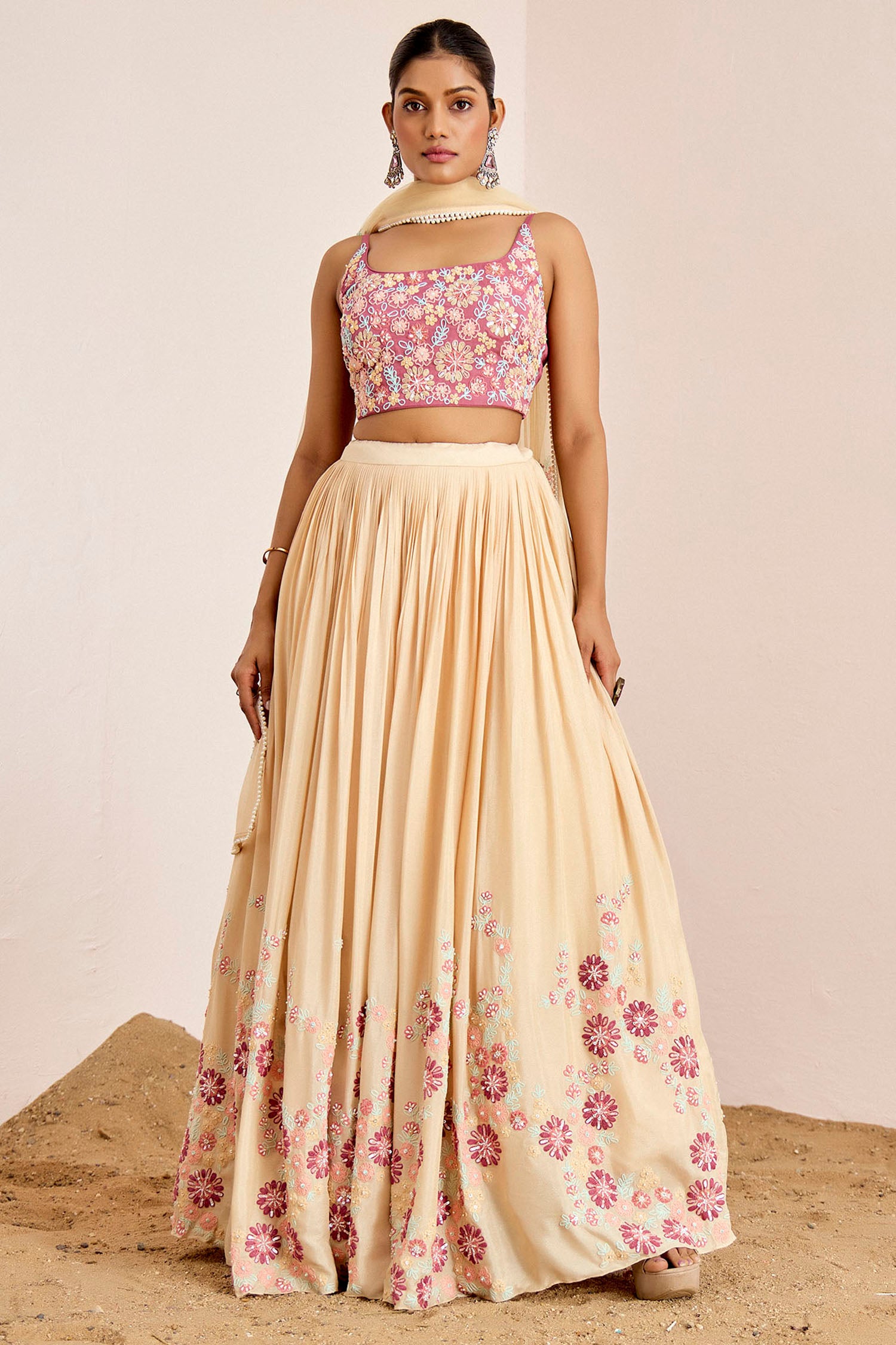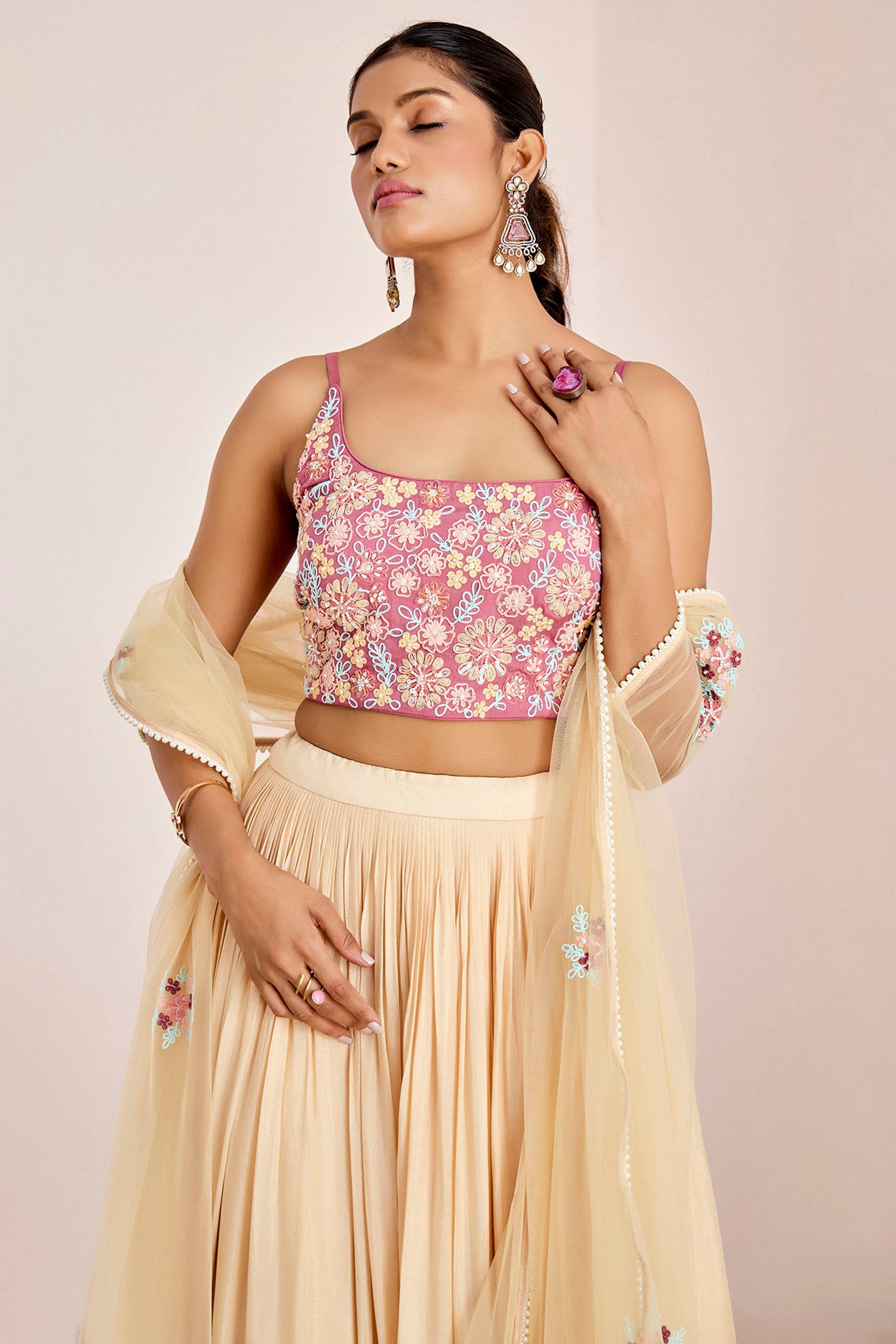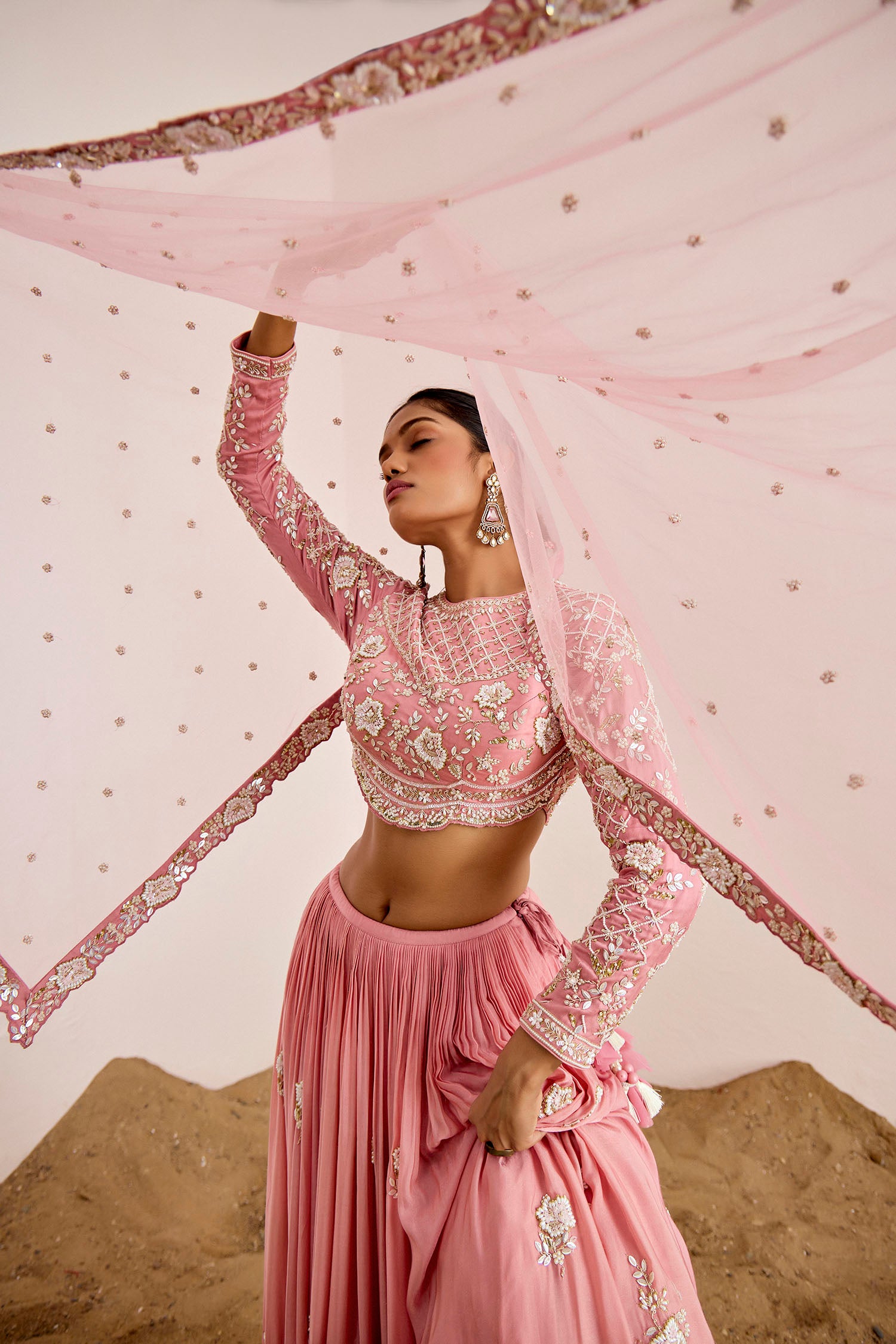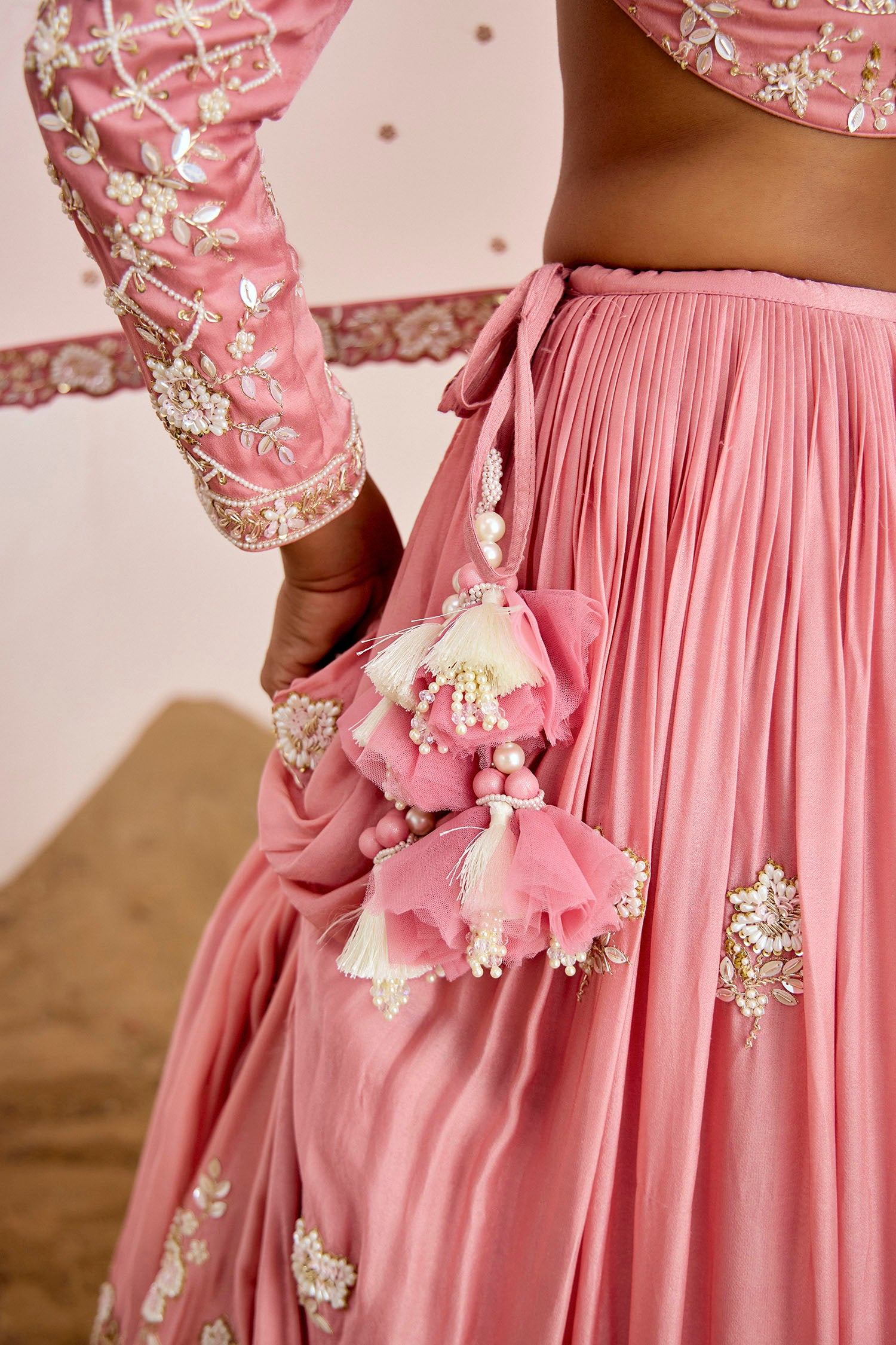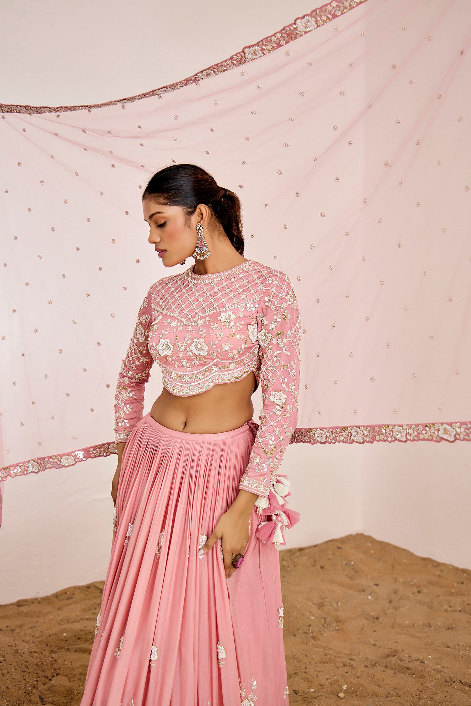 Hand Embroidered Blouse with Pleated Lehenga and Pearl Lace Net Dupatta