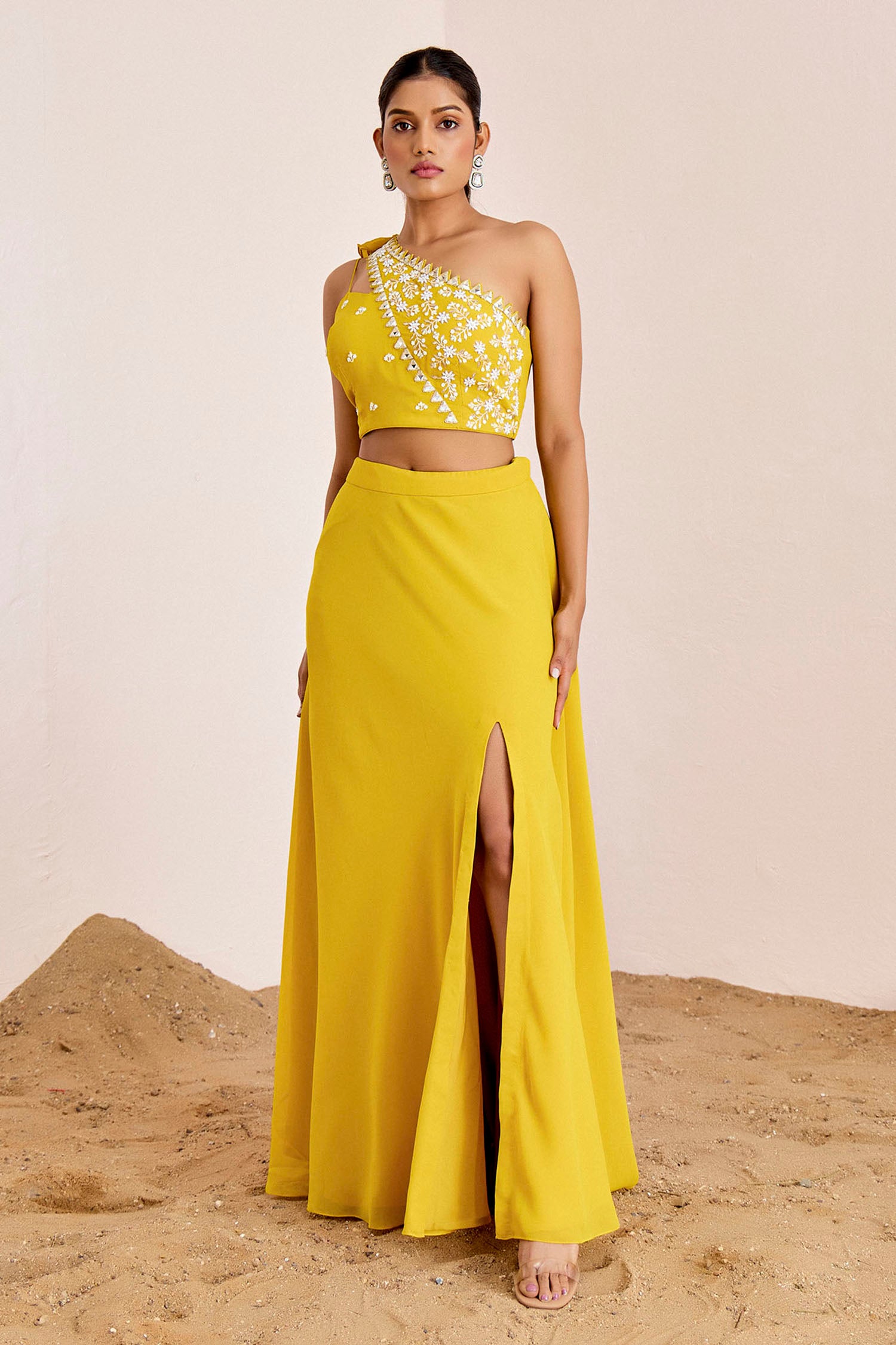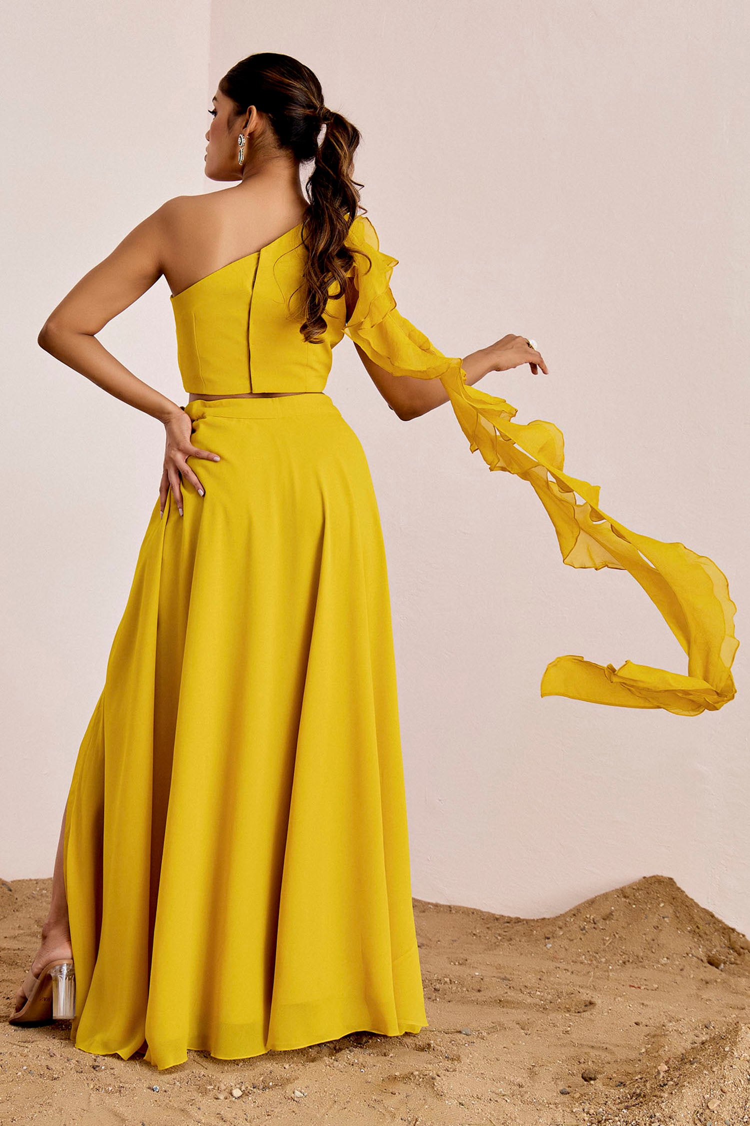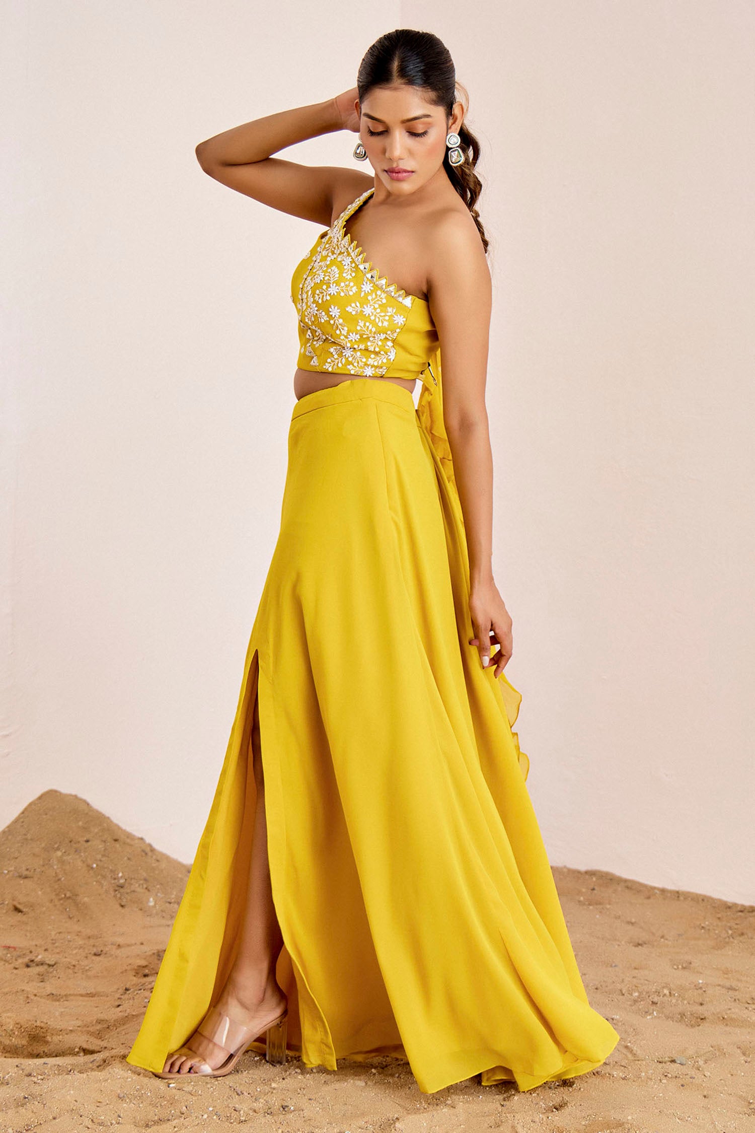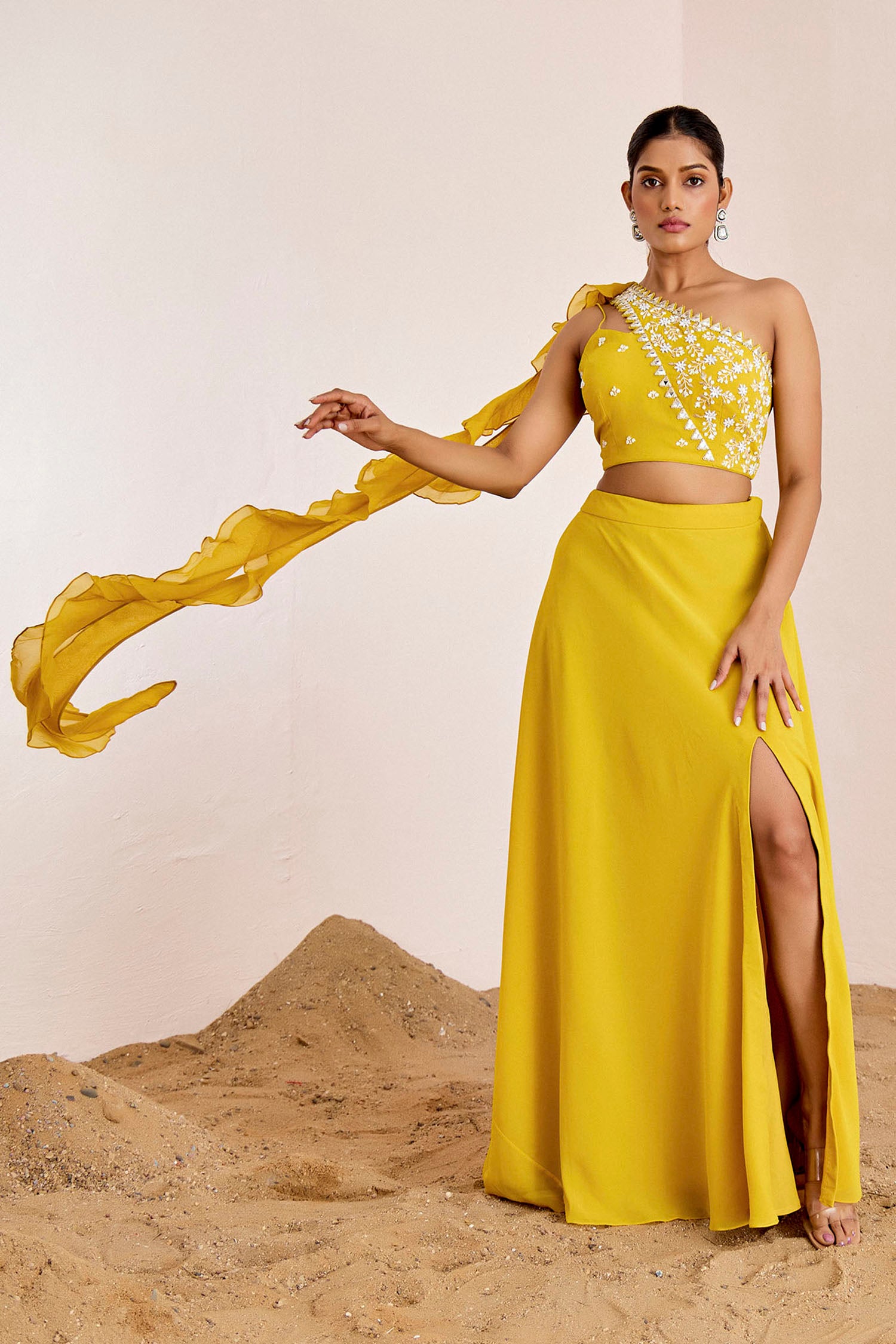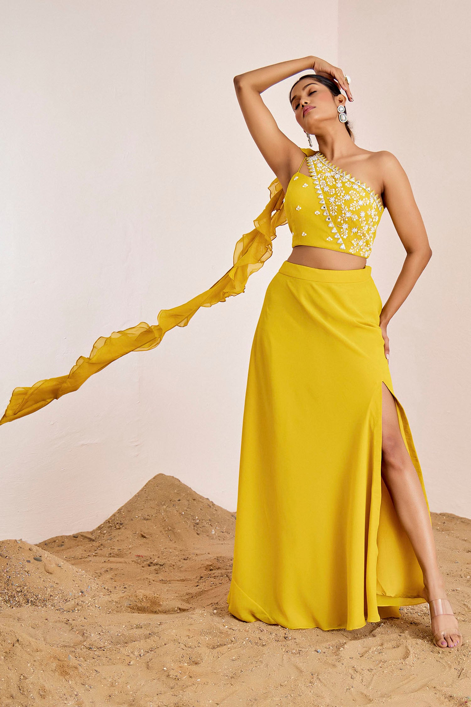 One Shoulder Mirror Work Blouse with Slit Skirt & Ruffle Dupatta