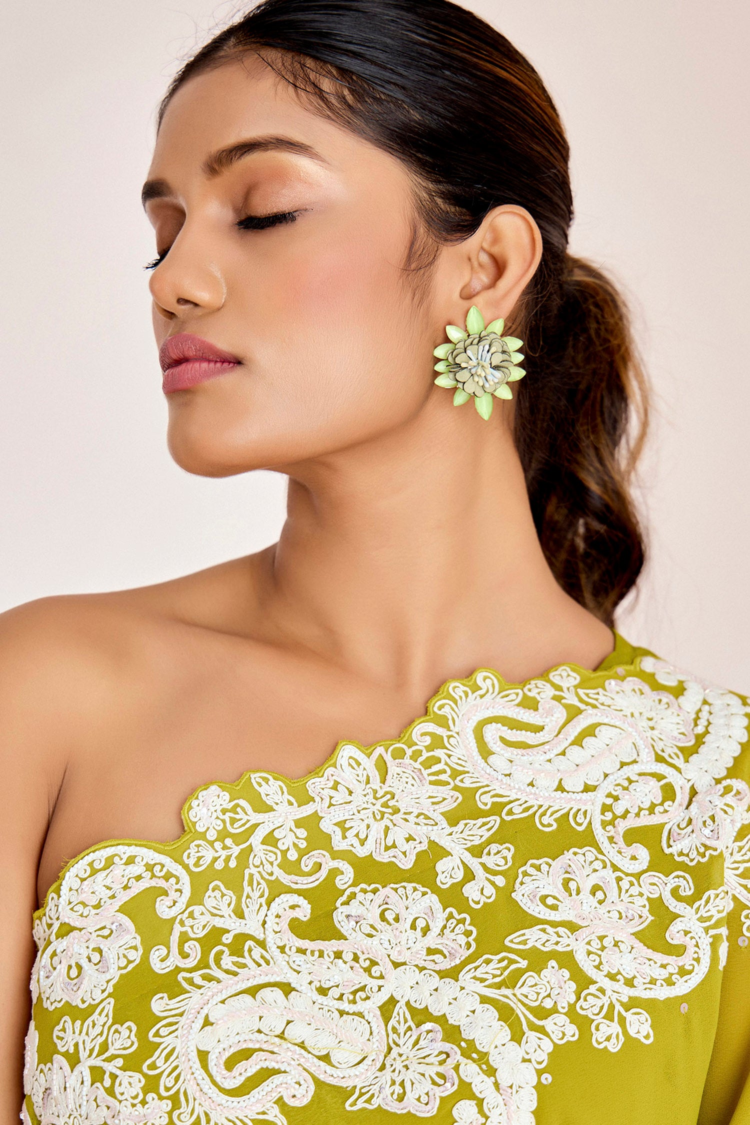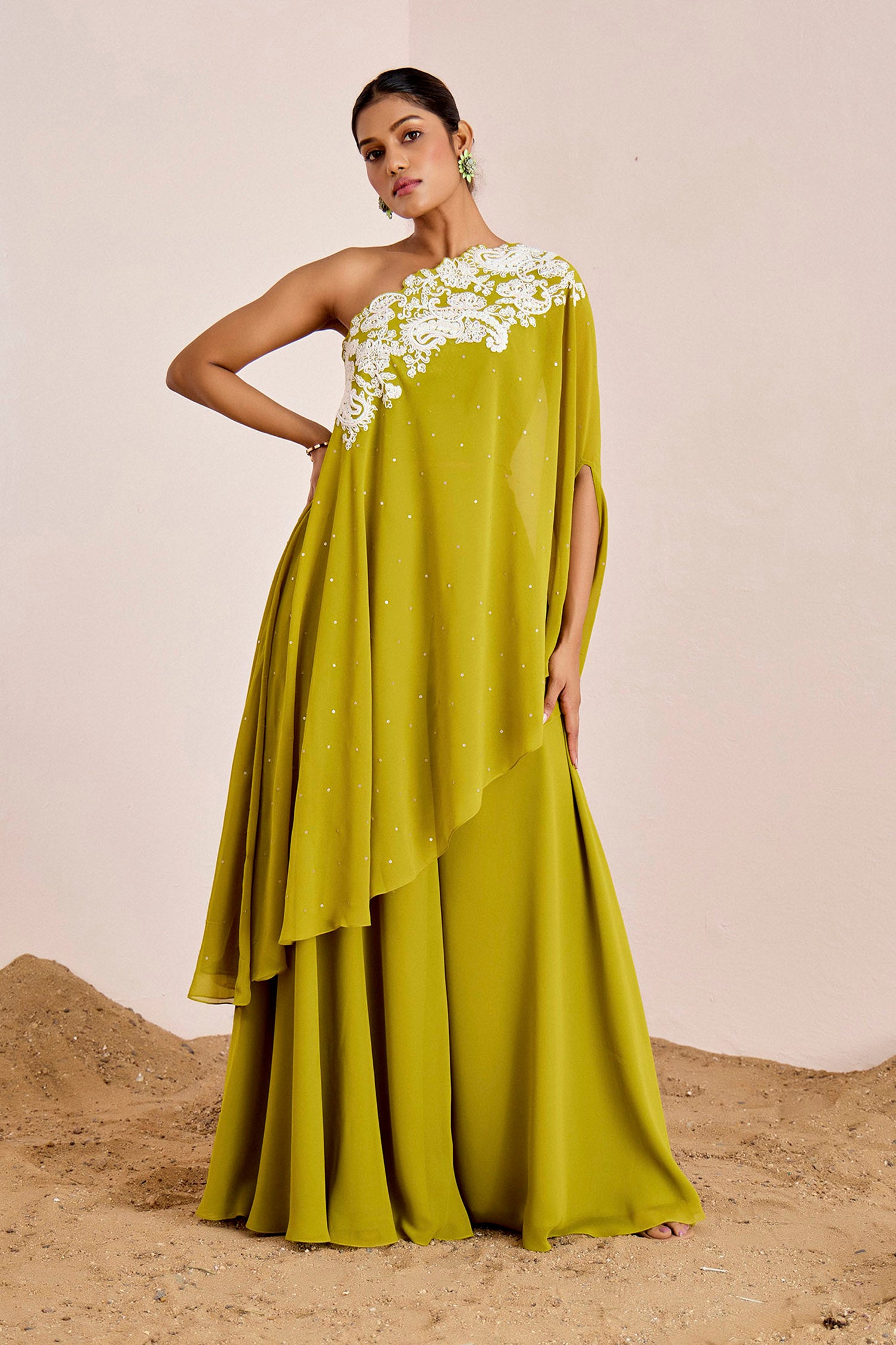 One Shoulder Long Top with Flared Pants & Cutwork Embroidery