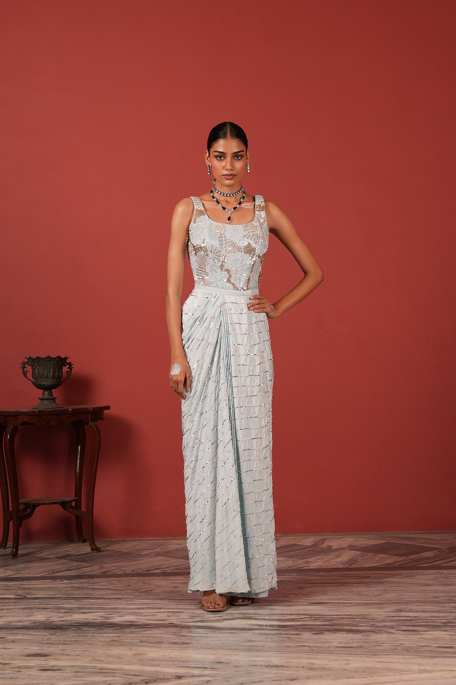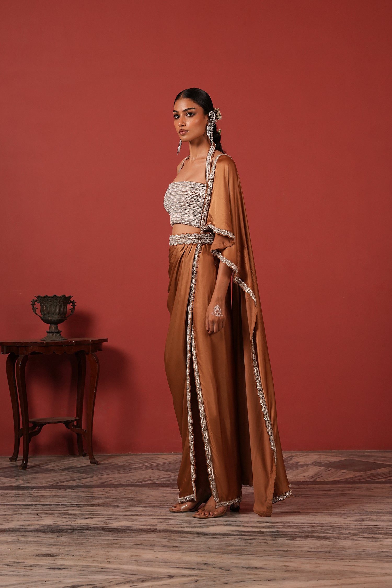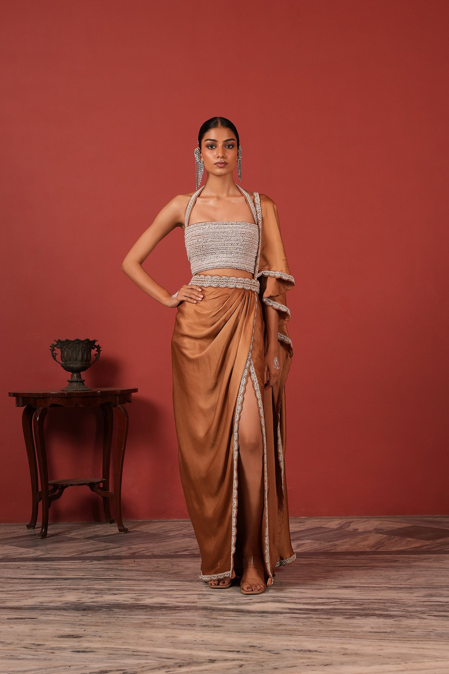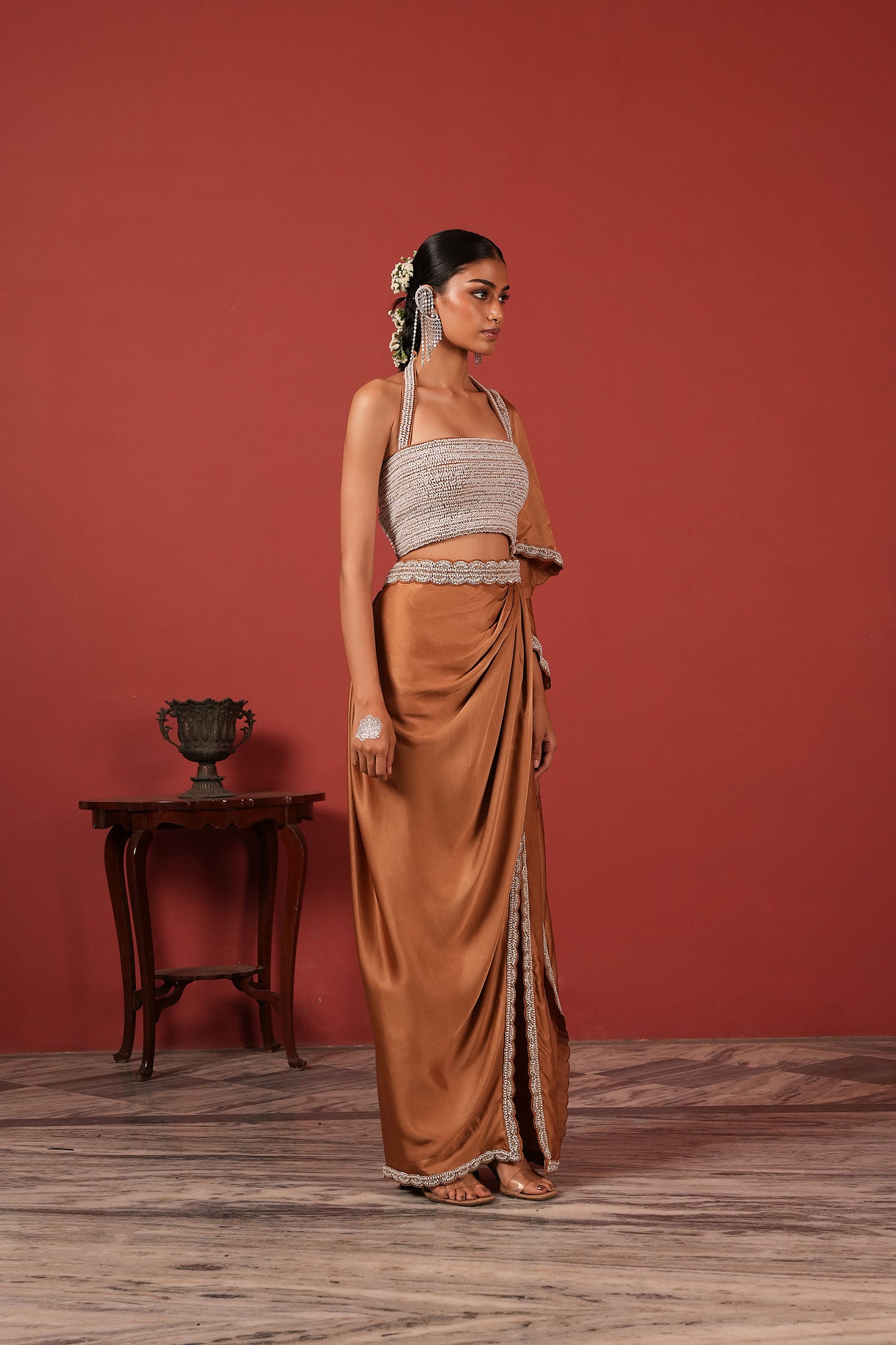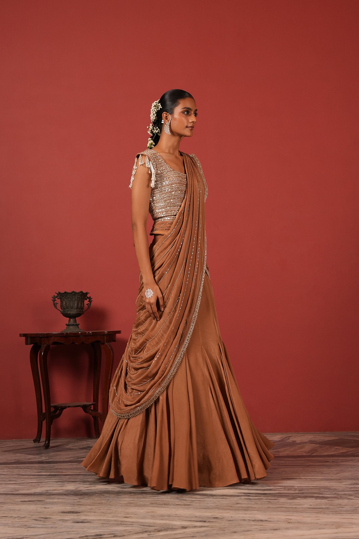 Pre-Draped Brown Saree Set with Slit Skirt