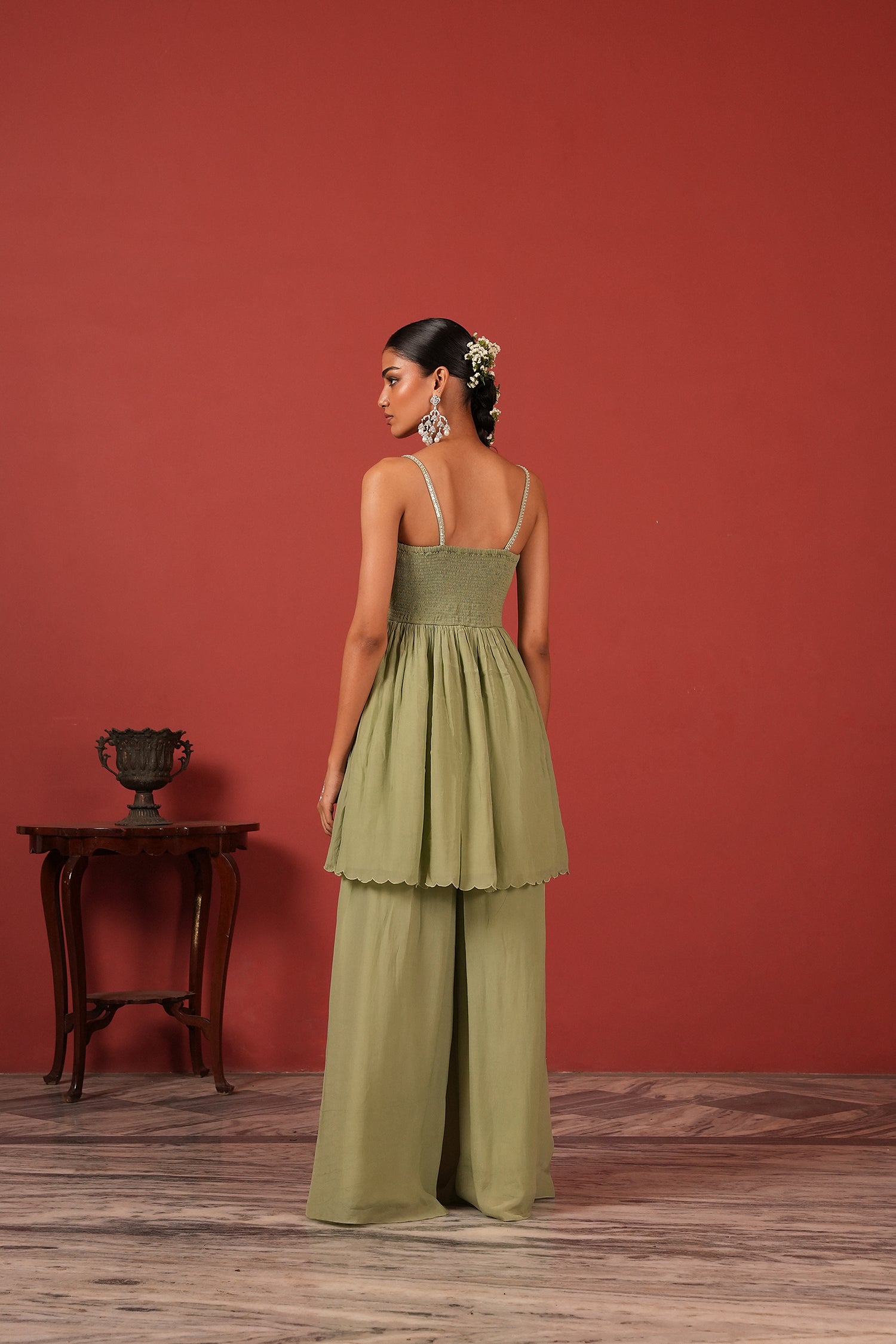 Green Handcrafted Noodle Strap Peplum Top Set