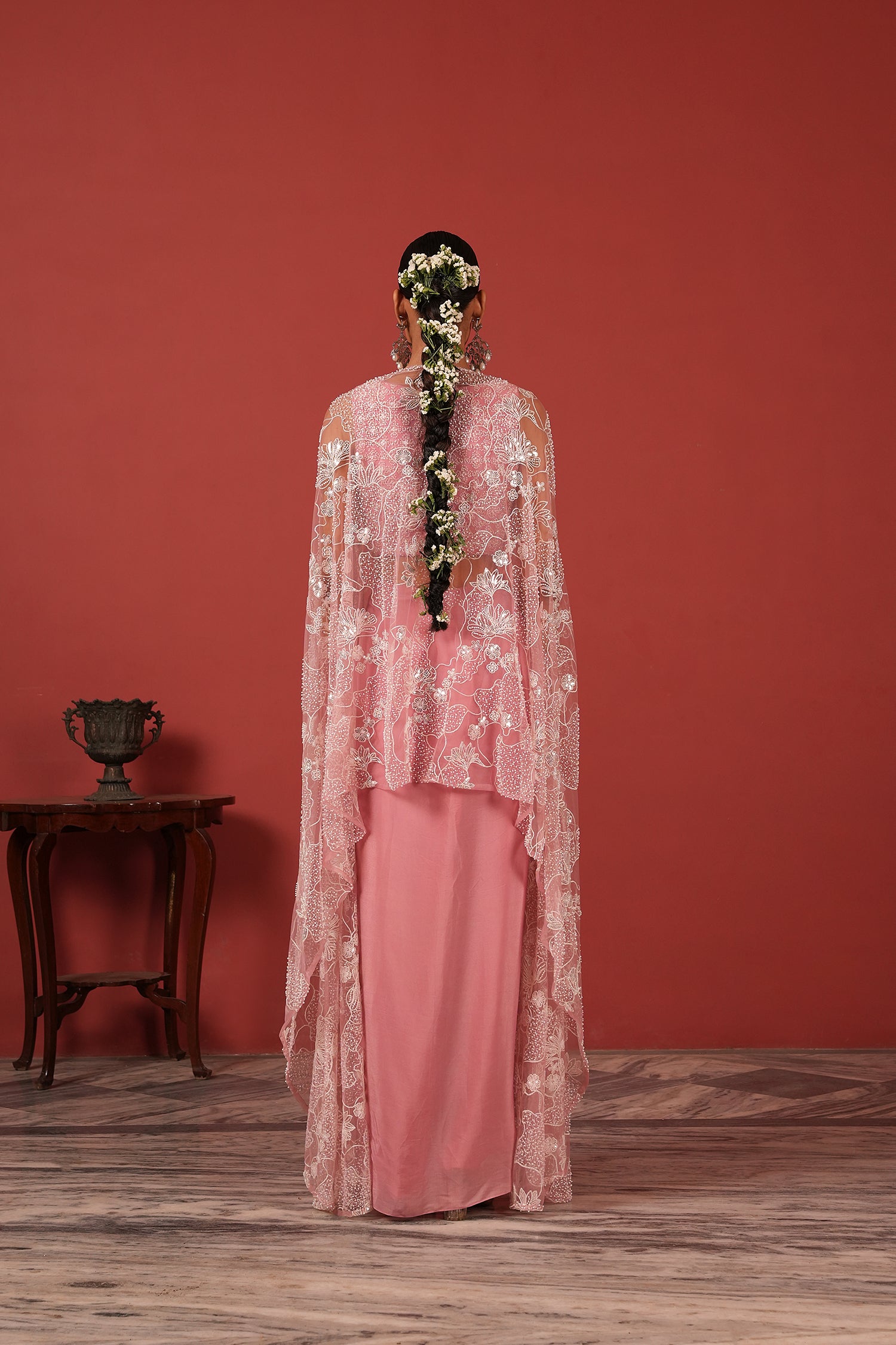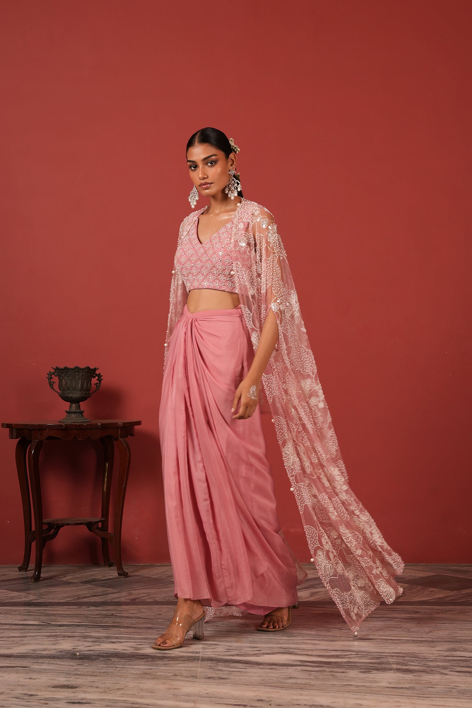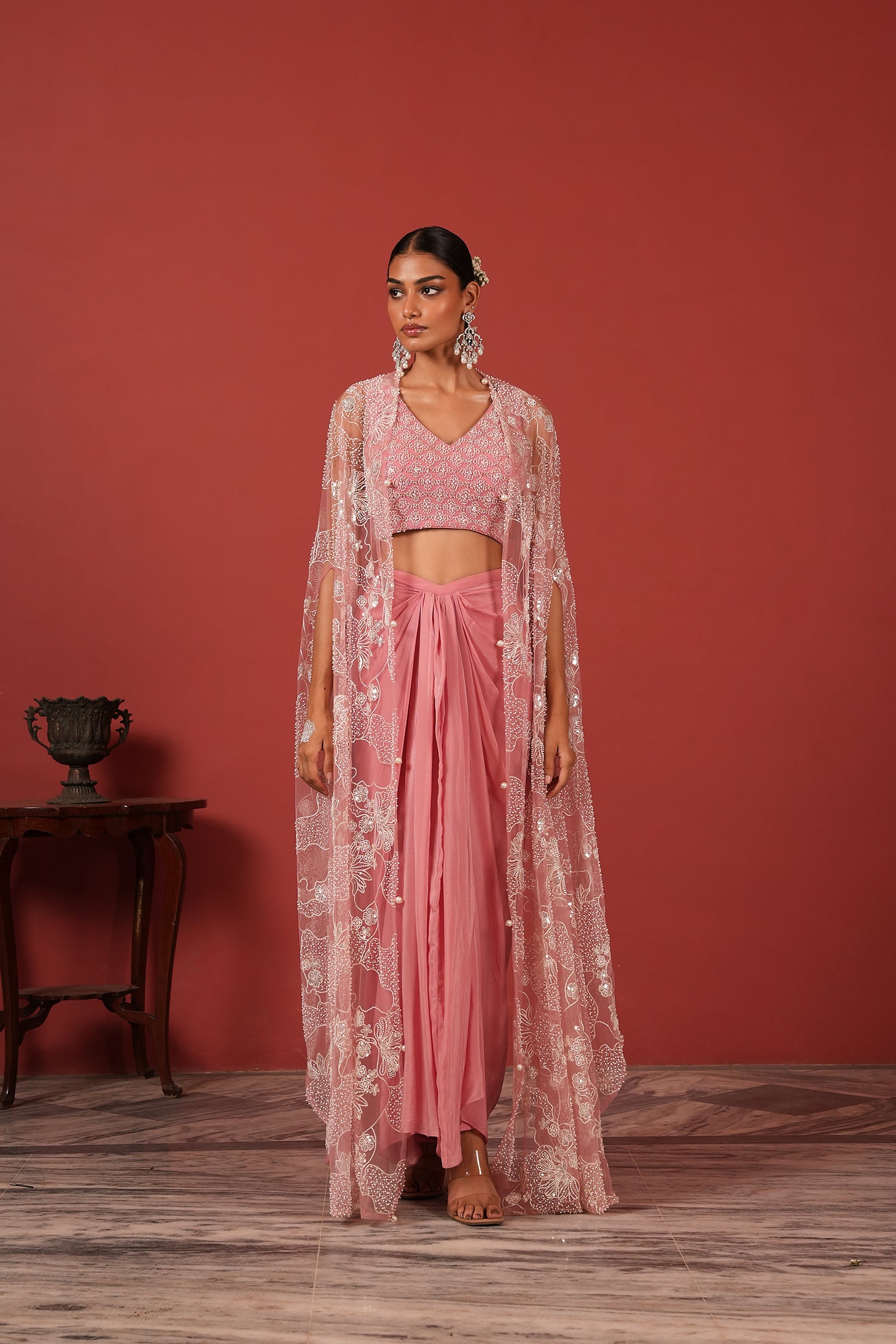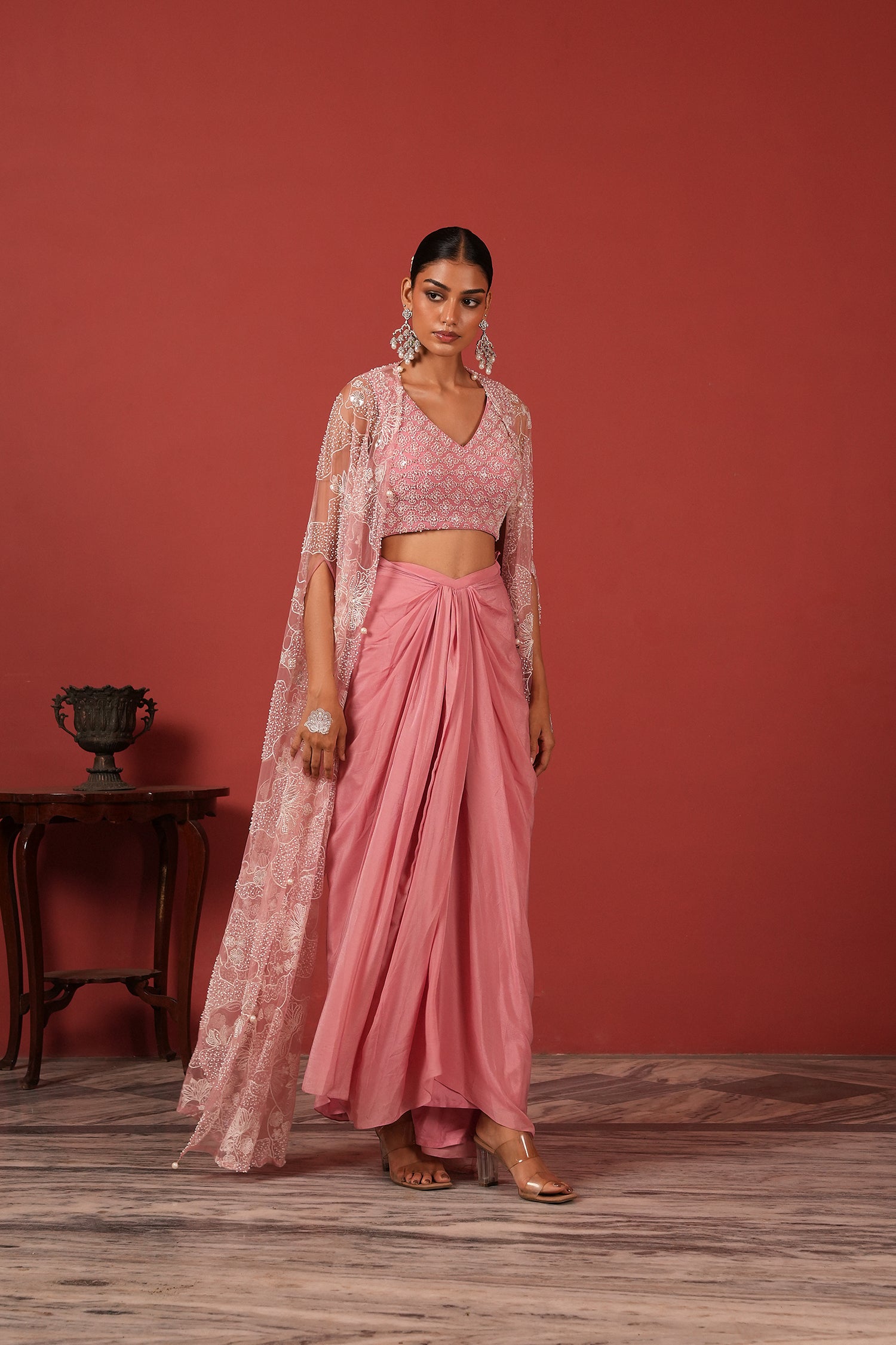Flawless Drape Skirt Set with Embroidered Blouse & Cape