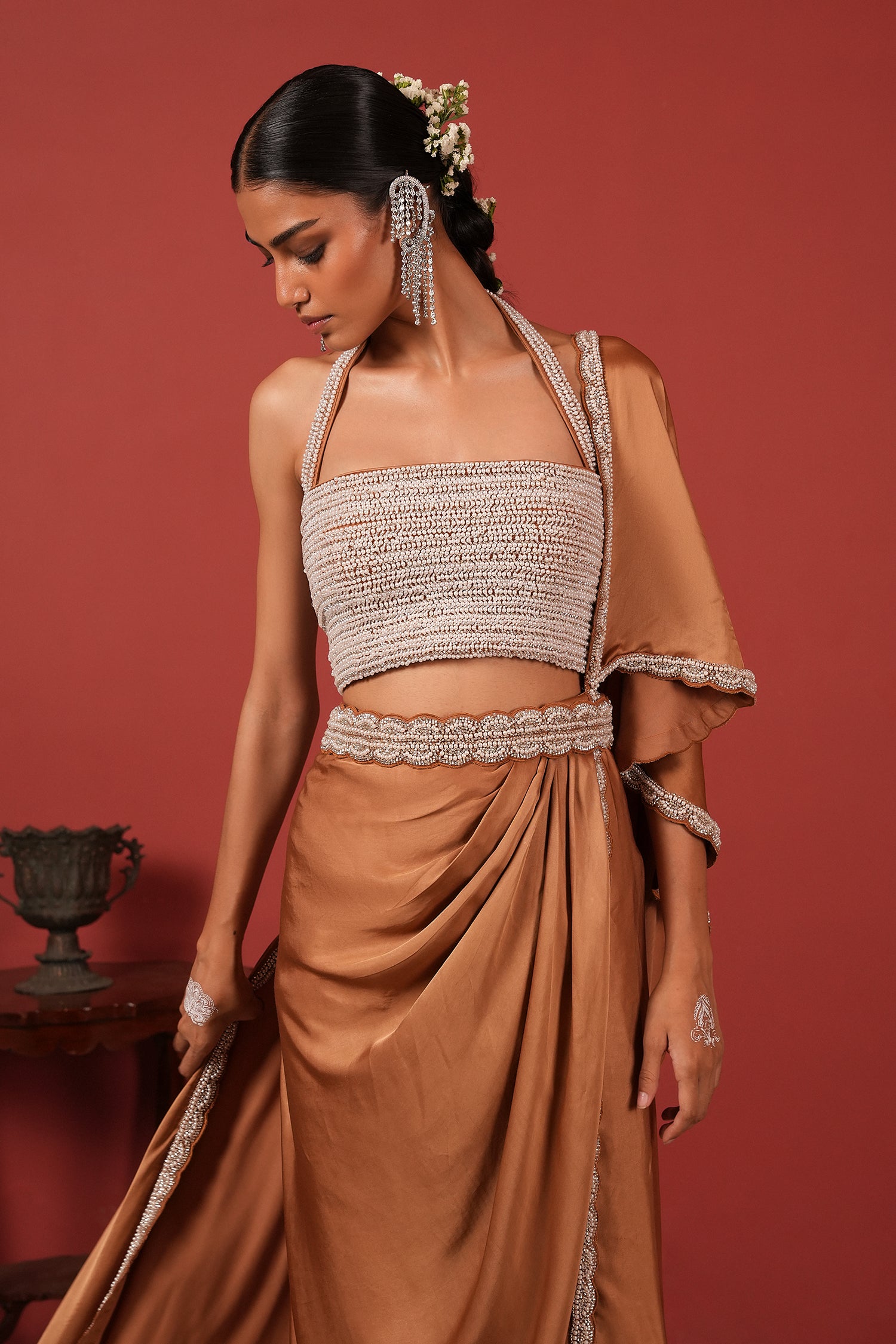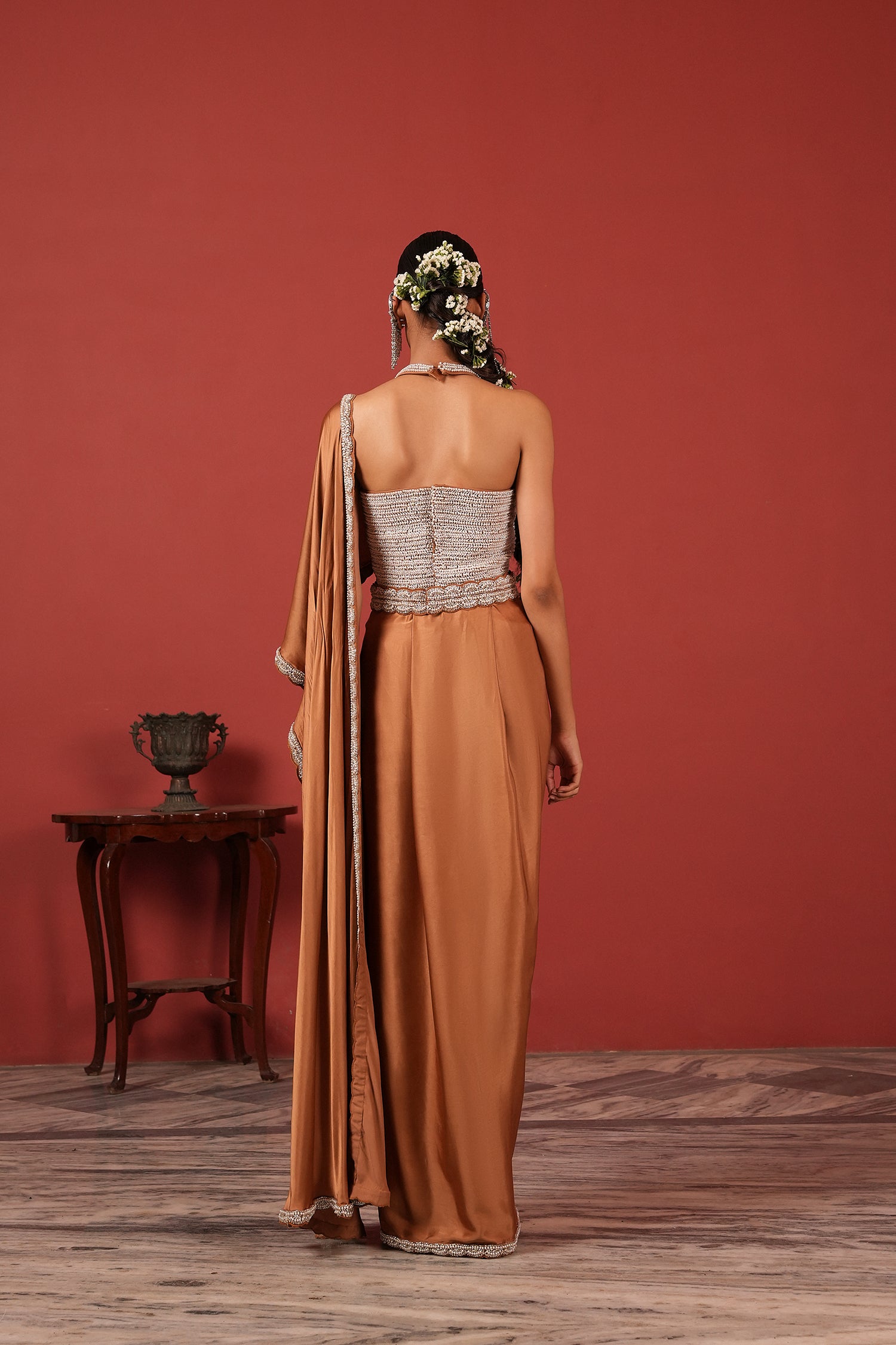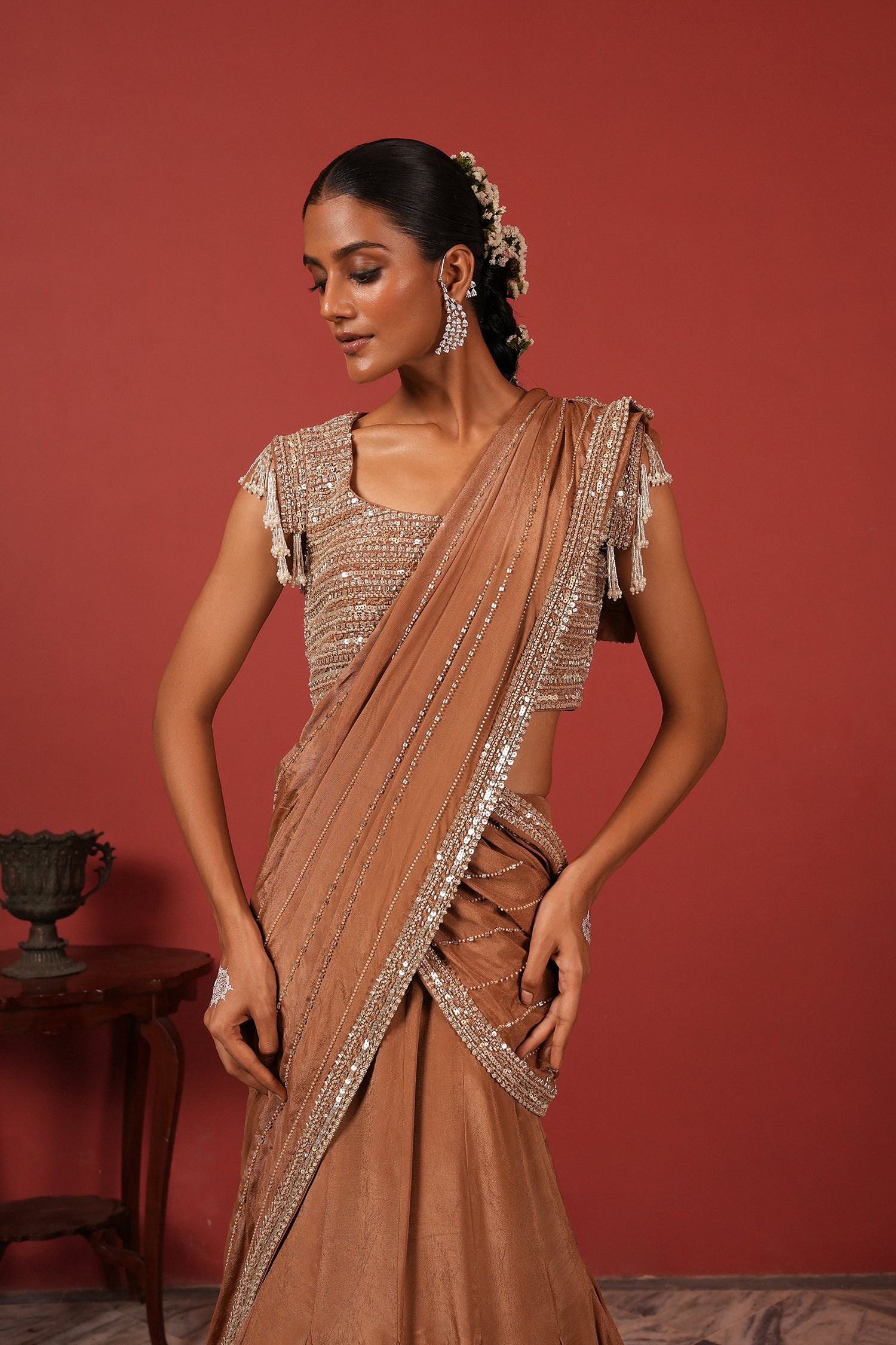 Pre-Draped Brown Saree with Embroidered Blouse & Detachable Belt