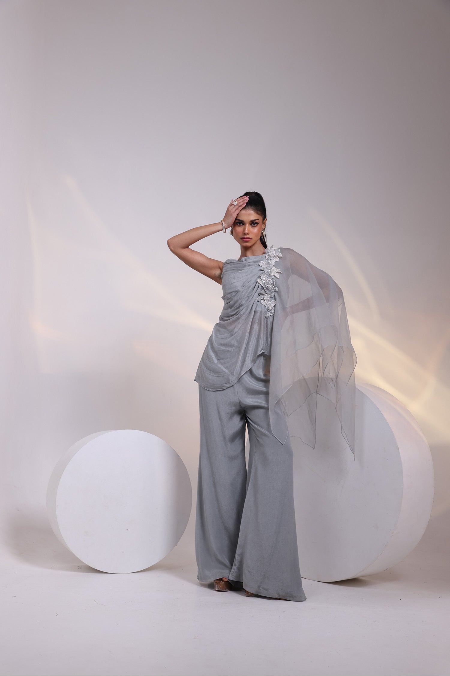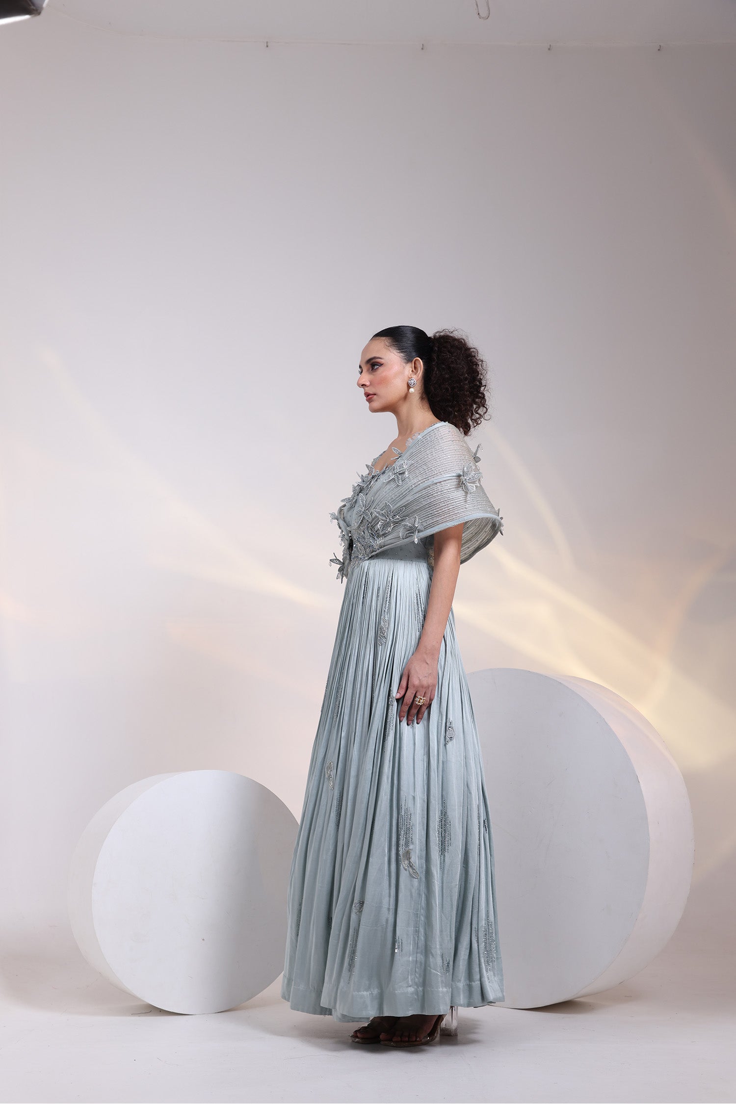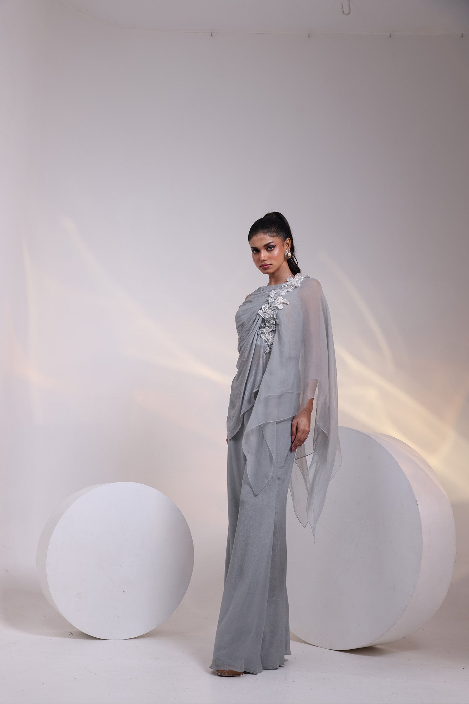 White Embellished Blue Chiffon Drape Skirt and Top Set With Organza Cape