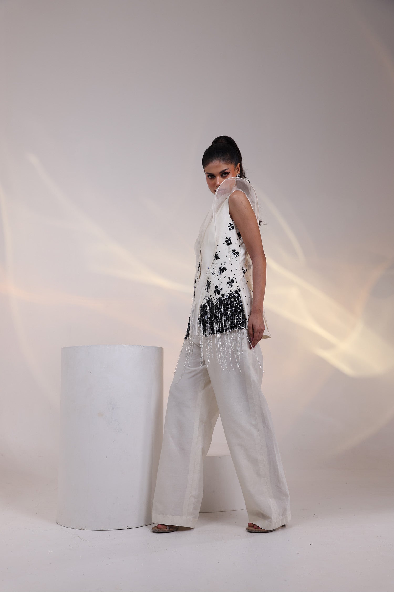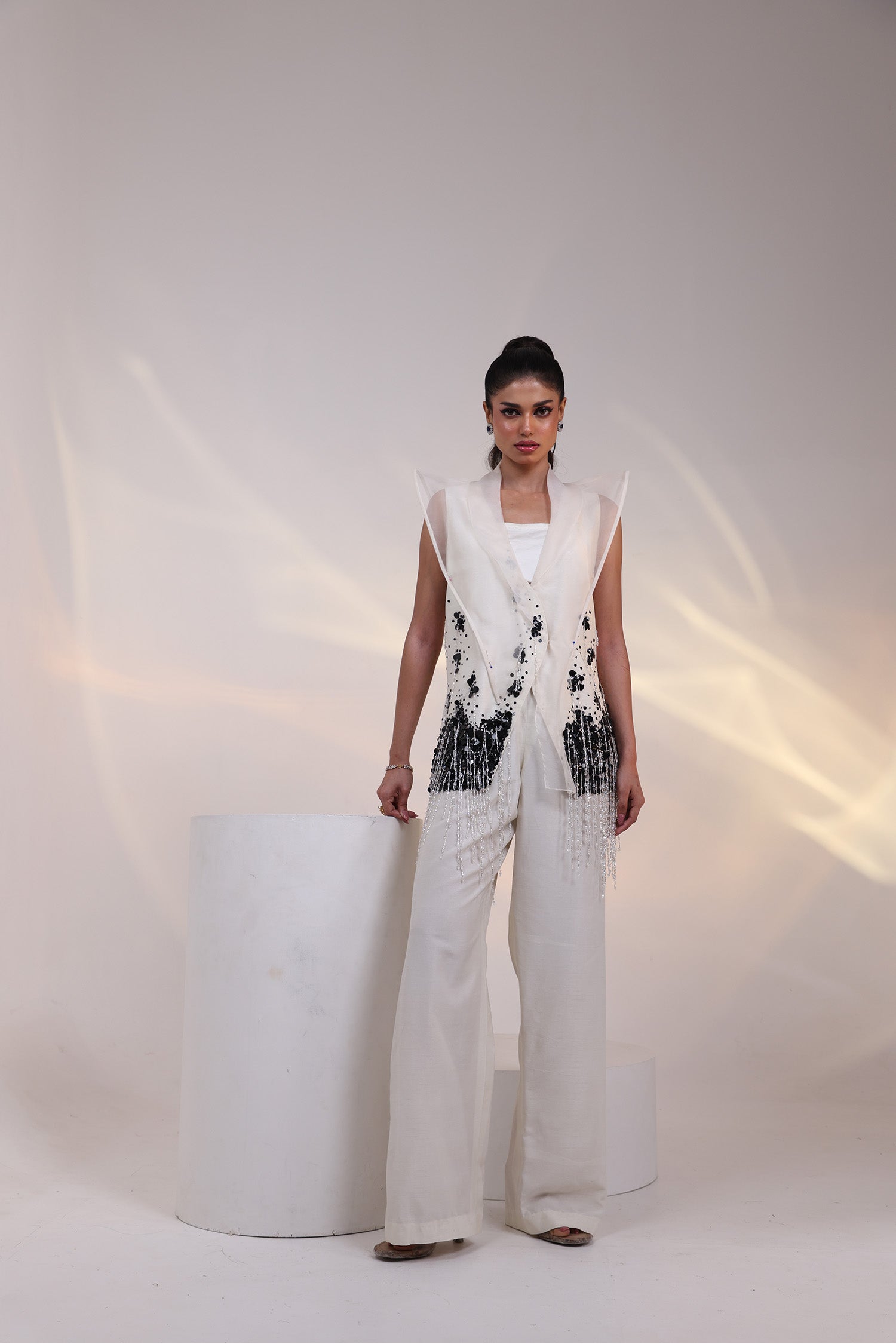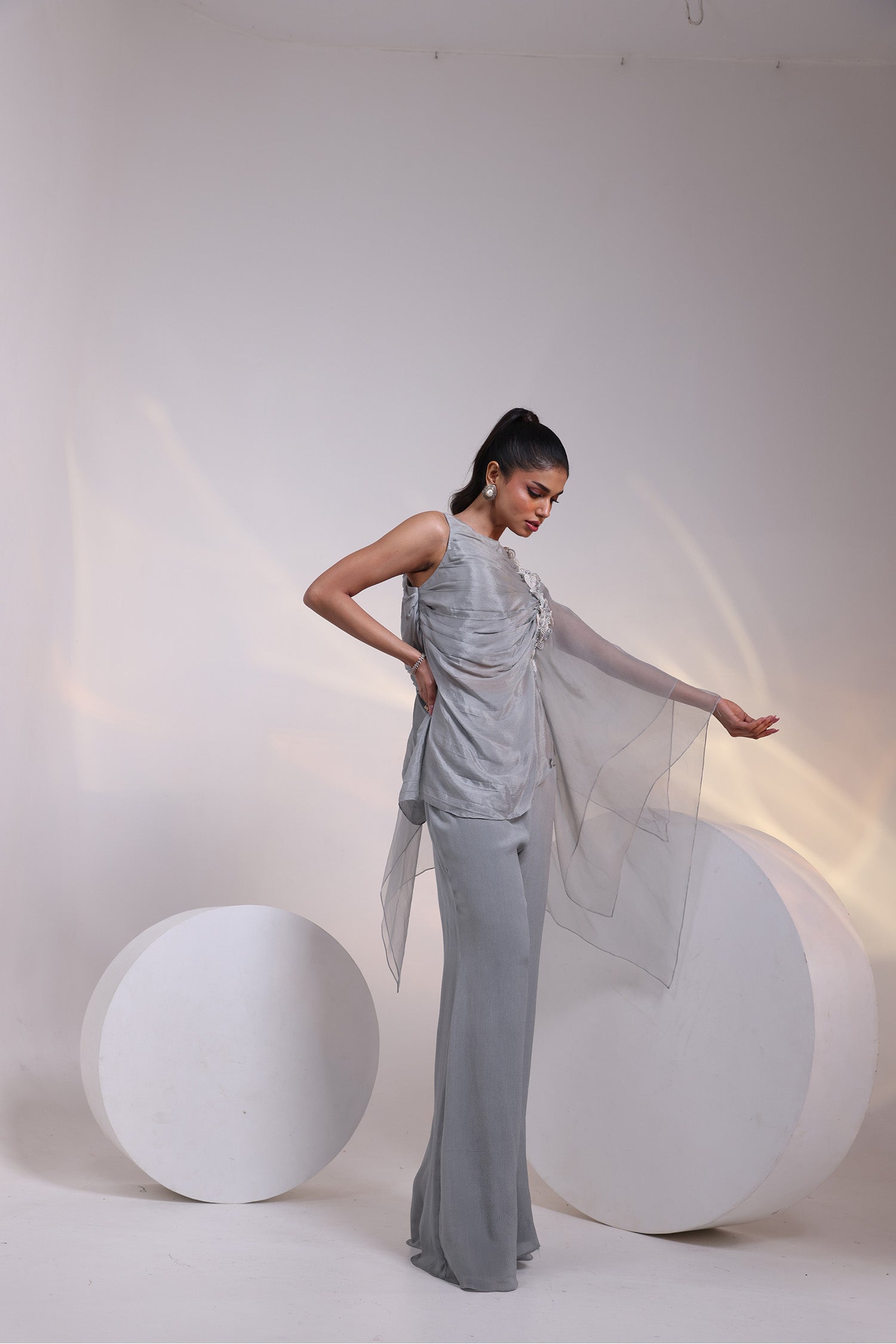 White Embellished Blue Chiffon Drape Skirt and Top Set With Organza Cape