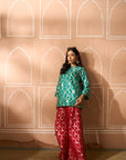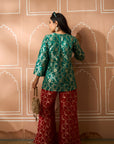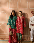 The Banarasi Begum Tunic Set in Pink and Purple is a stunning fusion of tradition and modernity. The rich Banarasi Pant , paired with a flowing Kurta, boasts intricate weaving in vibrant shades of pink and purple, making it perfect for festive occasions. This set exudes royal charm with a contemporary flair, ideal for those who want to stand out with elegance and grace.