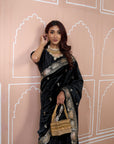 Prepare to bask in the splendor of luxury with our Magnificent Metallic Velvet Gown Saree featuring a captivating metallic palla in black color. Crafted from sumptuous velvet, this gown saree showcases a modern and flattering silhouette, with a deep V-neck that exudes grace and allure. Complementing the gown saree is the Metallic Palla, a luxurious addition that adds an element of glamour to your ensemble. The gown saree's minimalistic design allows for endless possibilities in terms of styling, making it a versatile addition to your wardrobe.