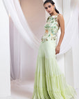 A whimsical two-piece set in light lime green, where forest fables come alive. The structured corset features intricate hand painting of birds, deer, and lush foliage, elevated with fine threadwork and bead embroidery. Paired with softly tiered flared pants detailed with gentle gathers and drawstring accents, the look blends storybook charm with a contemporary silhouette—perfect for daytime celebrations steeped in nature’s spirit.