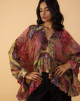 Blouse : Abstract floral print, hand micro pleated v neck, kaftan style blouse with stitch detailing and flared sleeves