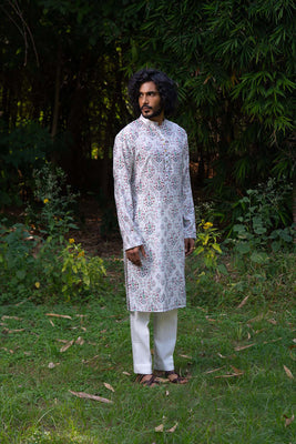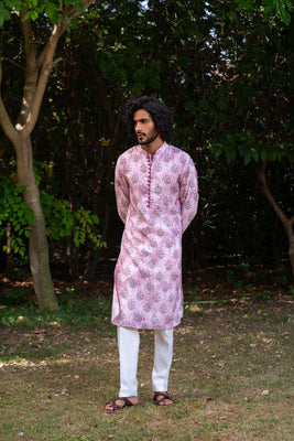 Unleash your inner wild spirit with Jamun Vann a hand-painted watercolor style kurta that features a stunning jungle artwork in the enchanting Jamun color. This masterpiece combines artistic flair with nature's beauty to create an utterly unique and captivating piece of fashion.
