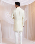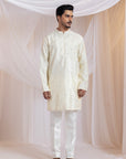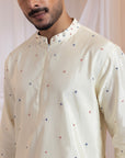A minimal ivory kurta set with fine blue and pink french knot embroidery spread evenly across the surface. Ideal for any light indian occassions. Perfect for cocktails, after parties and any party like occassions.
