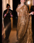 This is a stunning Metallic designer ensemble featuring a heavily embellished sleeveless blouse paired with a matching shimmering skirt