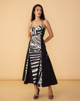 Abstract stripe print dress with fitted bodice, adjustable straps and cross cut flare
