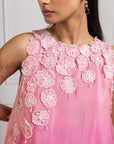 Brighten up your wardrobe with this Rani pink asymmetric set. Featuring intricate floral appliqués on the bodice and a high-low design, it flows effortlessly into a pleated cascade pant that adds a dramatic flair. The lightweight fabric and elegant detailing make this ensemble perfect for daytime festivities, haldi ceremonies, or summer soirées. Radiate charm and confidence in this eye-catching piece.