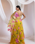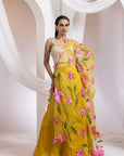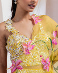 A radiant three-piece lehenga set in deep mustard yellow, perfect for sunlit celebrations. The fitted bodice is richly embellished with sequins, mirror work, and 3D thread-appliqué florals, paired with a softly ruched skirt. Draped over is a one-sided, hand-painted organza overlay with a cutwork edge—adorned with scattered mirrors, sequins, and delicate bead detailing. With its whimsical finishes and forest-inspired flourishes, this look captures the spirit of an enchanted bloom.